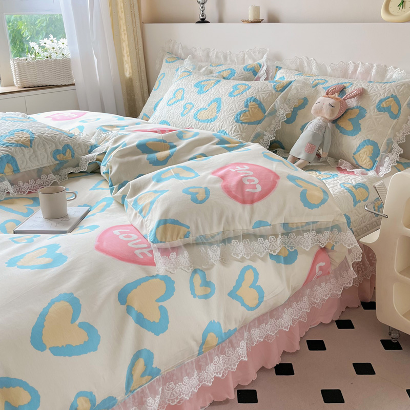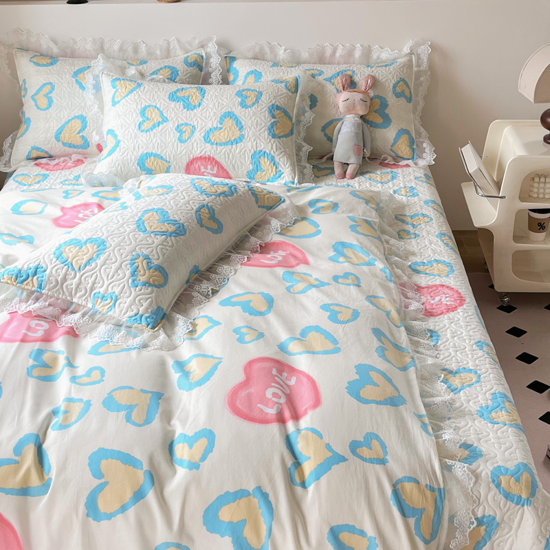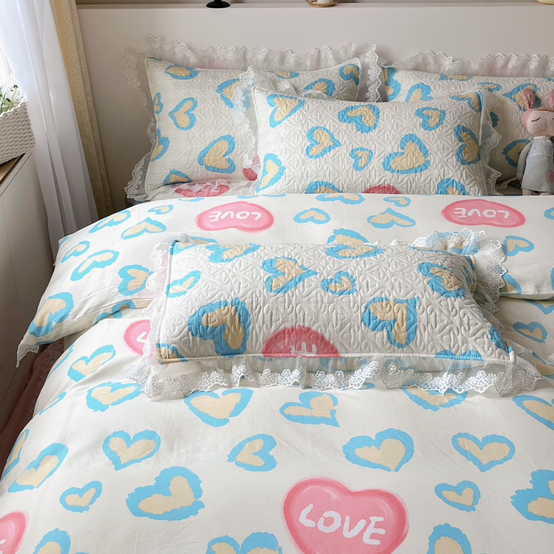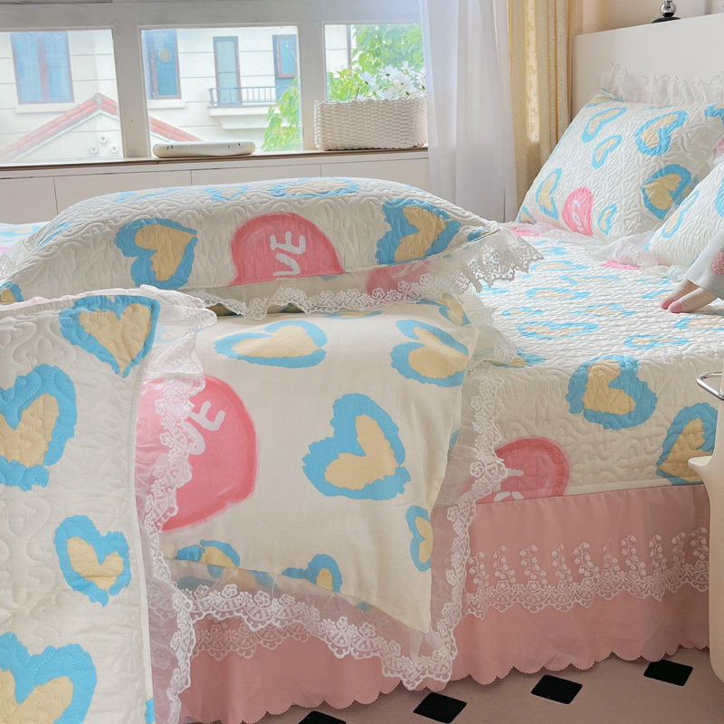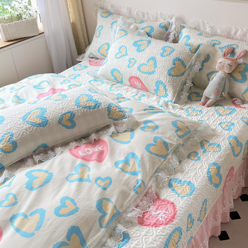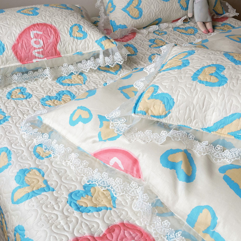 添越2024小清新韩版蕾丝款花边纯棉夹棉床盖三件套全棉天使之心-蕾丝款