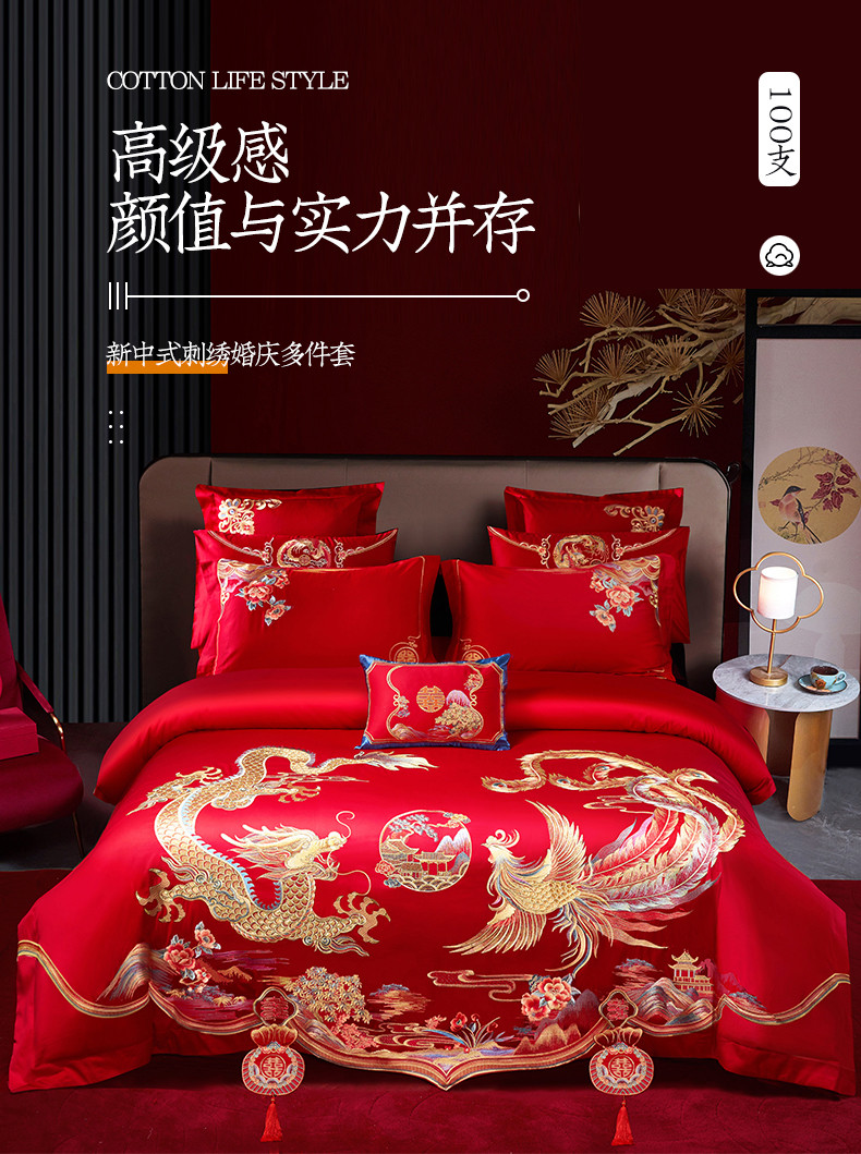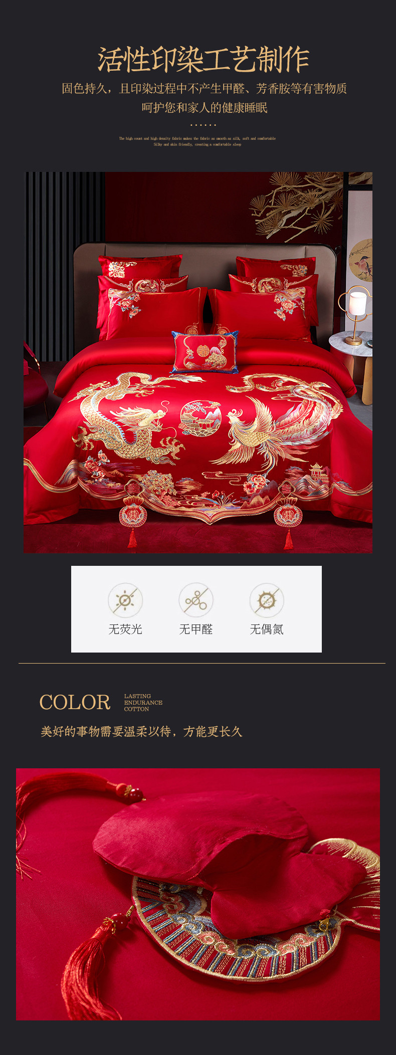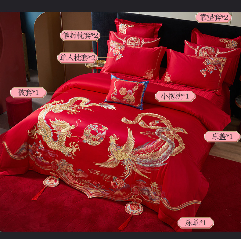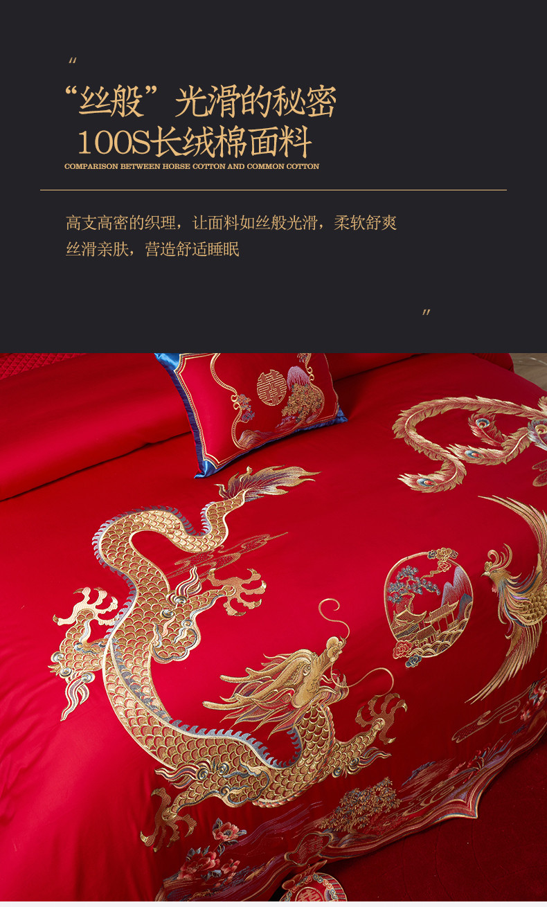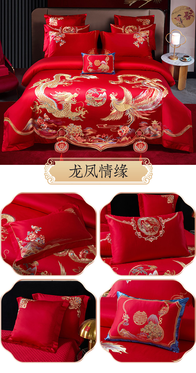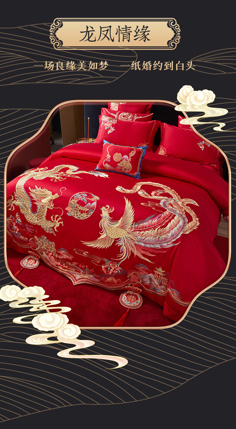 当前位置: 91家纺网 > 商品网购 > 床品套件 > 四件套 > 提花四件套 > 2024新款高支高密纯棉提花长绒棉大红婚庆四件套多件套 龙凤情缘