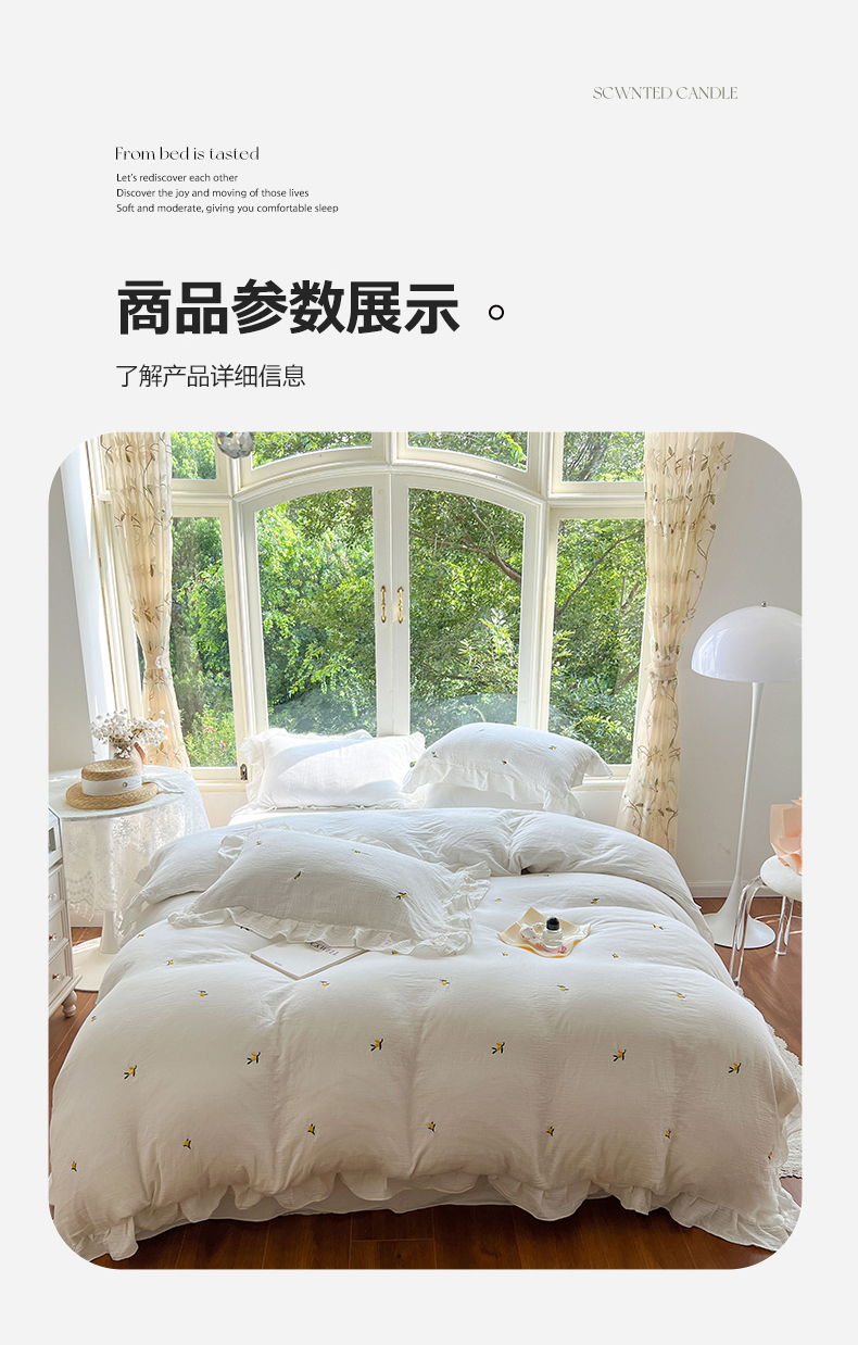 商品名称:木楌家居 2024秋冬全棉皱皱纱荷叶边刺绣工艺款四件套 知梦