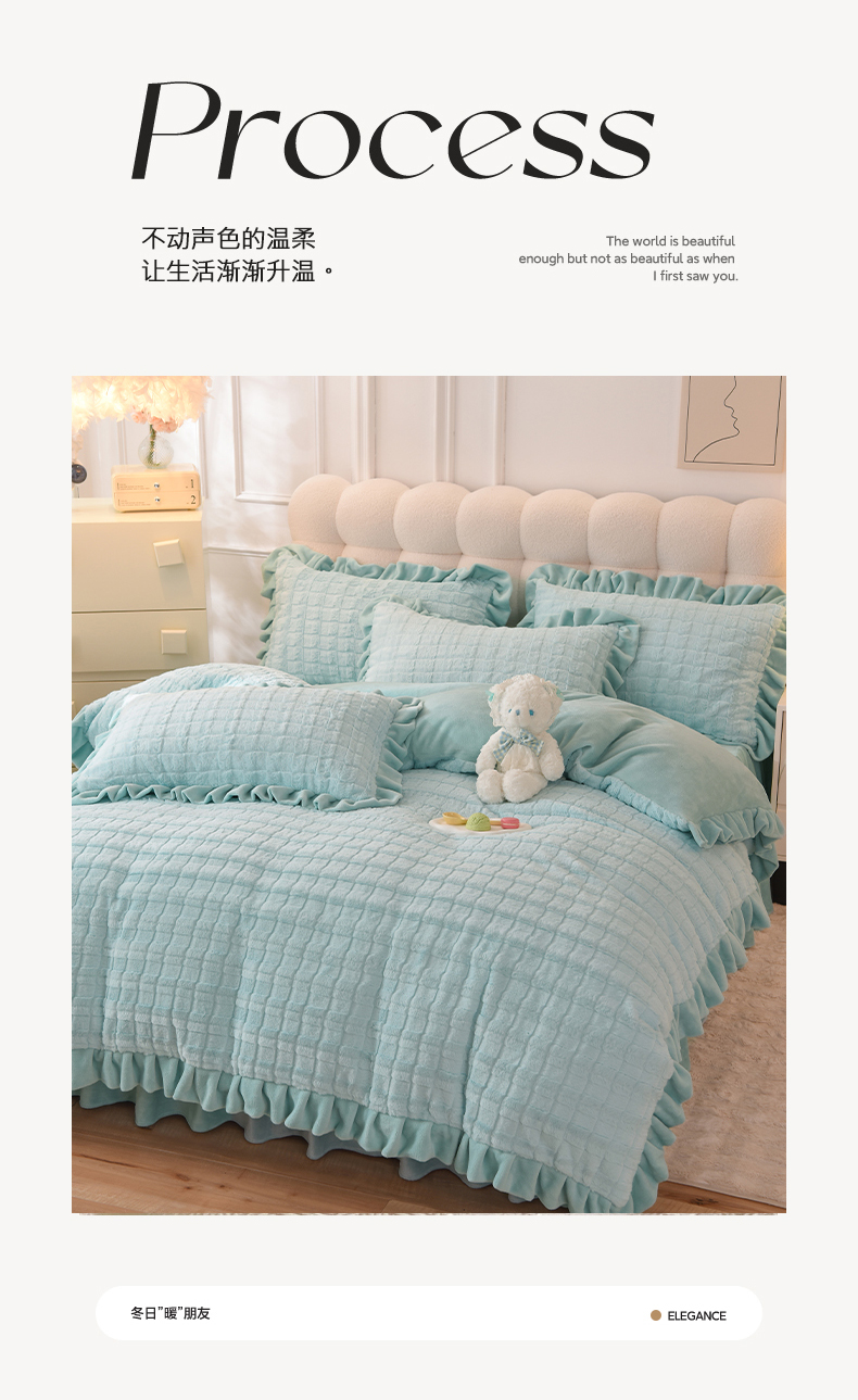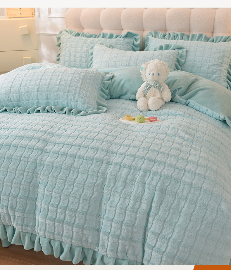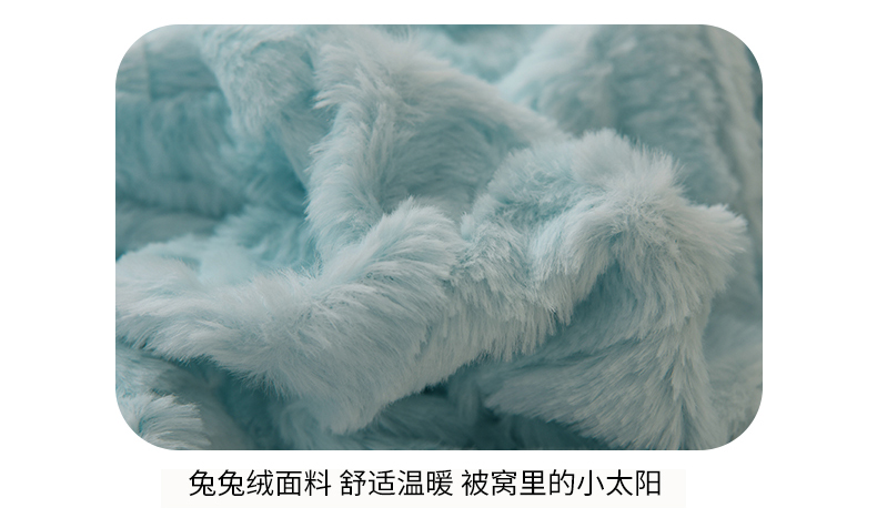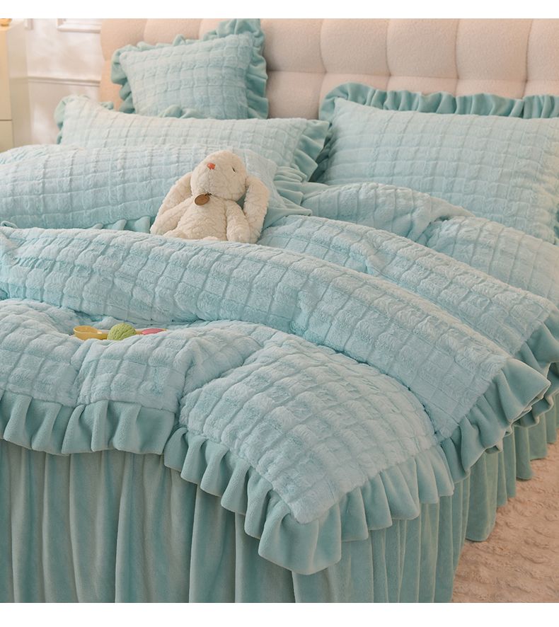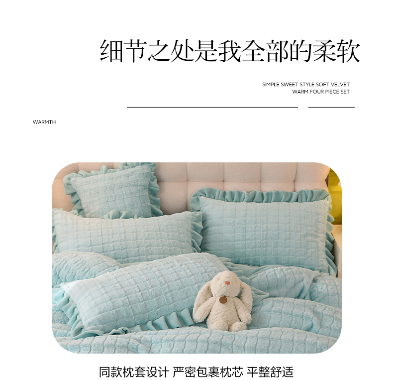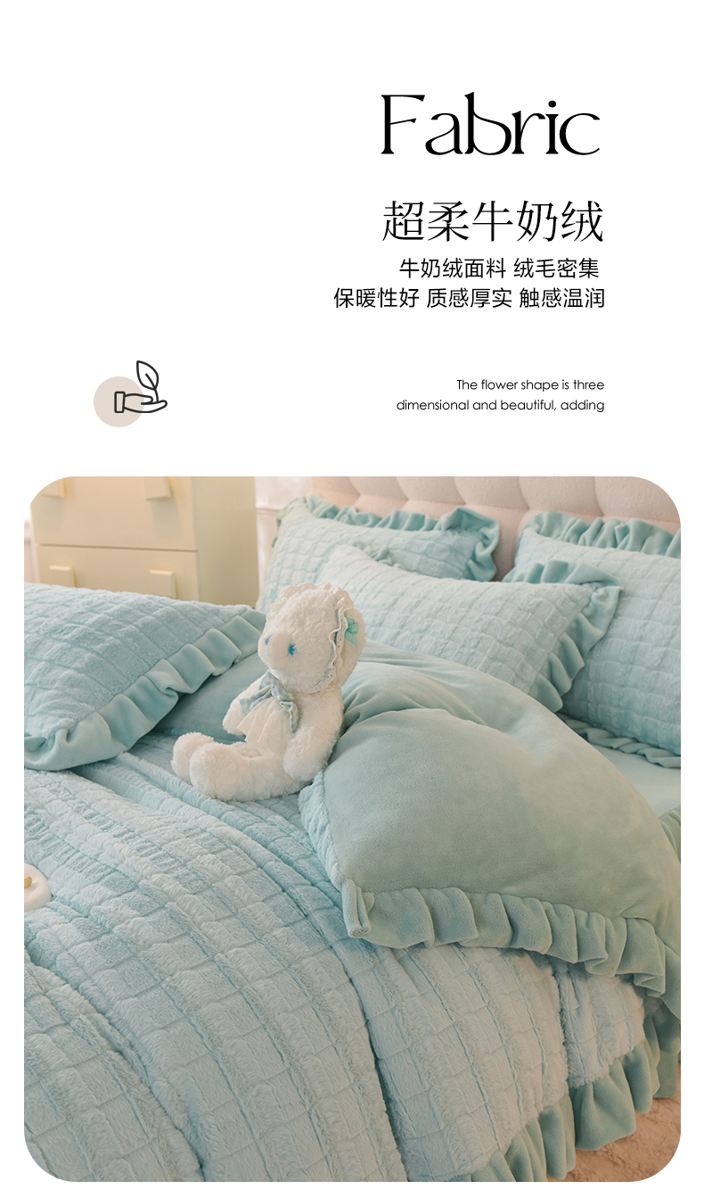 当前位置: 91家纺网 > 商品网购 > 床品套件 > 四件套 > 兔毛绒四件套 > 韩约家纺 2023新款1母婴级兔兔绒牛奶绒韩版四件套-床裙款 依恋(水兰)