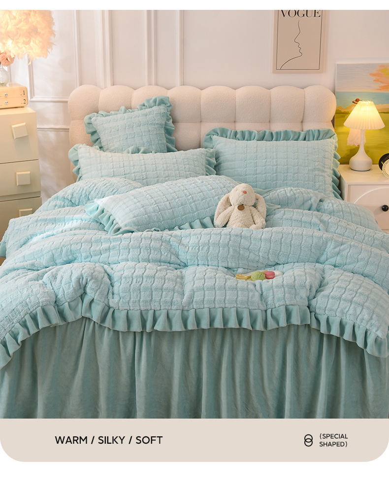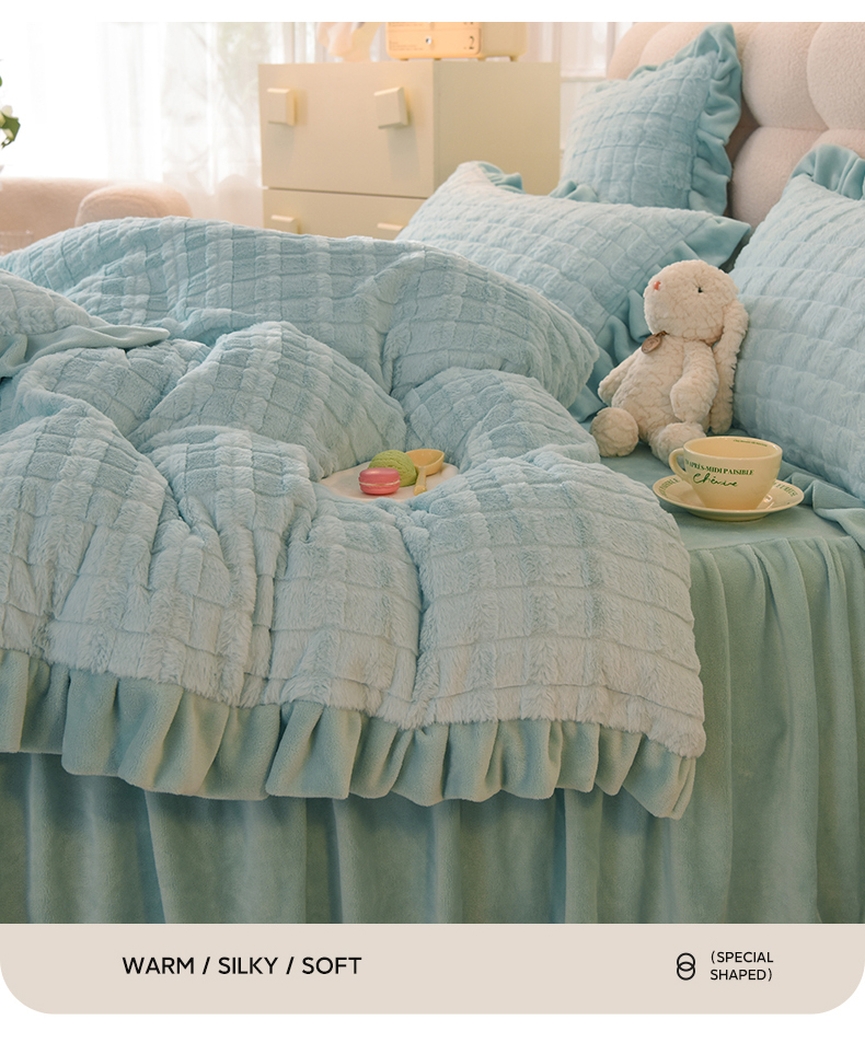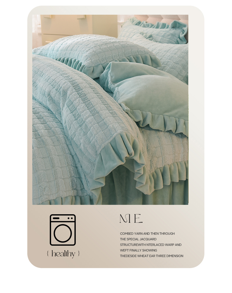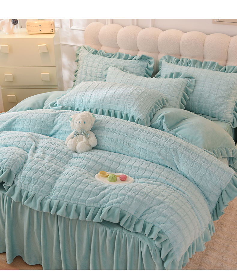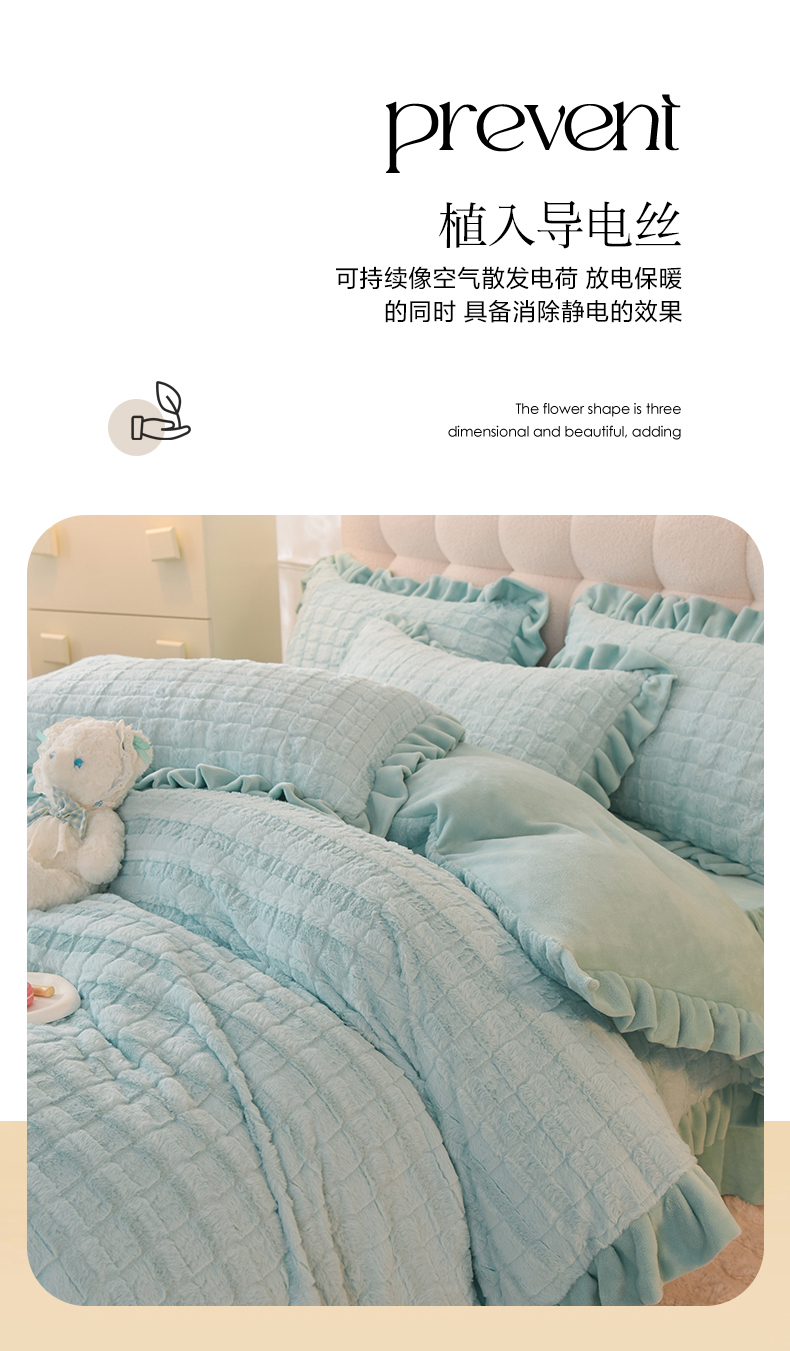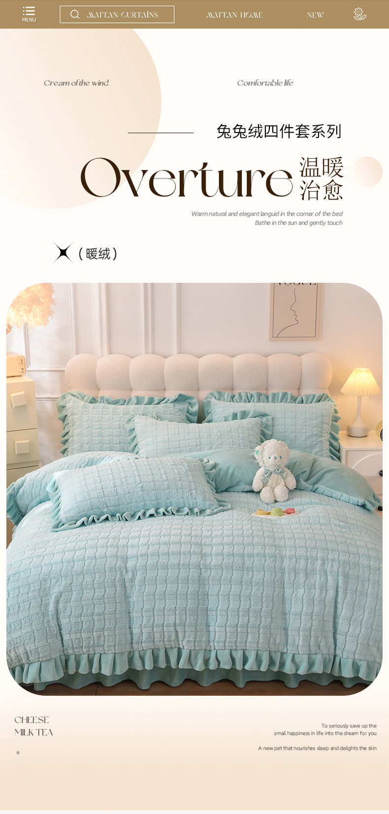 当前位置: 91家纺网 > 商品网购 > 床品套件 > 四件套 > 兔毛绒四件套 > 韩约家纺 2023新款1母婴级兔兔绒牛奶绒韩版四件套-床裙款 依恋(水兰)