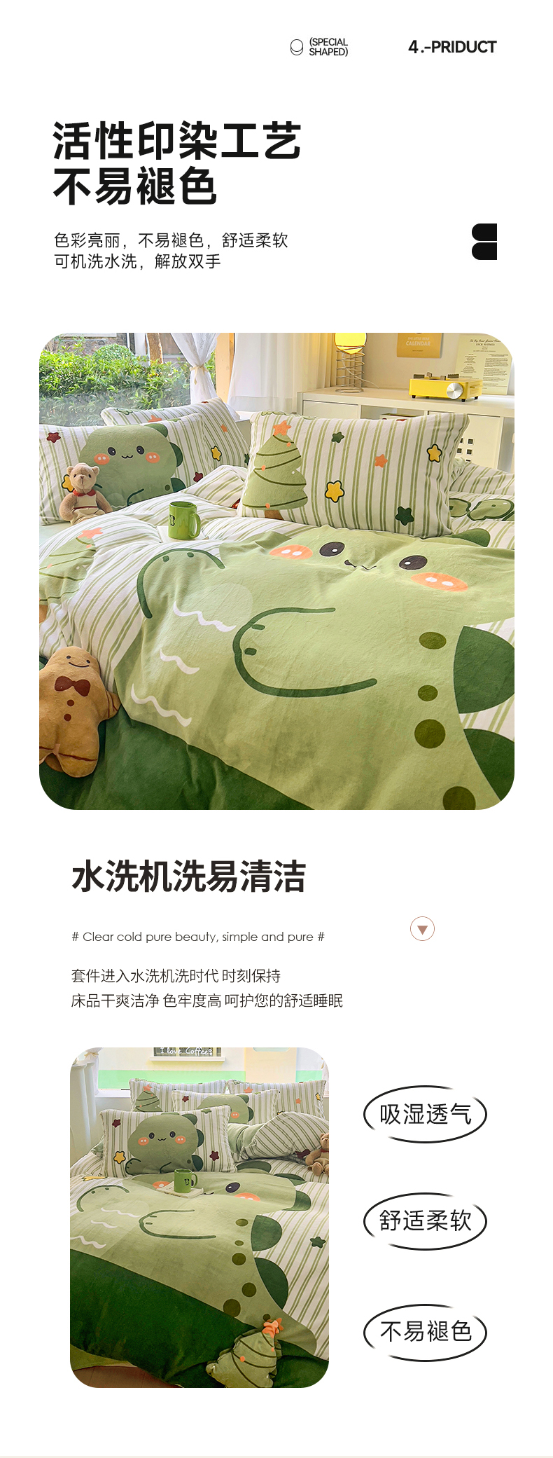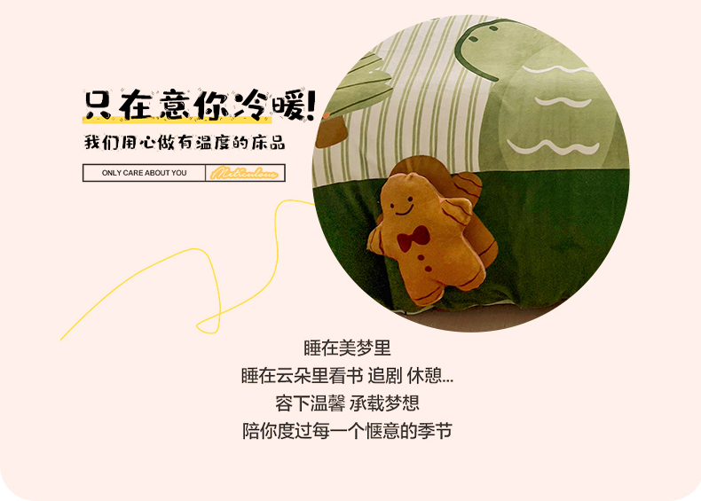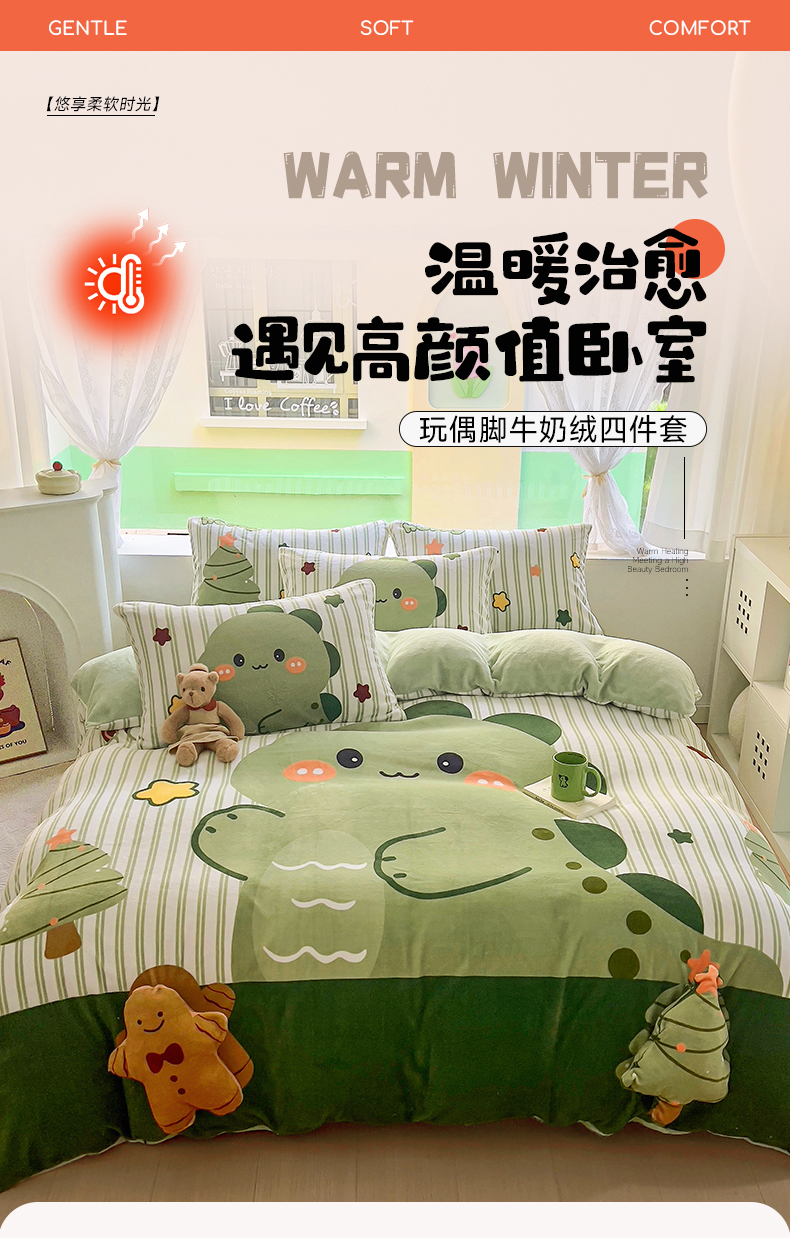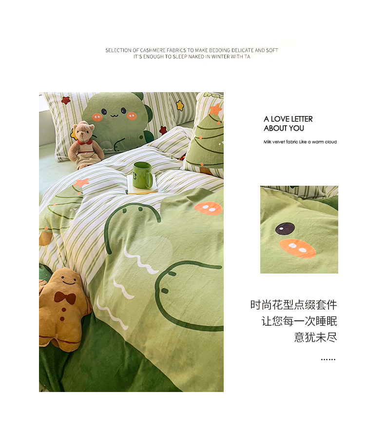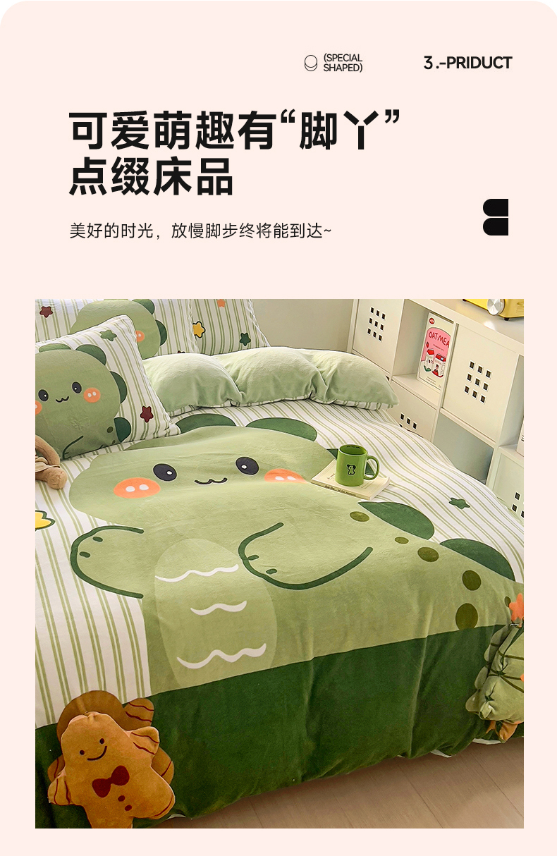 商品名称:川悦生活 2023新款大版牛奶绒卡通玩偶脚工艺款四件套 姜饼恐龙