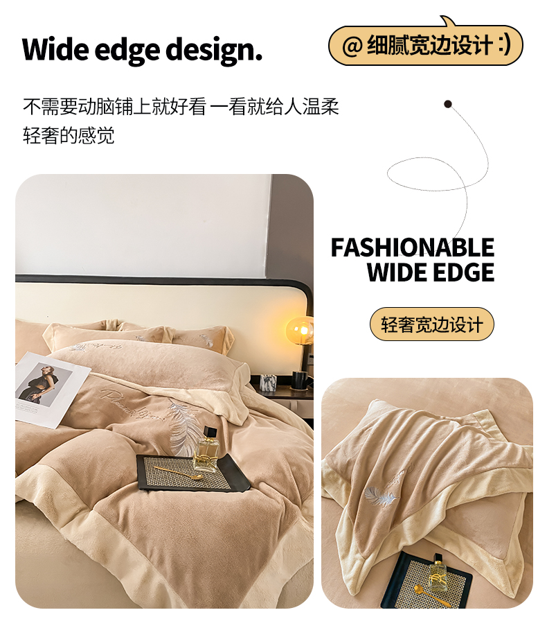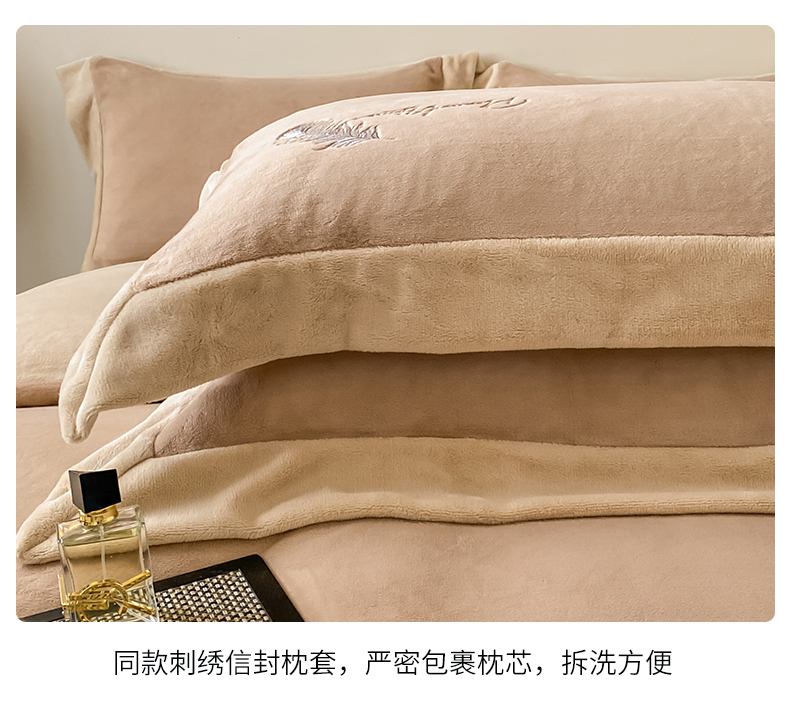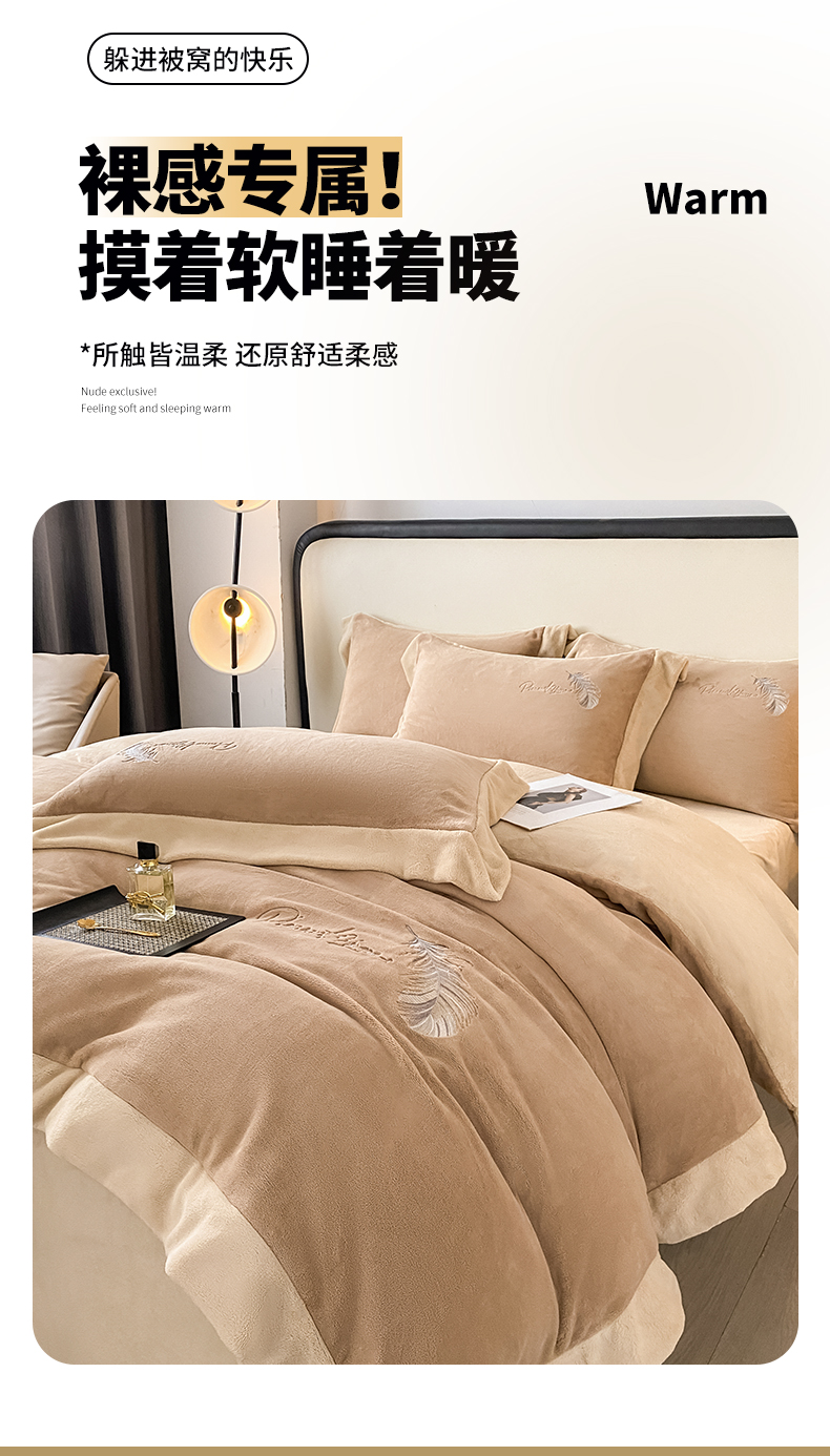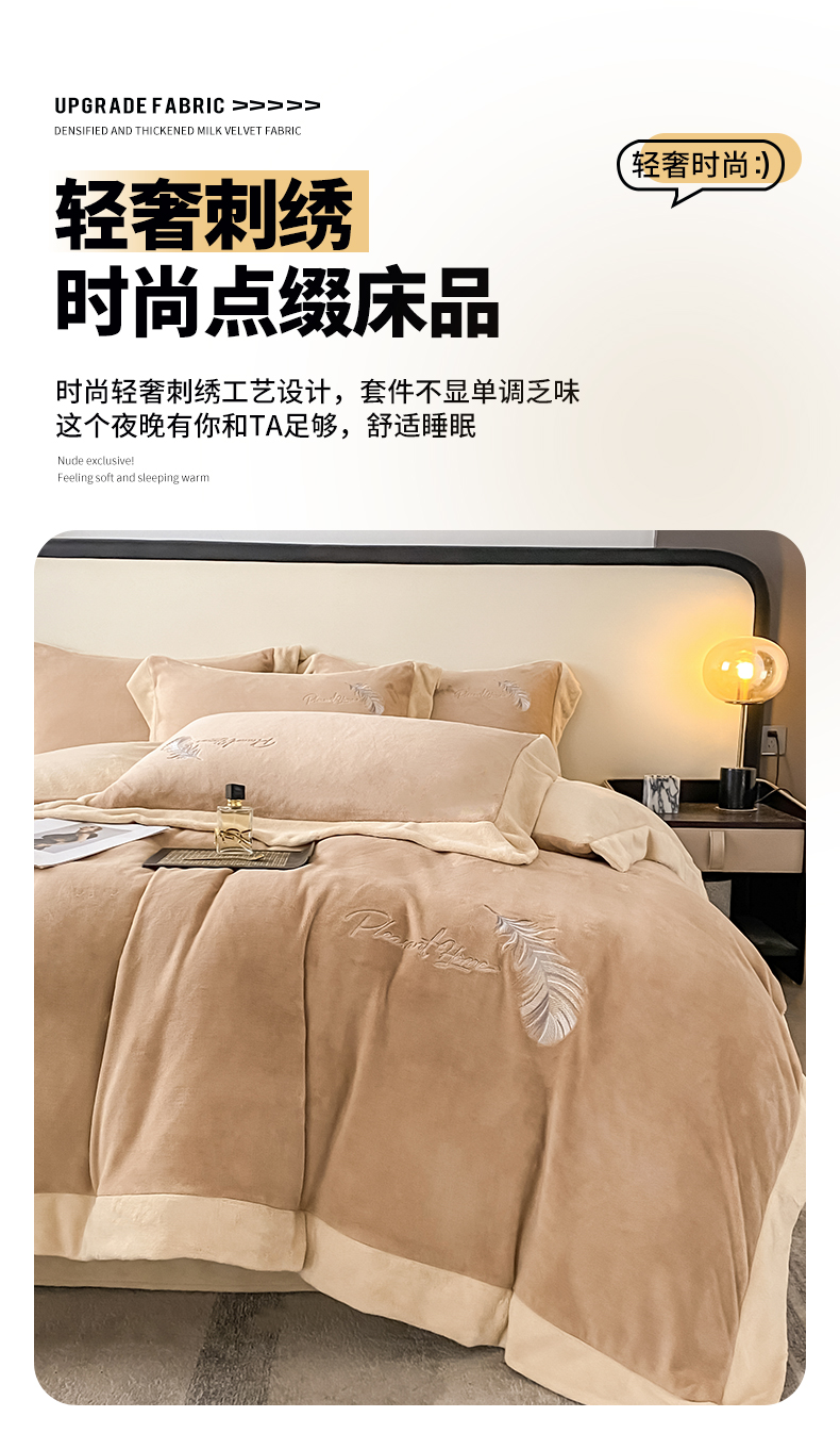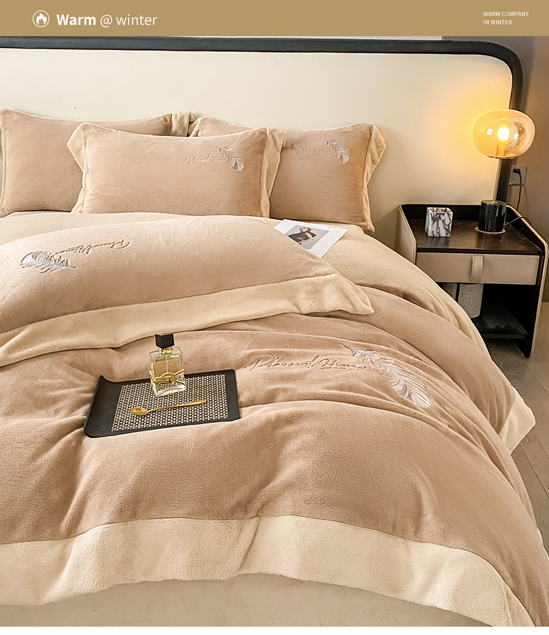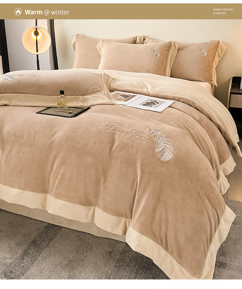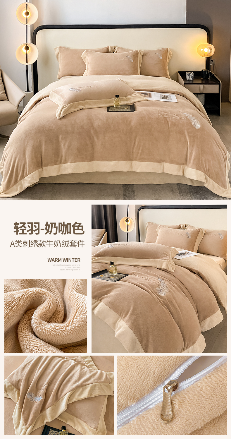 露梦家纺 2025新款加厚保暖牛奶绒刺绣款四件套-轻羽(风格二) 轻羽-奶咖色