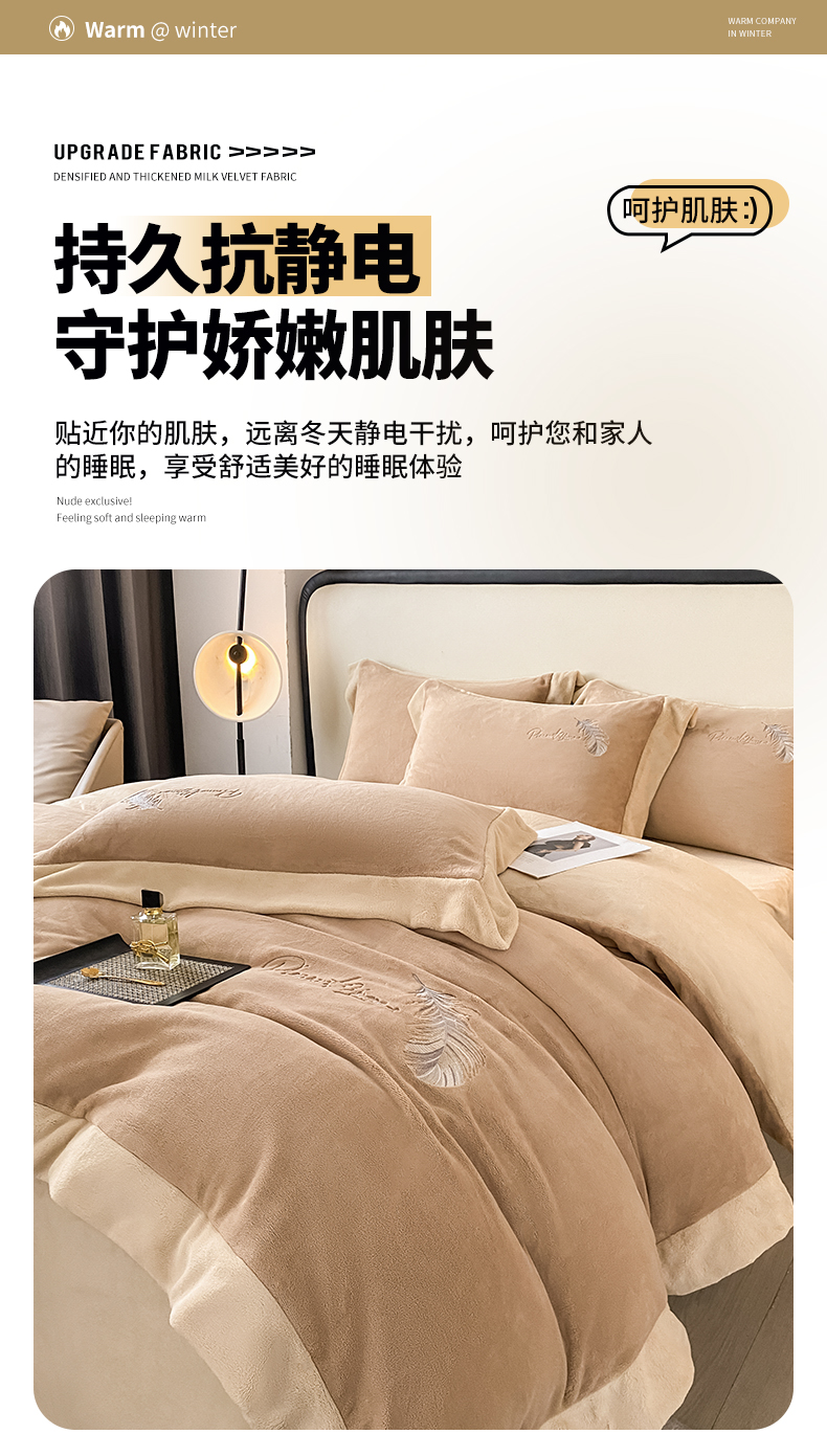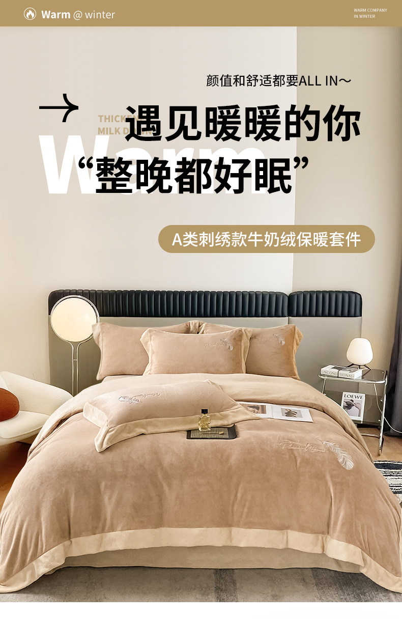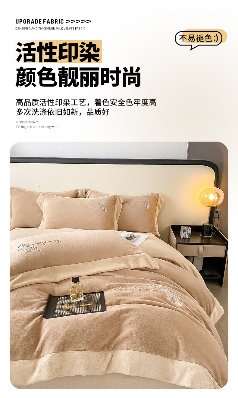 商品名称:露梦家纺 2025新款加厚保暖牛奶绒刺绣款四件套-轻羽(风格二) 轻羽-奶咖色