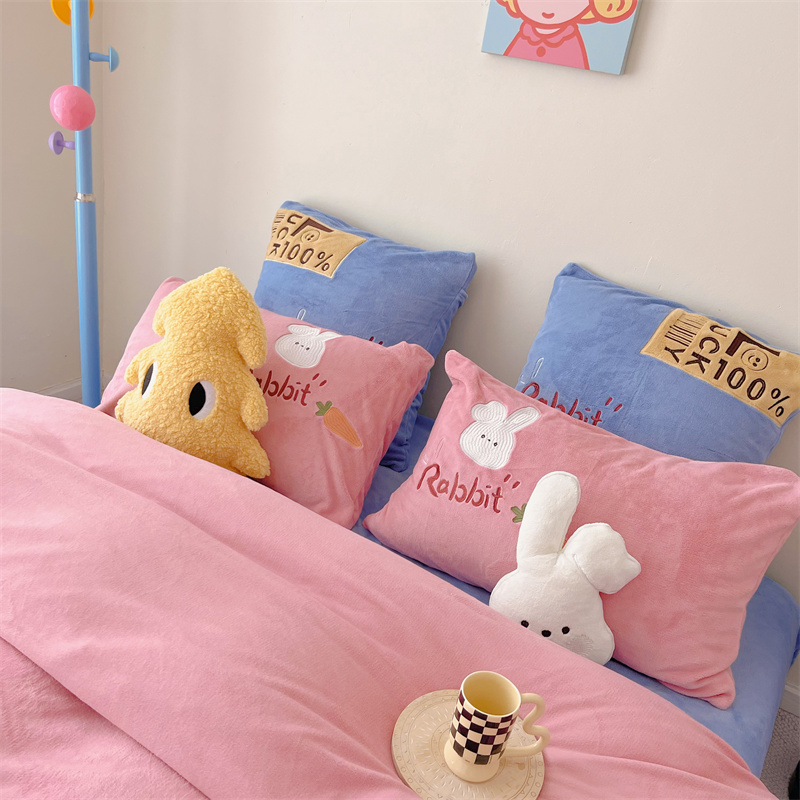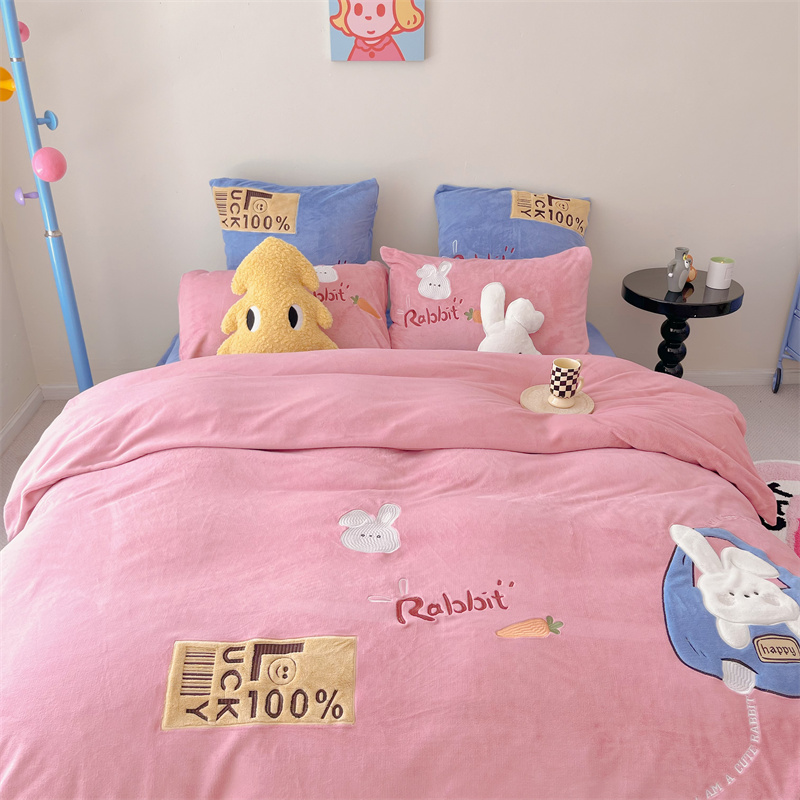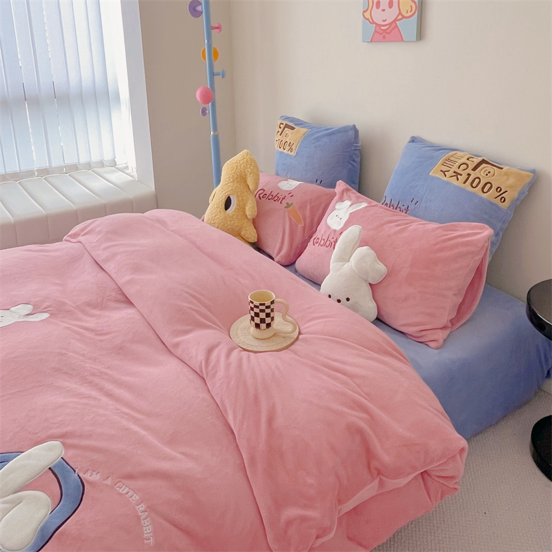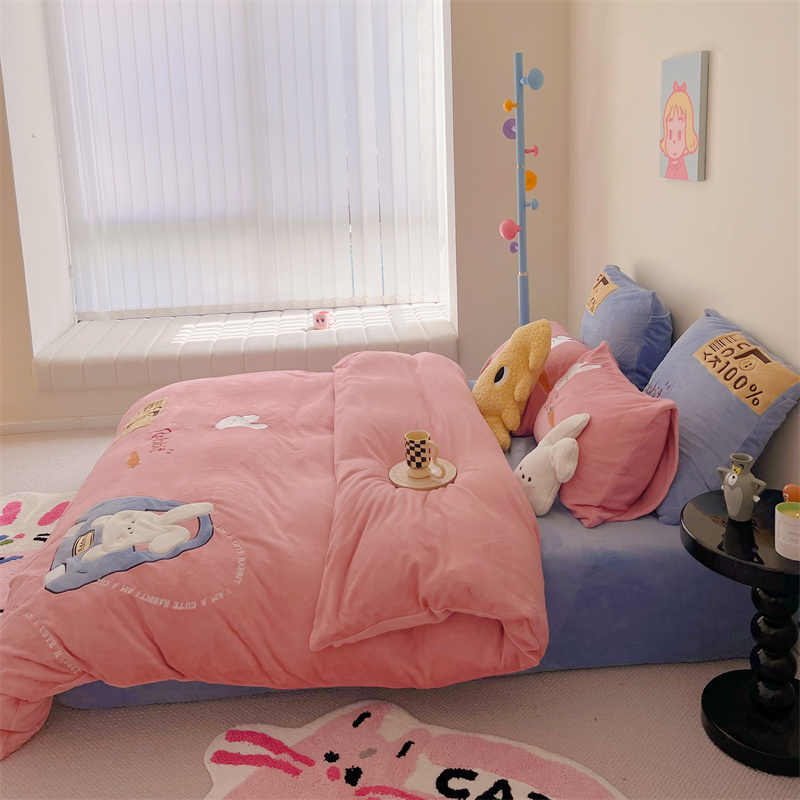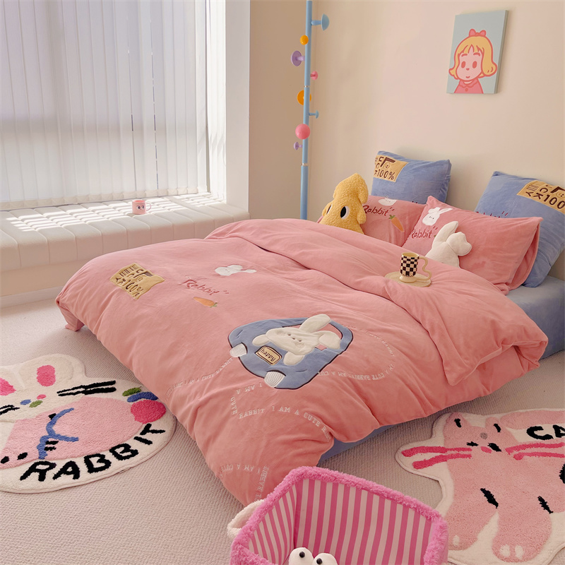 (总)星野 2025新款高克重牛奶绒贴布绣四件套-波点兔,波点兔