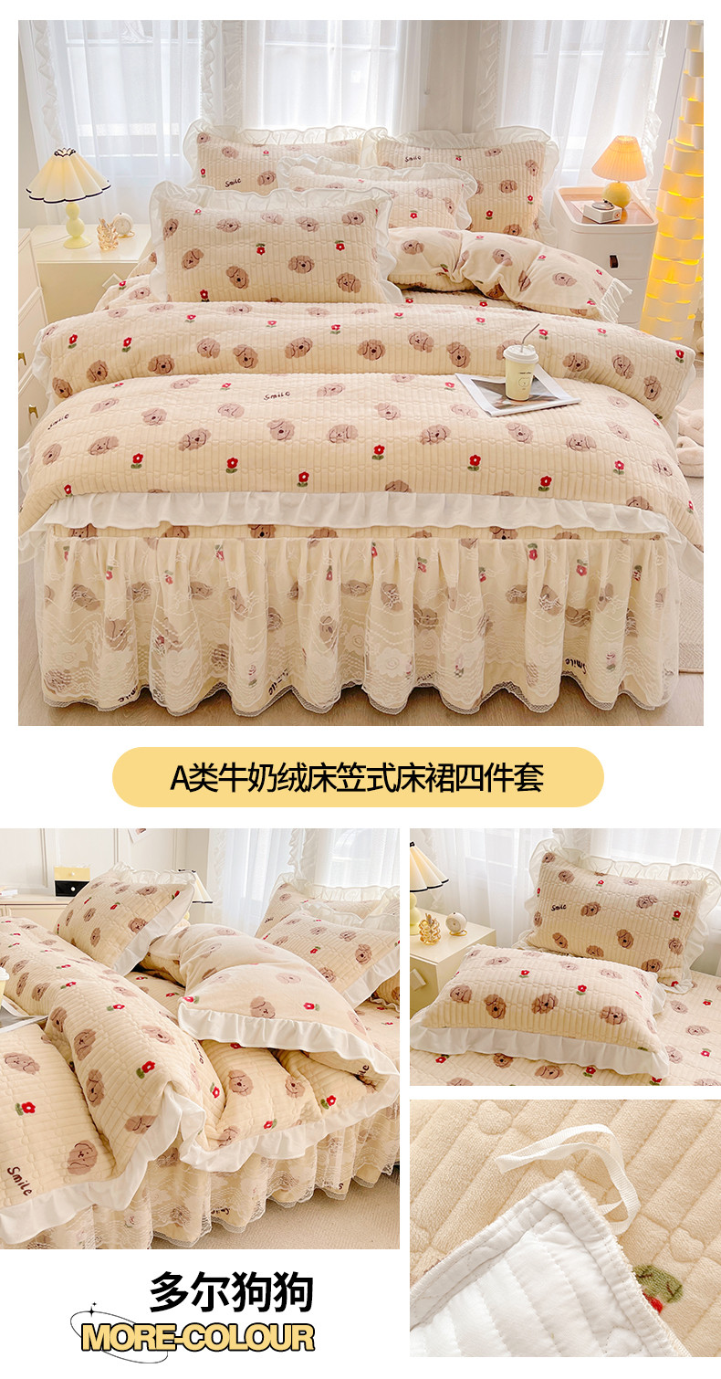当前位置: 91家纺网 > 商品网购 > 床品套件 > 四件套 > 牛奶绒四件套 > 宜凡家纺 2023新款牛奶绒印花夹棉被套床笠式床裙四件套 多尔狗狗