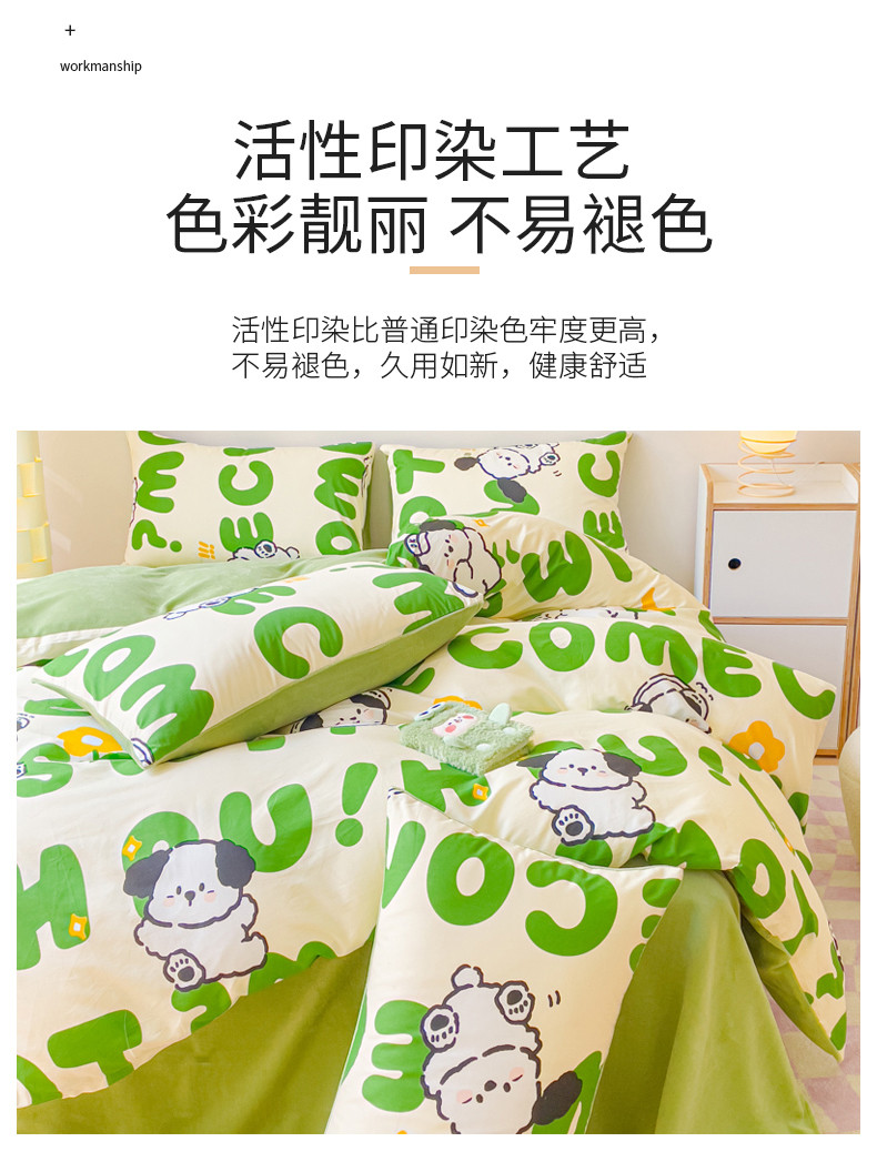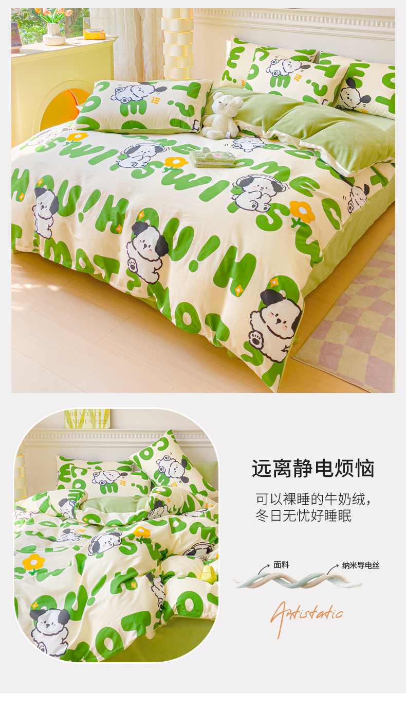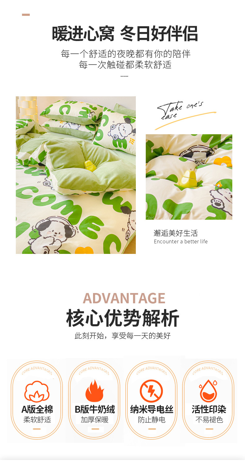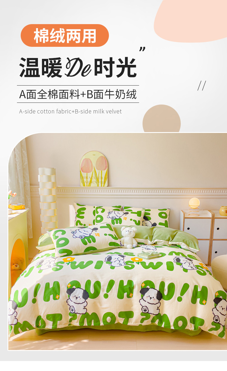 当前位置: 91家纺网 > 商品网购 > 床品套件 > 四件套 > 牛奶绒四件套 > 金丝鸟家纺 2023新款全棉印花加牛奶绒四件套 乐乐狗 a棉b牛奶绒