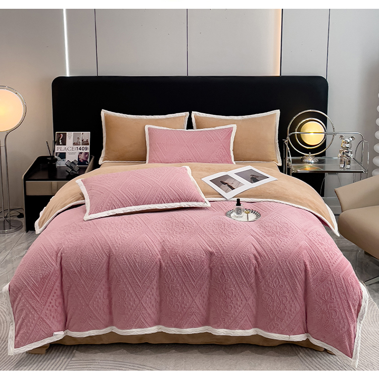 商品名称:金米诺 2024直播爆款轻奢宽边纯色立体雕花牛奶绒四件套 豆沙