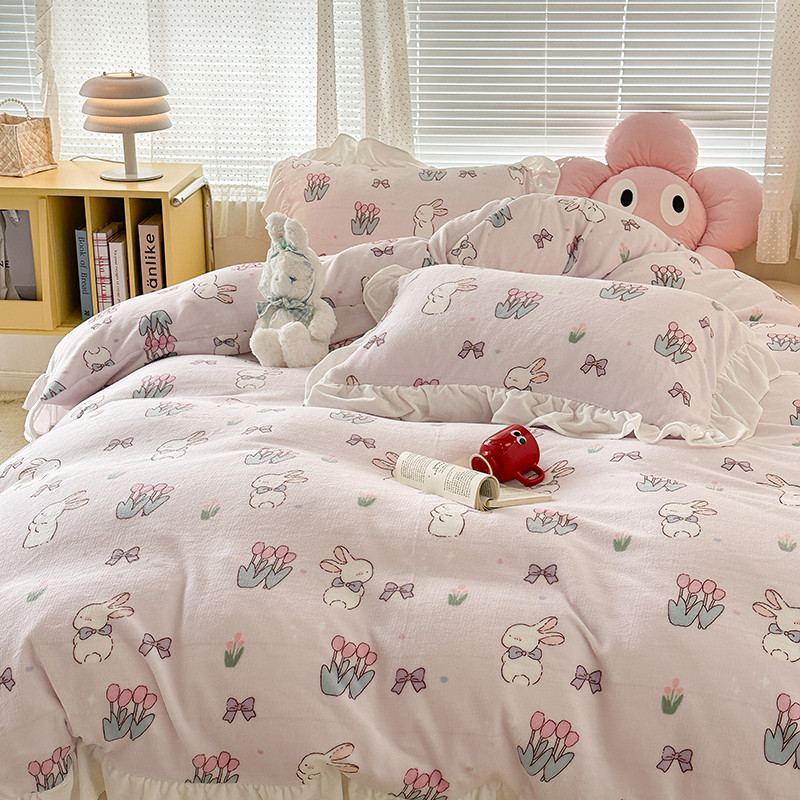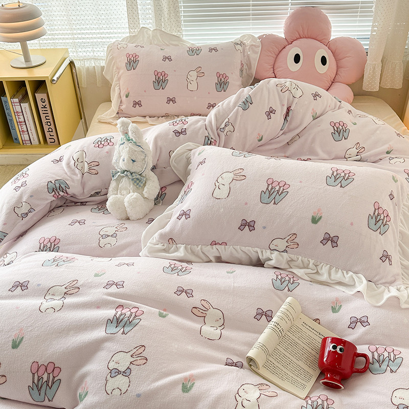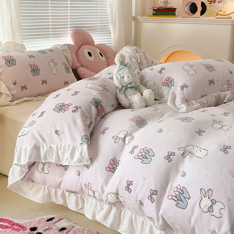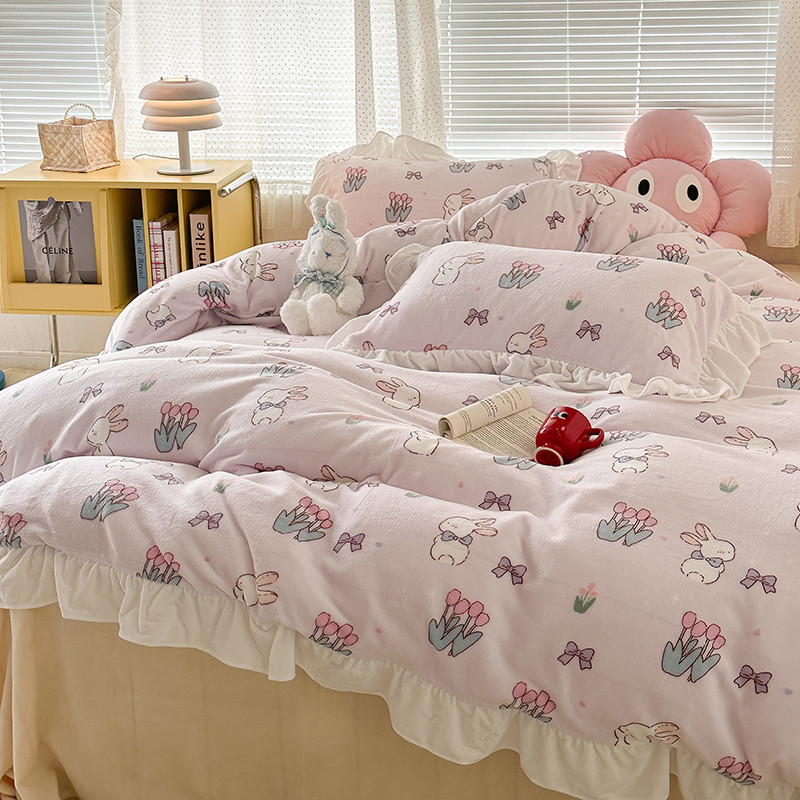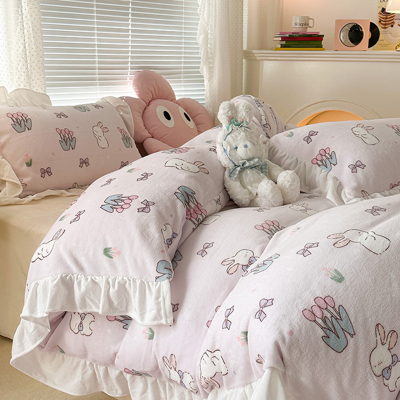 昔可 2023新款韩系ins花边款牛奶绒四件套 萌萌粉底郁金香兔