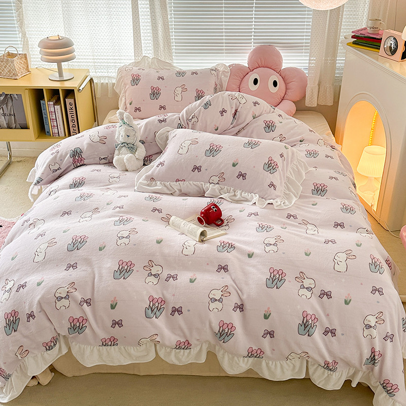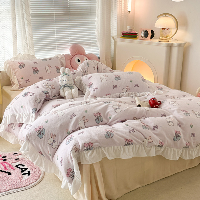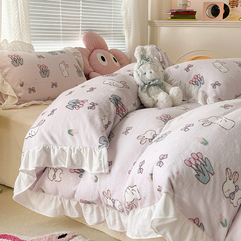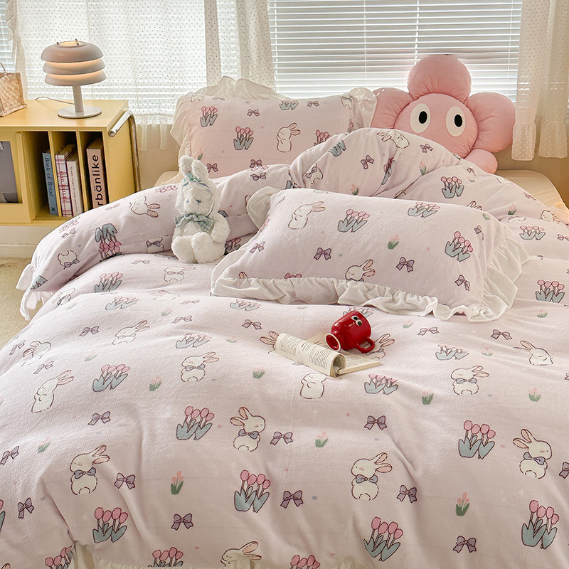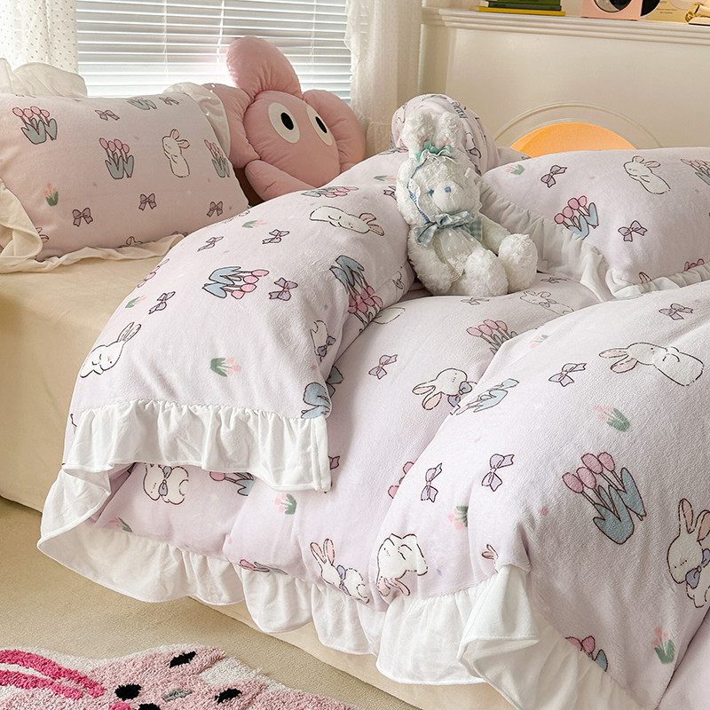 昔可 2023新款韩系ins花边款牛奶绒四件套 萌萌粉底郁金香兔