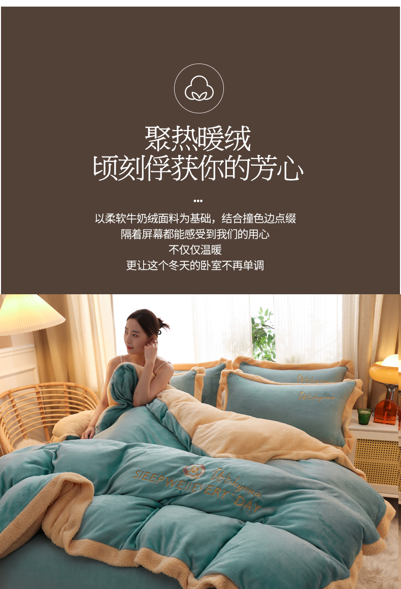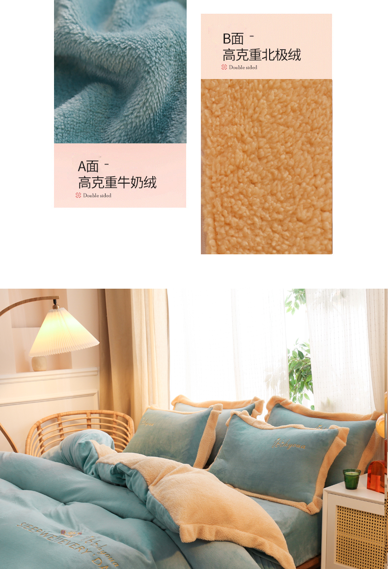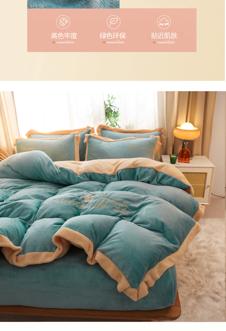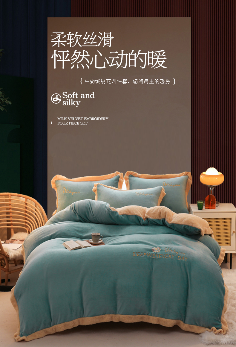 当前位置: 91家纺网 > 商品网购 > 床品套件 > 四件套 > 牛奶绒四件套 > 啊雅家居 2026新款绣花牛奶绒加羊羔绒四件套 水绿加米黄