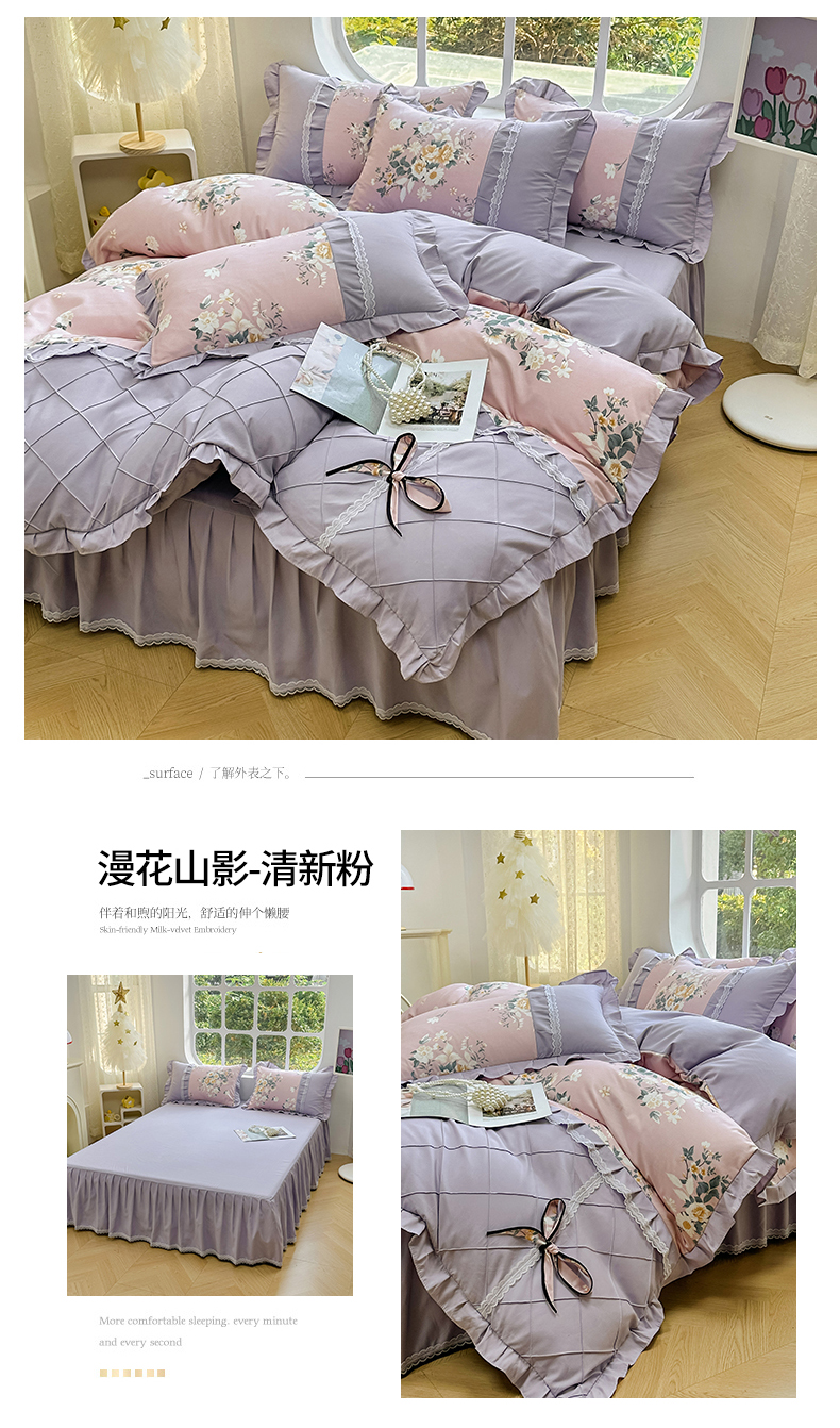 商品名称:金米诺 2024新款蝴蝶结韩版蕾丝花边床裙四件套 漫花山影-清新粉