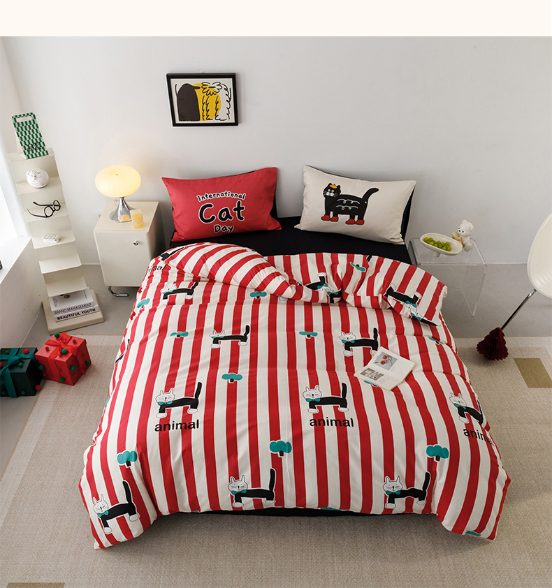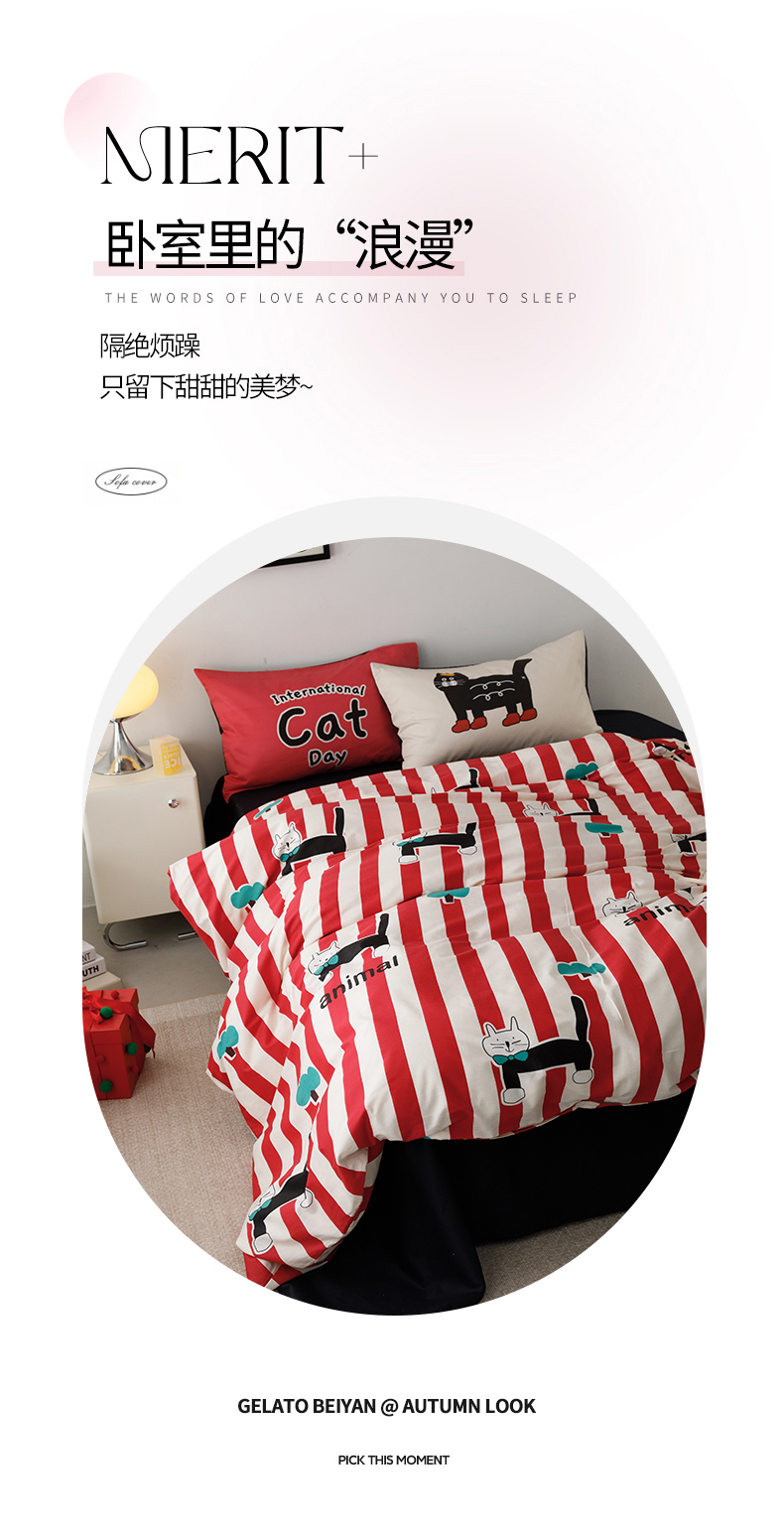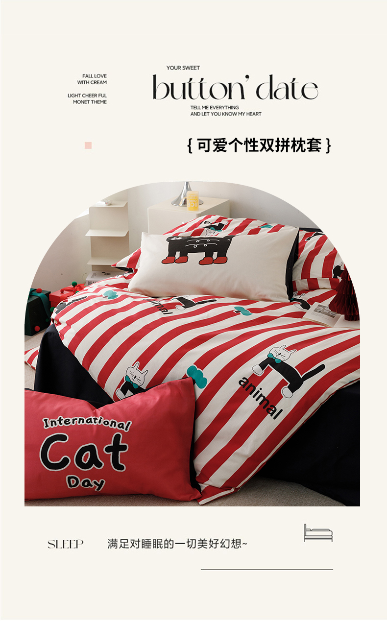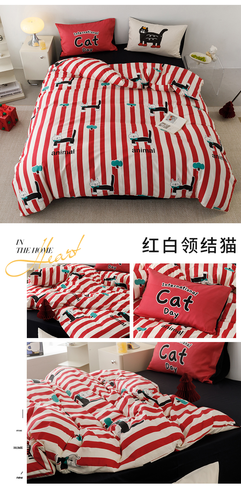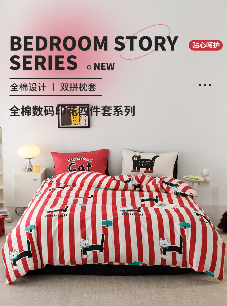 珺柔家纺 2024年款13070全棉数码印花四件套 红白领结猫