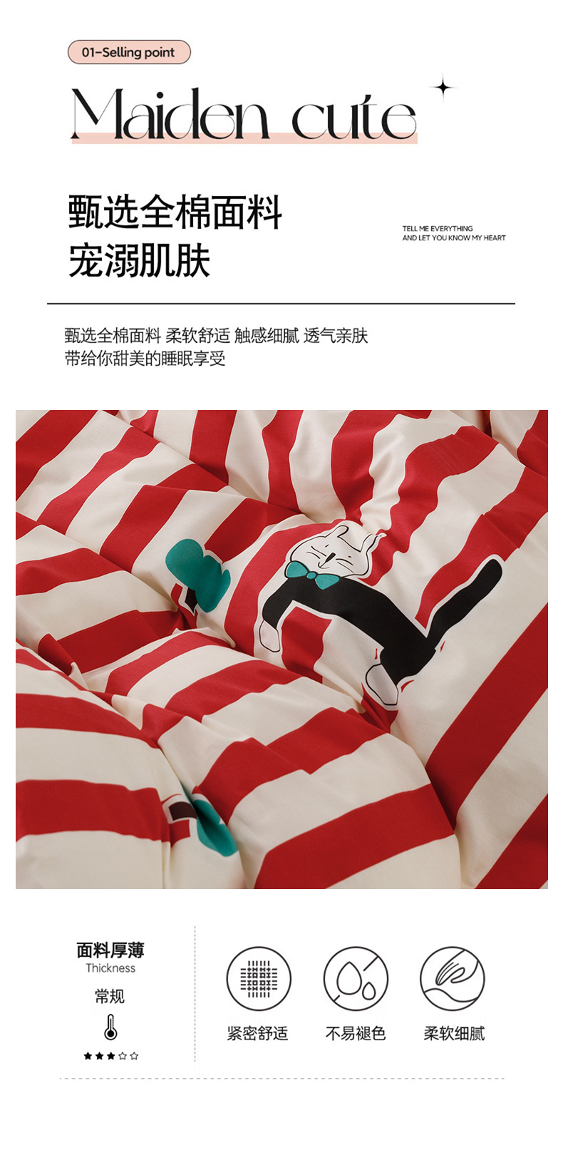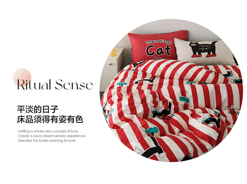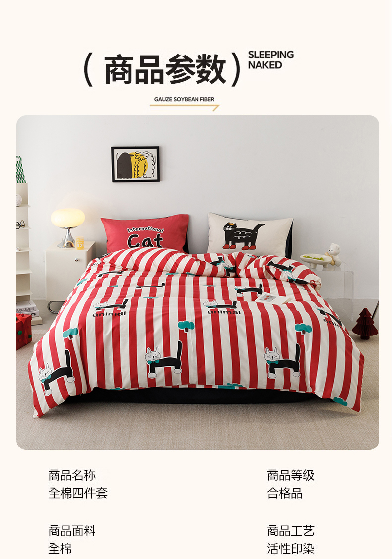 商品名称:珺柔家纺 2024年款13070全棉数码印花四件套 红白领结猫