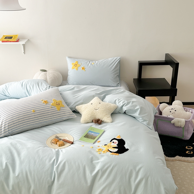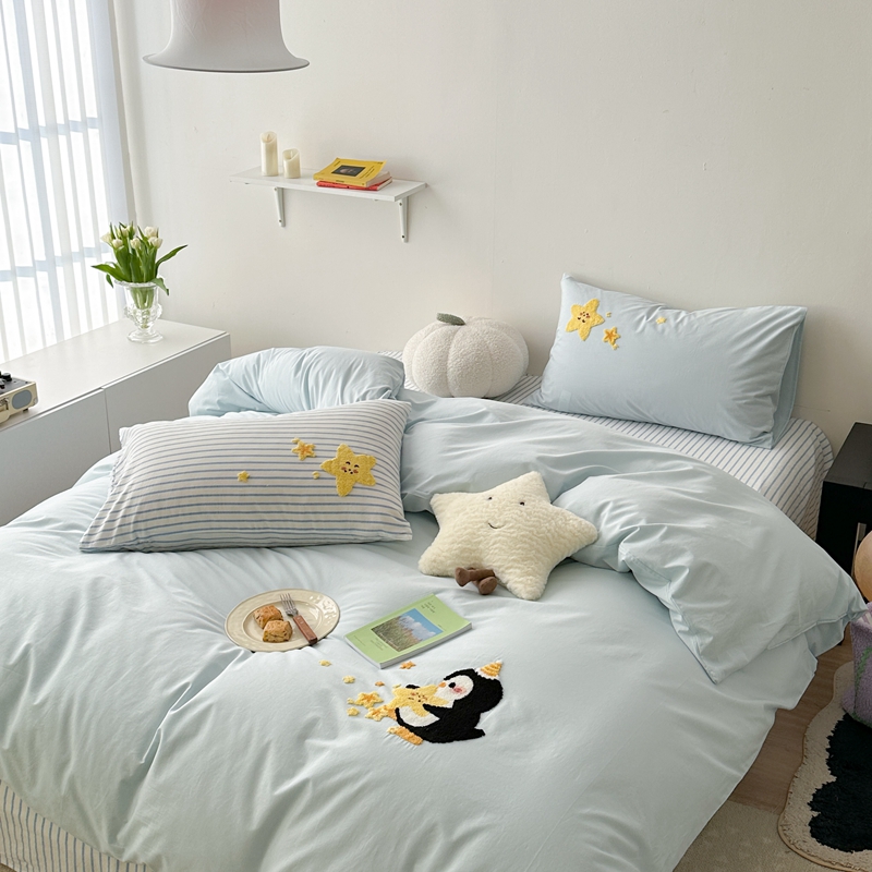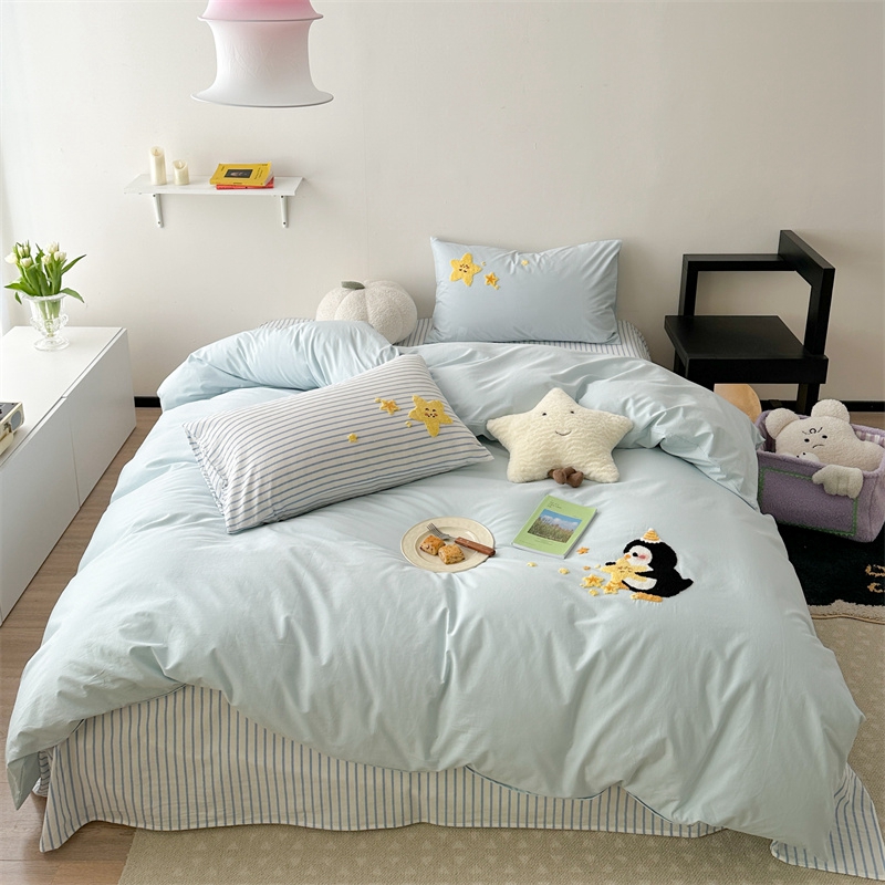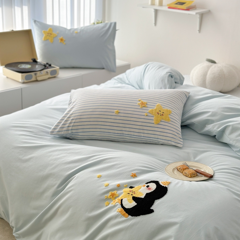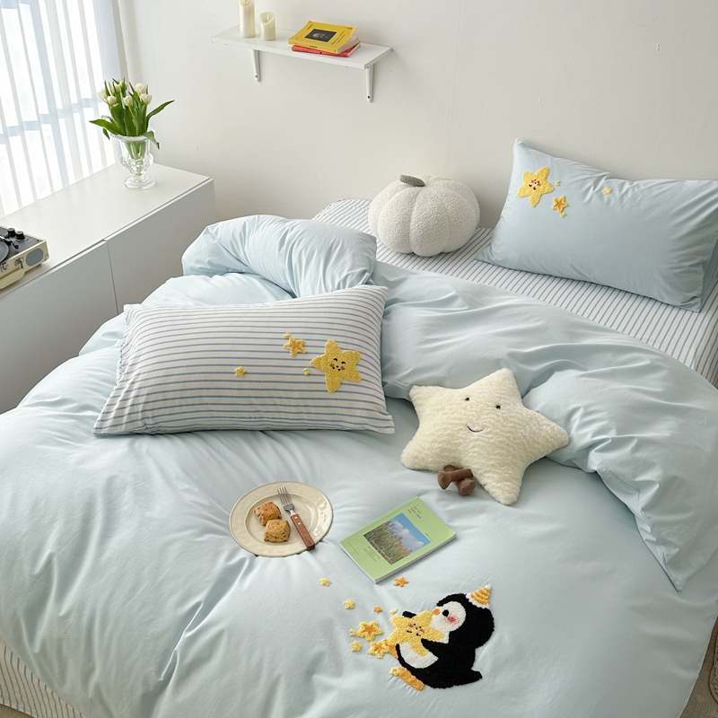 柚子YOUTH 2024新款全棉水洗棉条纹毛巾绣四件套 企鹅抱抱