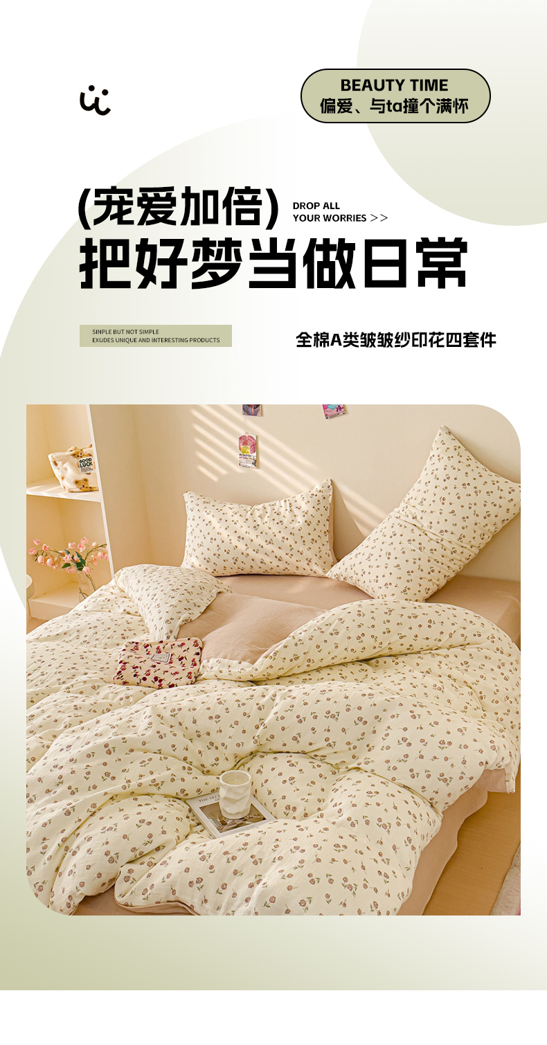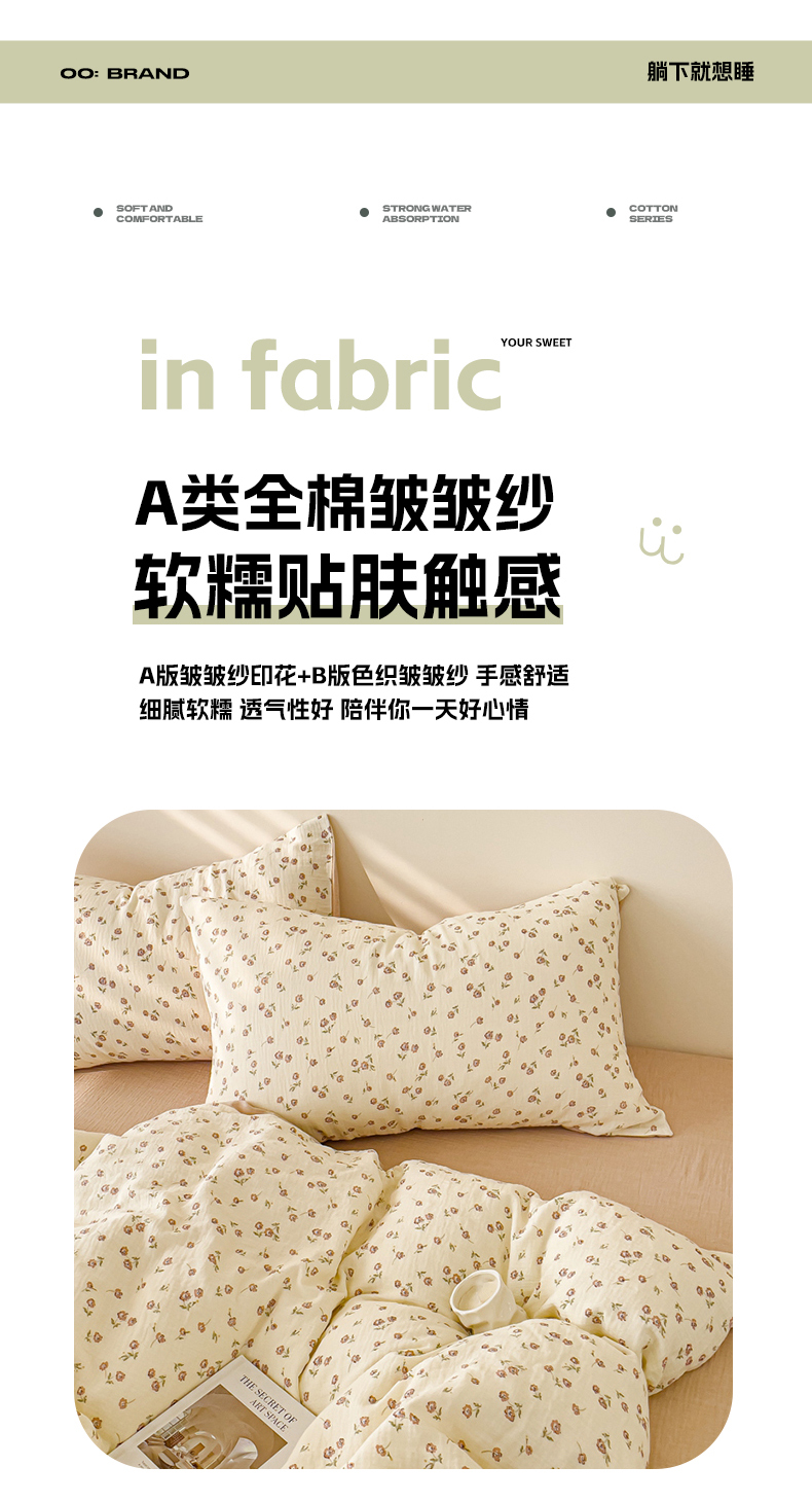 (总)木楌家居 2025新款A类全棉皱皱纱印花四件套,甜心宝贝,薄雾玫瑰,枫林 咖,枫林 绿,可颂,兰亭序,梦蝶,觅森,墨韵,晚棠,小确幸,伊洛娜,云梦泽,半夏 粉,草莓啵啵,初微,可心 兰,可心咖,哈尼,兰菲,黎夏 粉,黎夏 兰,木兰,奶油爱心,宁静,清颜,芮汐,时序 黄,时序 桔蓝,苏潼,西棠,潇湘,星月,悠然,月瑶