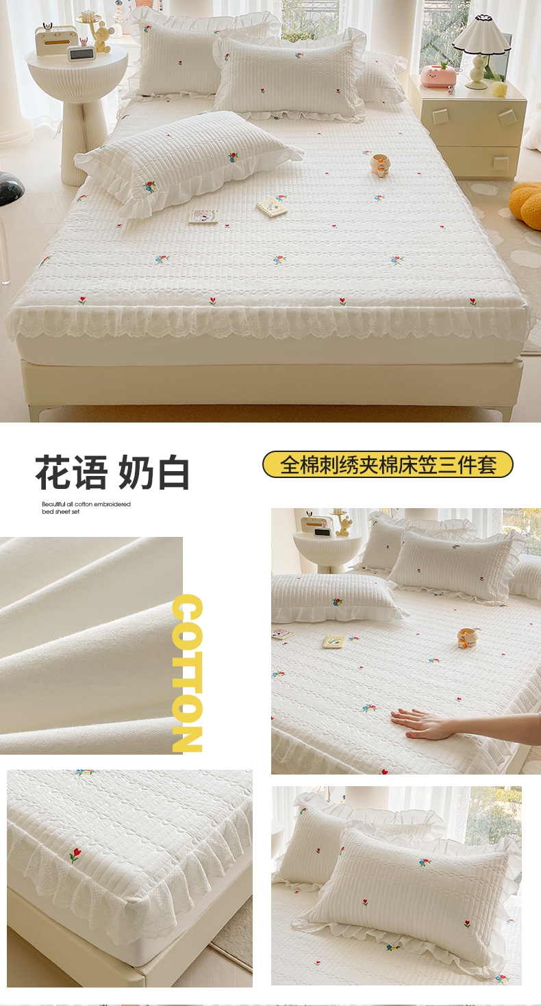 宜凡家纺 2024新款全棉夹棉绣花花边系列床笠三件套 花语 奶白