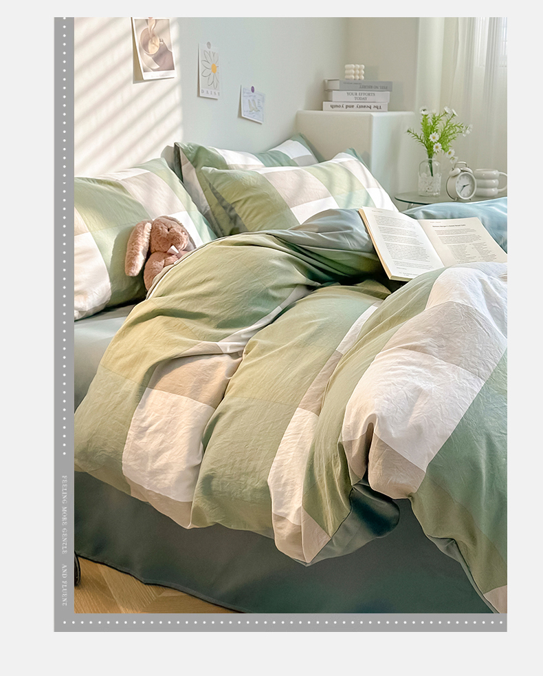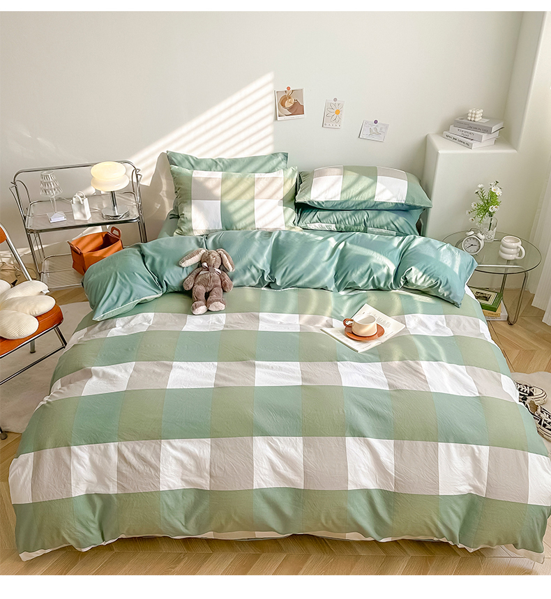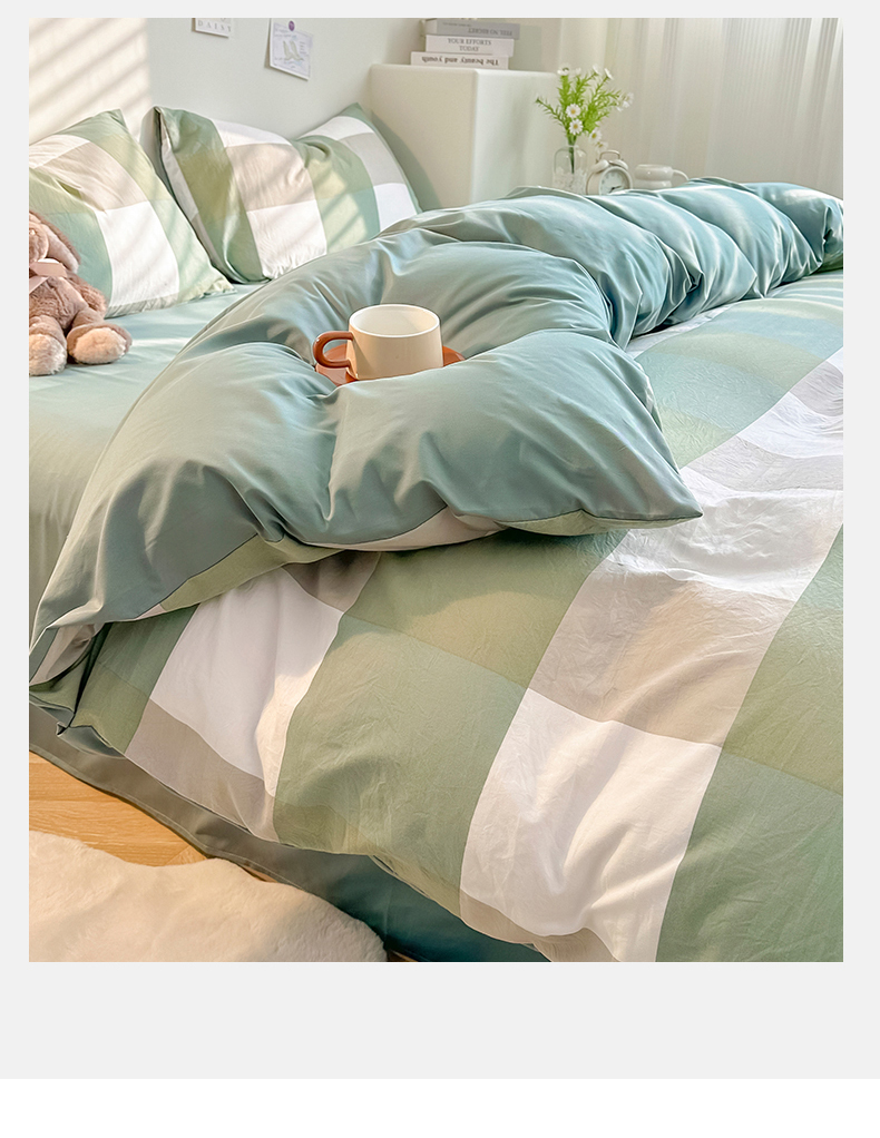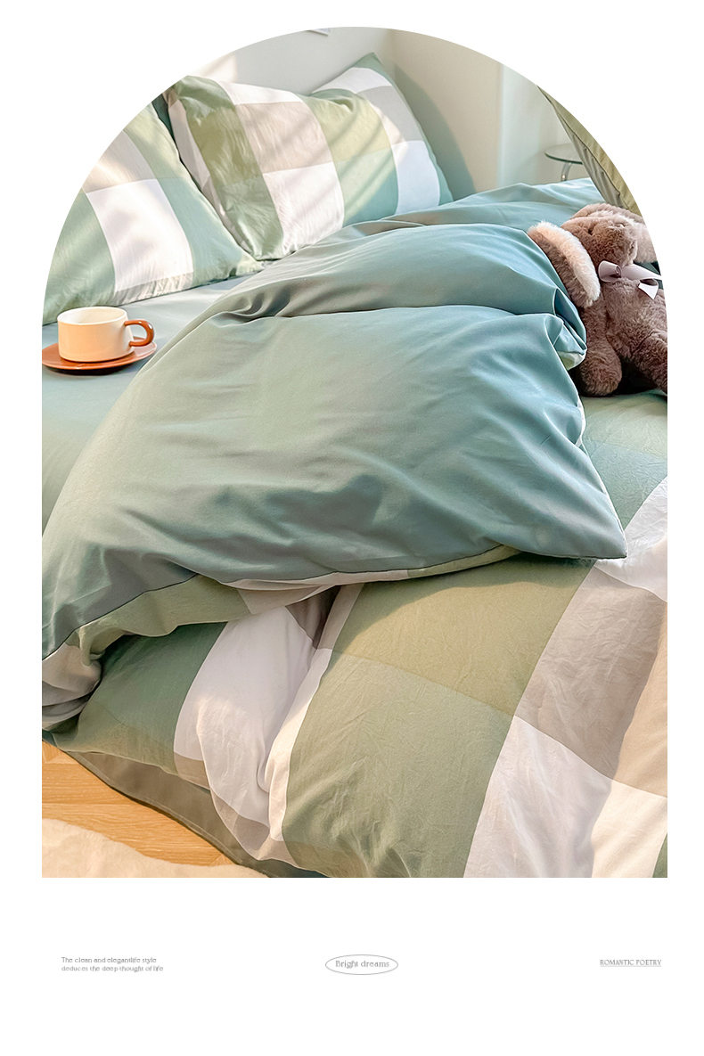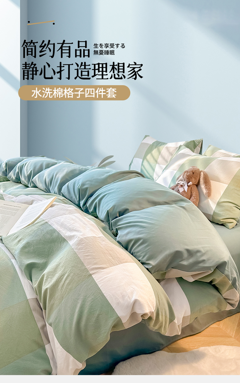 当前位置: 91家纺网 > 商品网购 > 床品套件 > 四件套 > 水洗棉四件套 > 古吉梦 2024新款水洗棉小清新印花格子系列四件套 G-绿白大格+薄荷绿