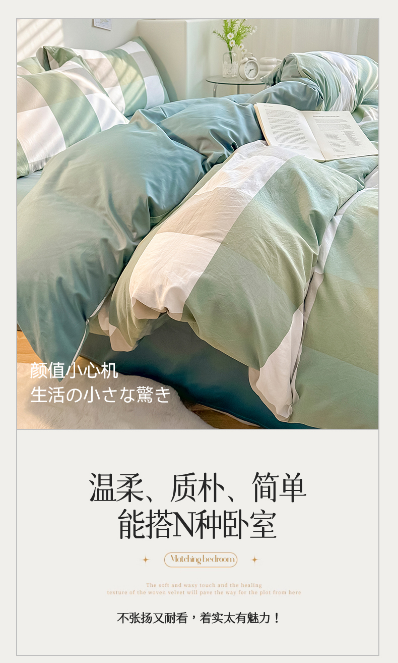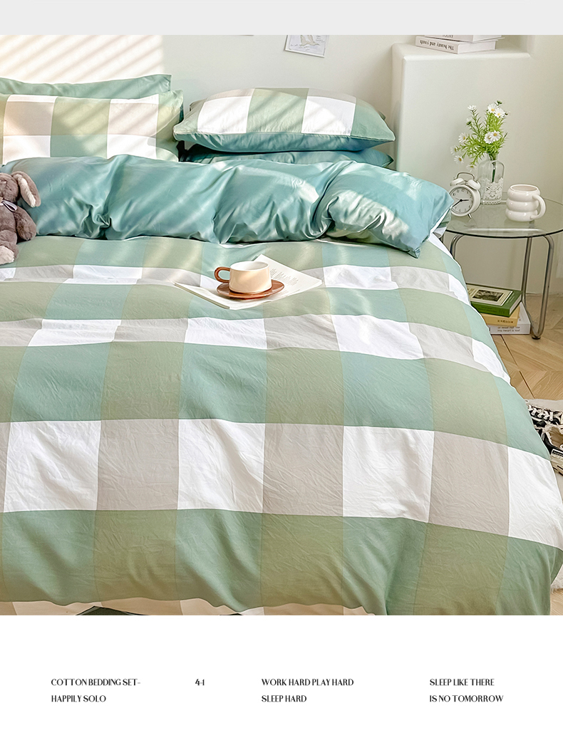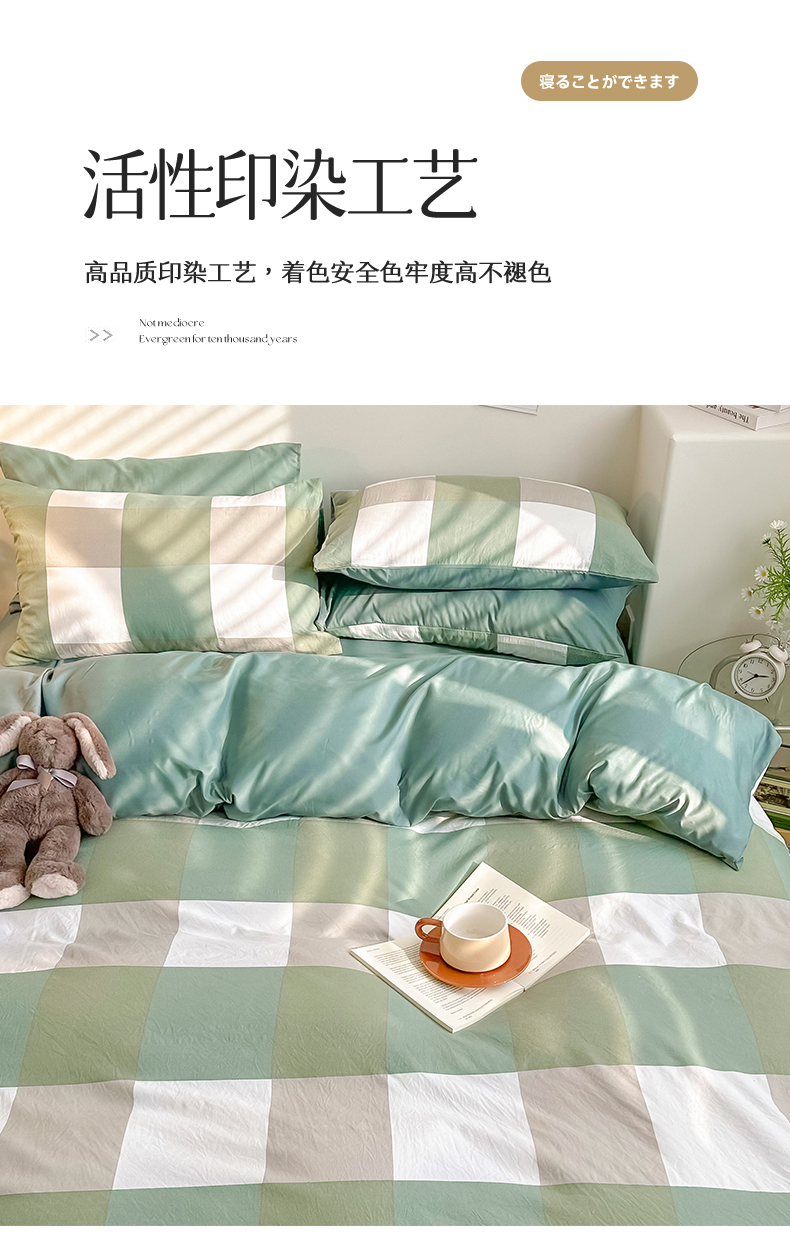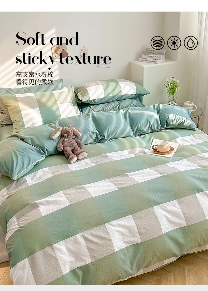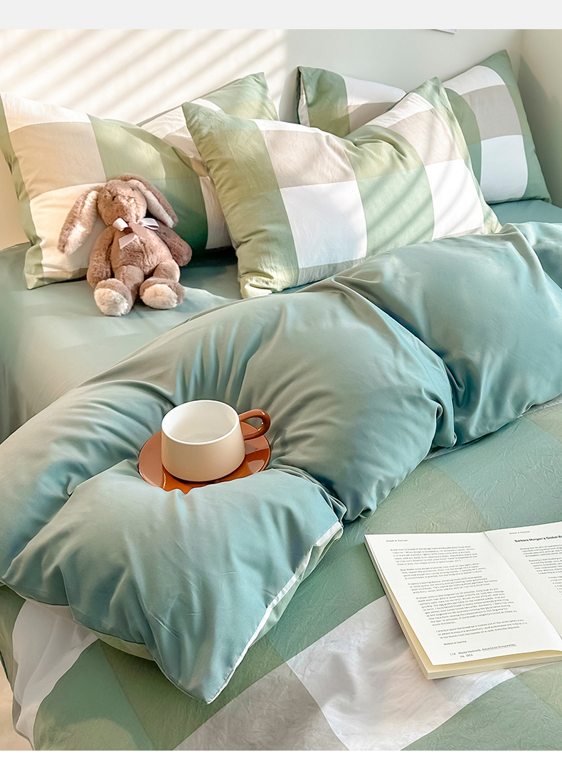 当前位置: 91家纺网 > 商品网购 > 床品套件 > 四件套 > 水洗棉四件套 > 古吉梦 2024新款水洗棉小清新印花格子系列四件套 G-绿白大格+薄荷绿