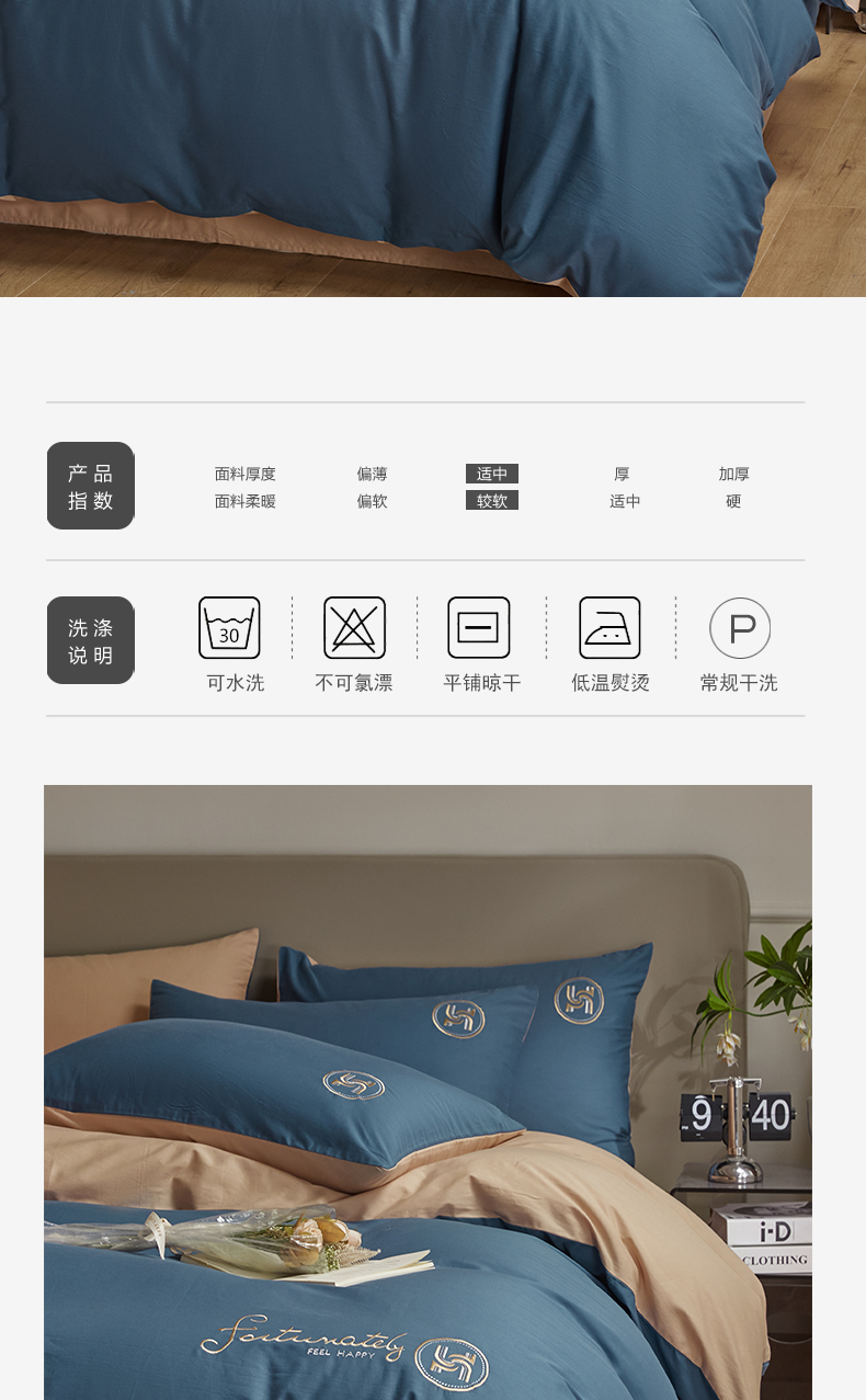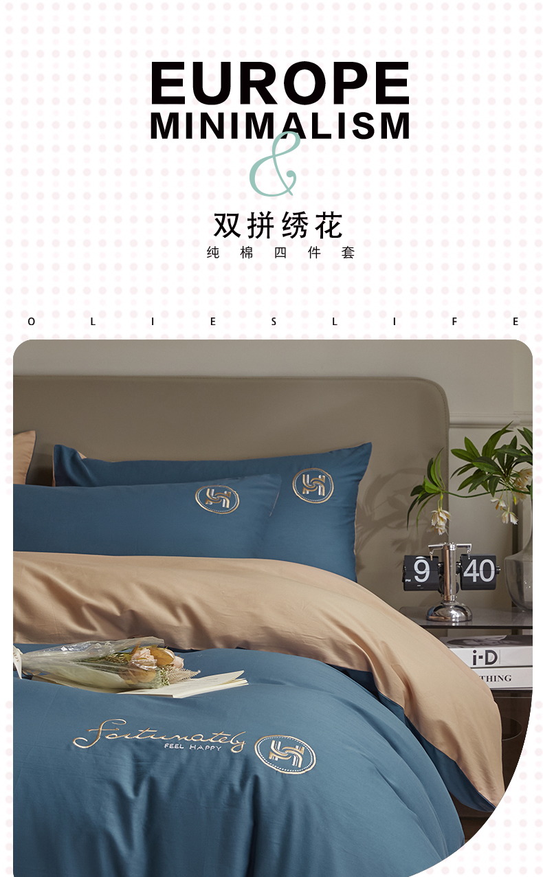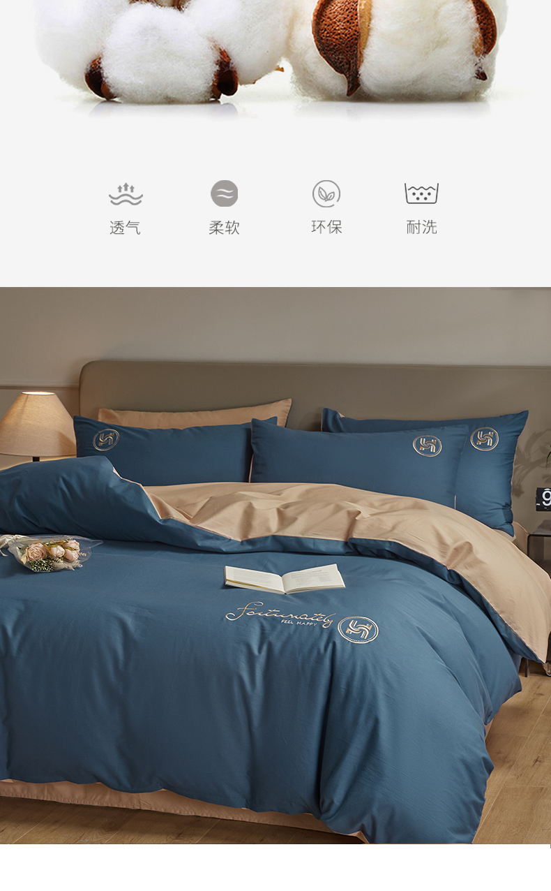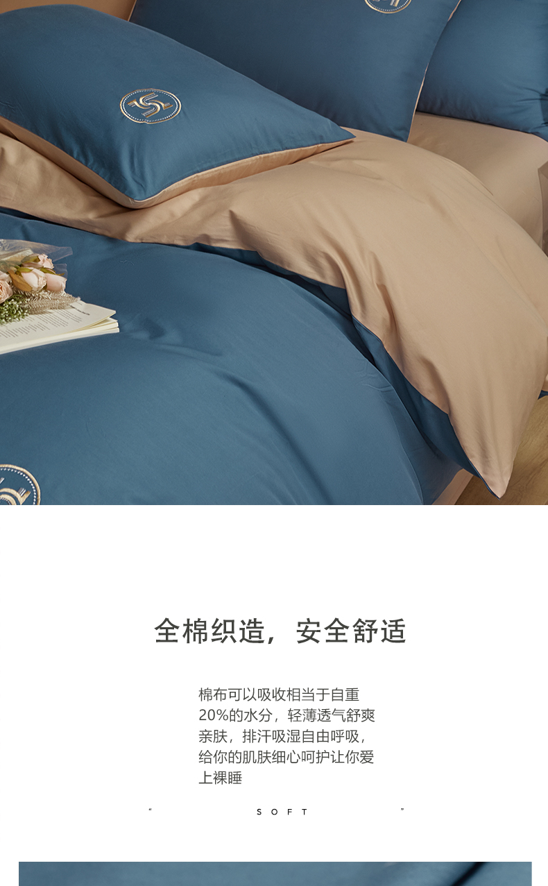 商品名称:梵克保罗 2024新款全棉轻奢纯色双拼刺绣四件套 深蓝色