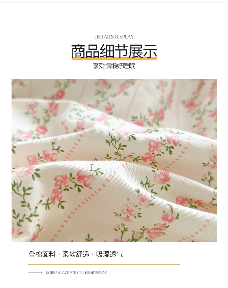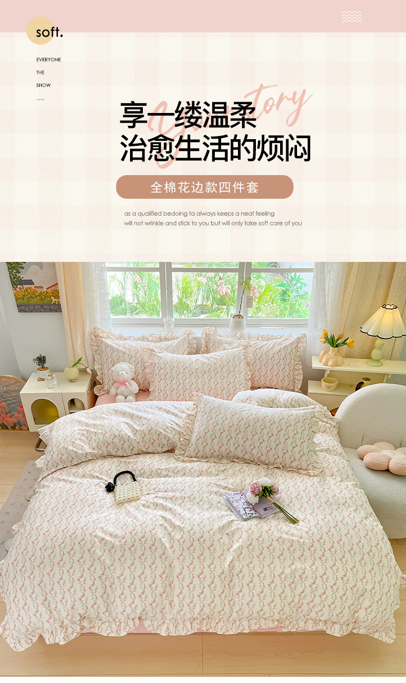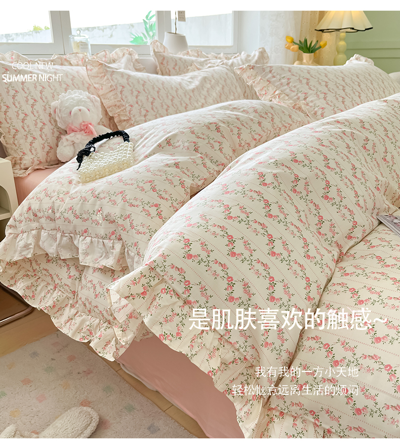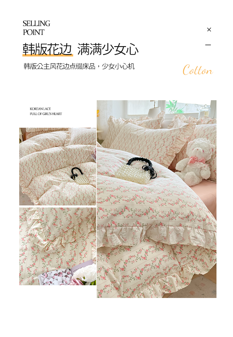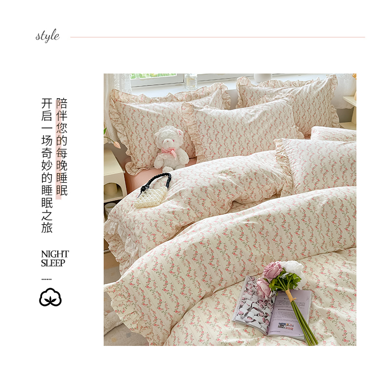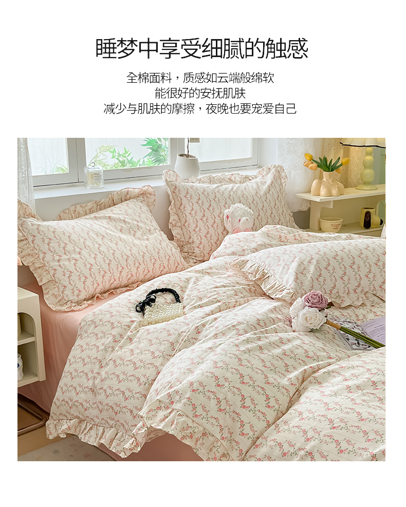 当前位置: 91家纺网 > 商品网购 > 床品套件 > 四件套 > 全棉普通四件套 > 柠馨 2024新款全棉印花浪漫花边款四件套 童话