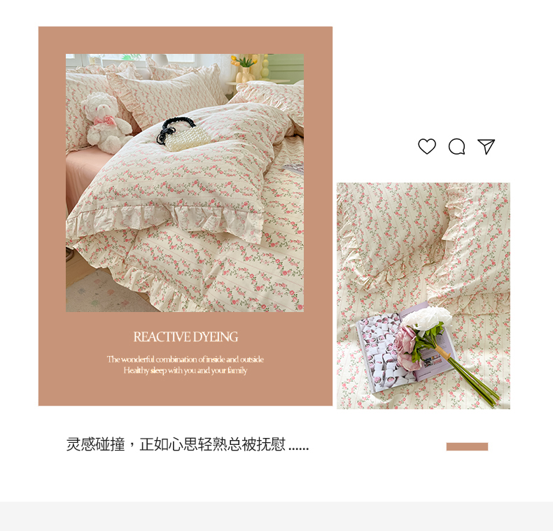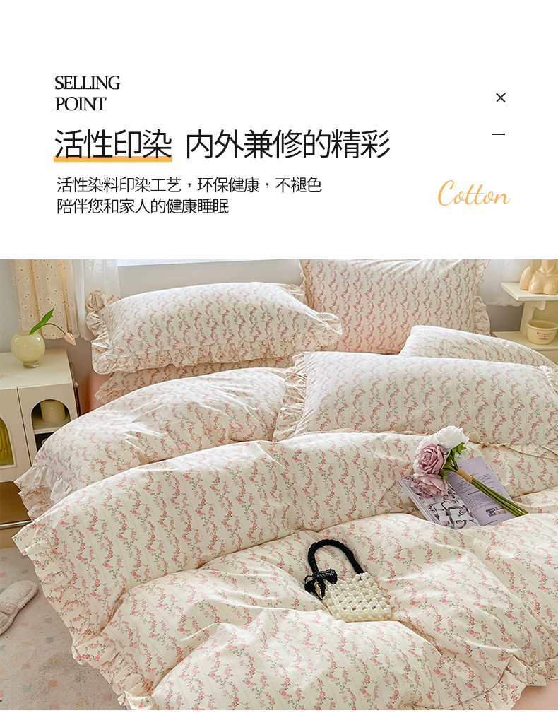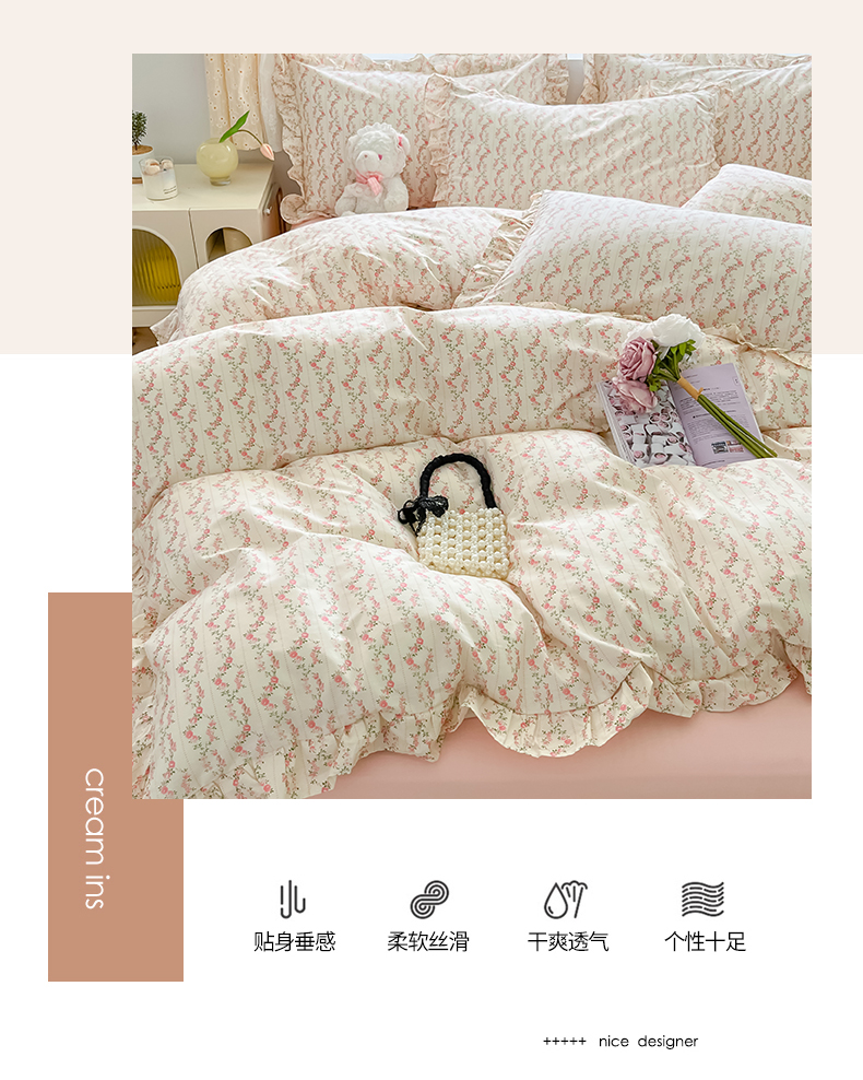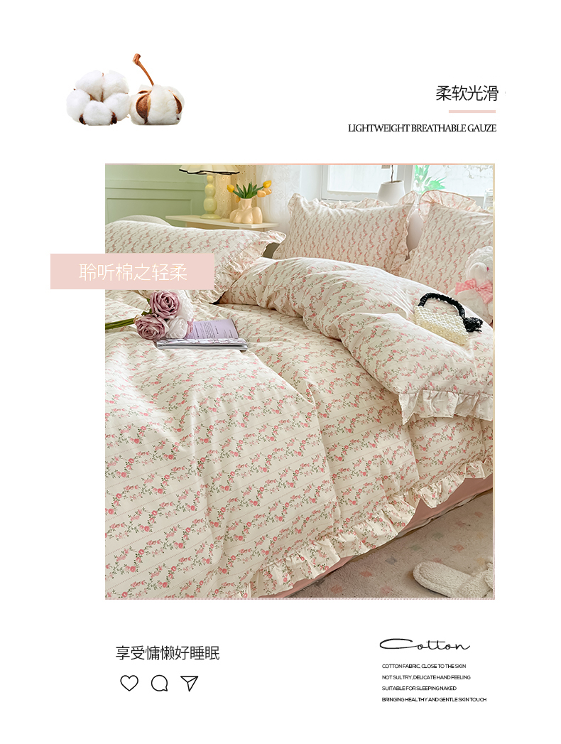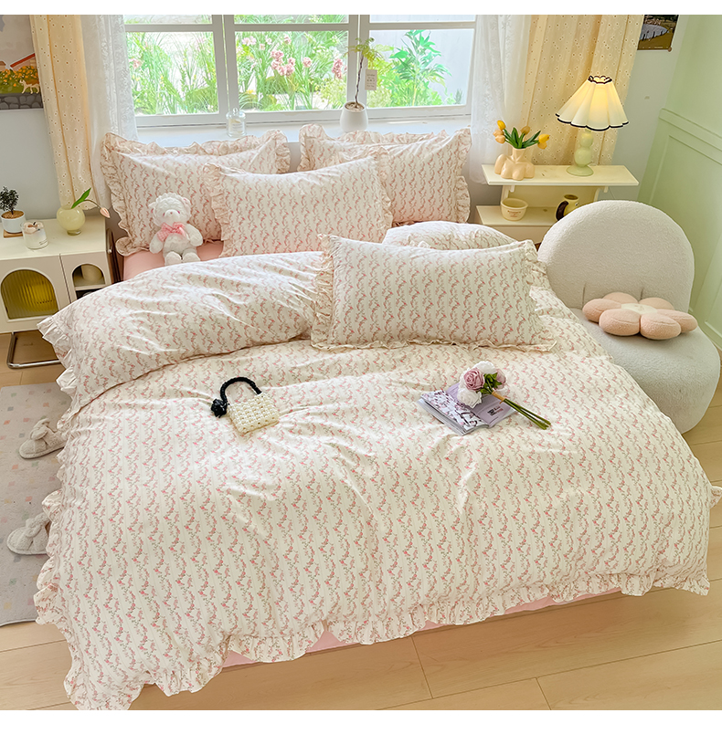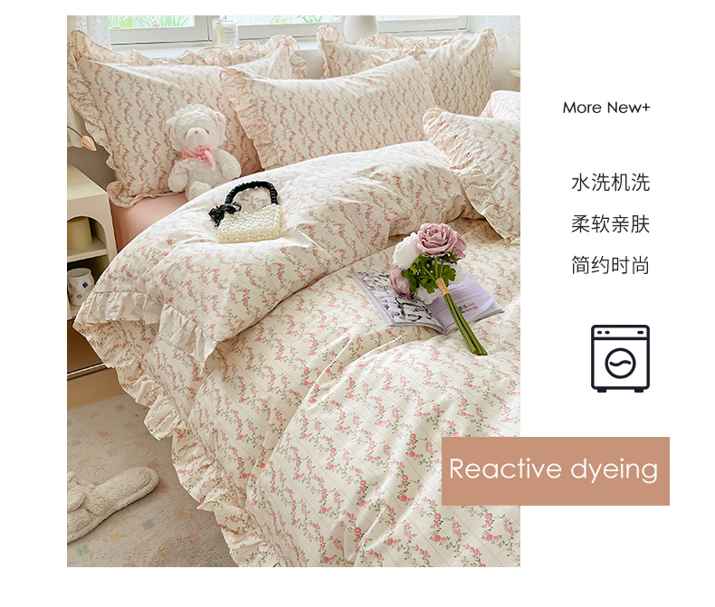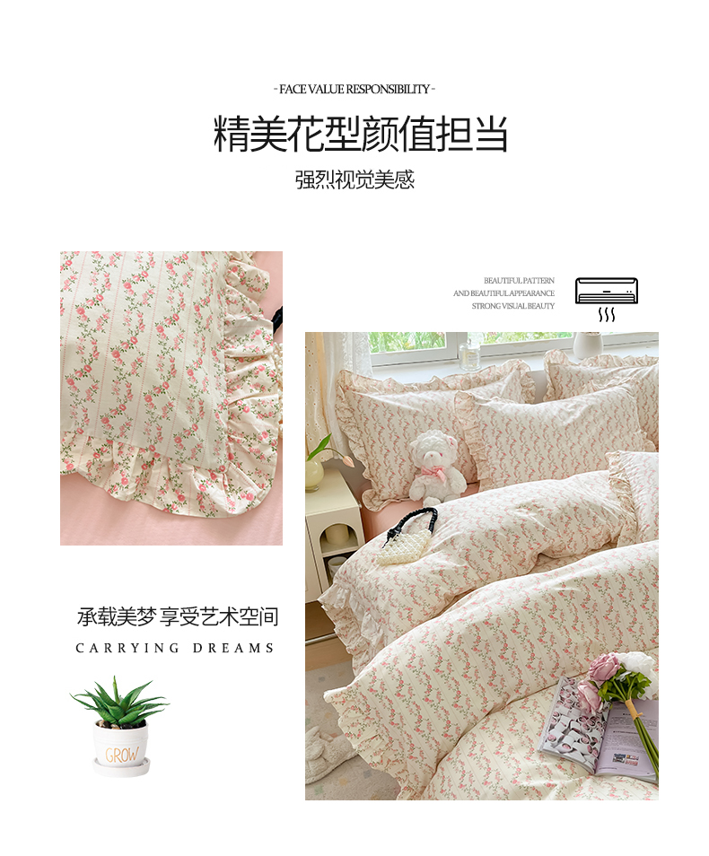 当前位置: 91家纺网 > 商品网购 > 床品套件 > 四件套 > 全棉普通四件套 > 柠馨 2024新款全棉印花浪漫花边款四件套 童话