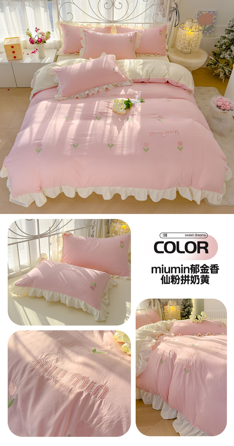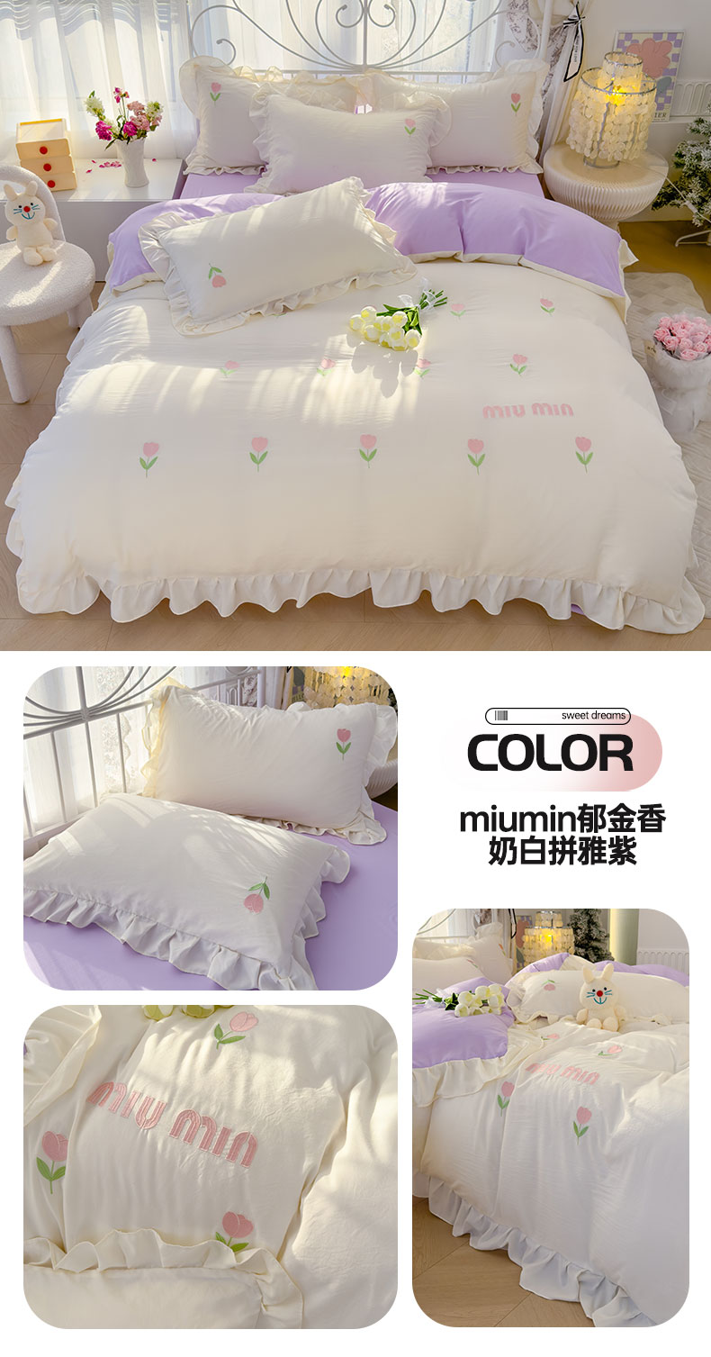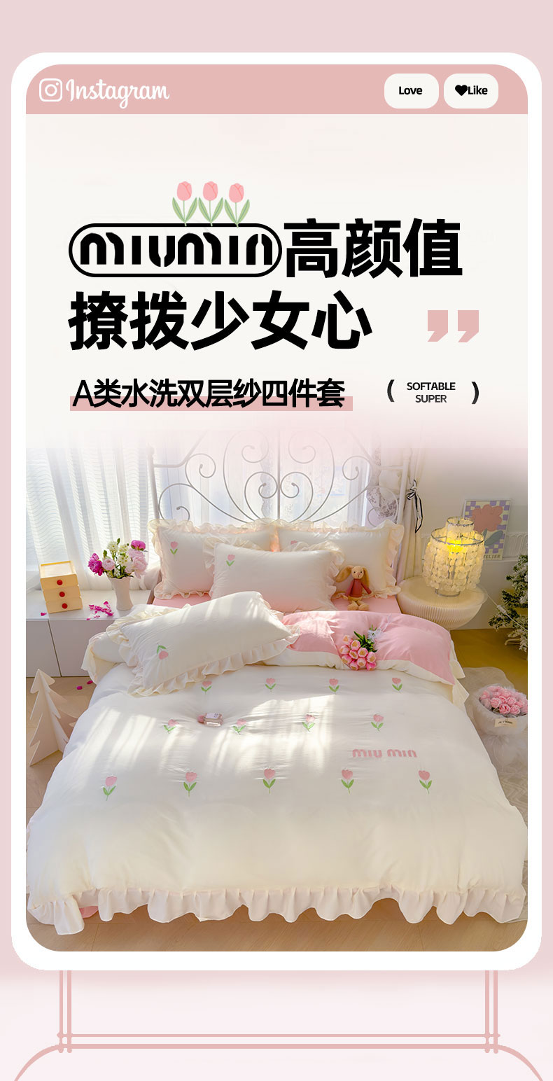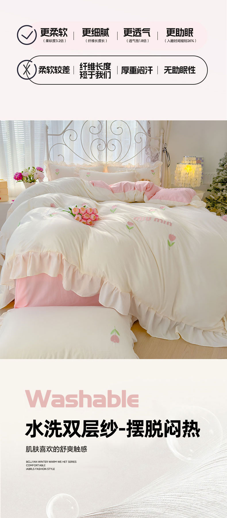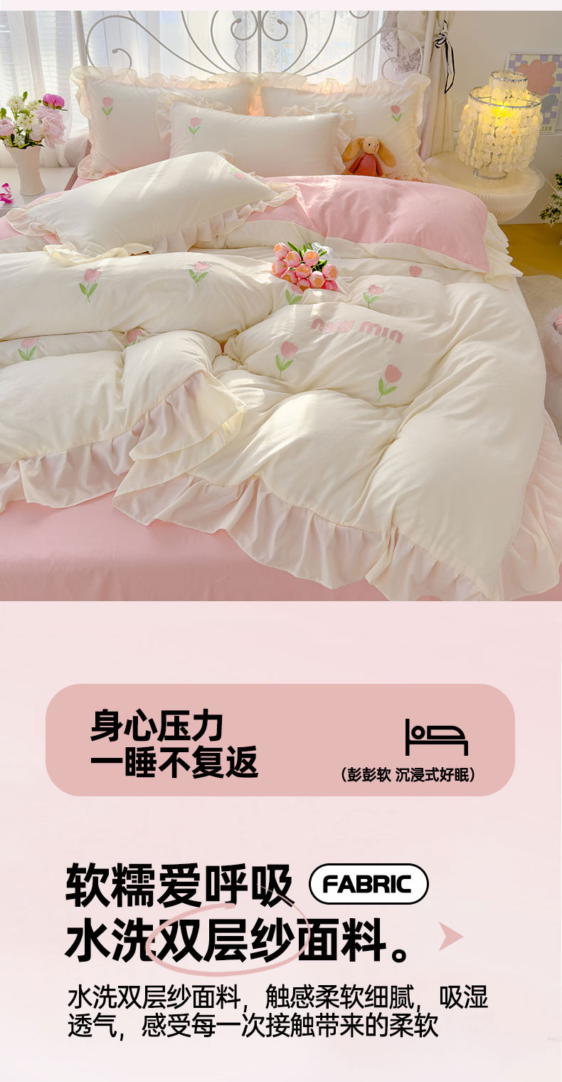 (总)灰鲸 2025新款水洗双层纱miumin郁金香刺绣四件套
