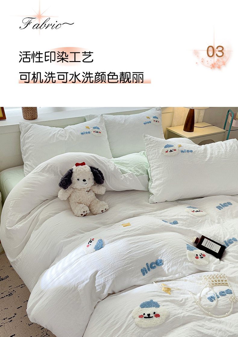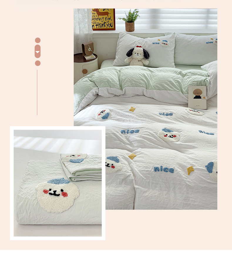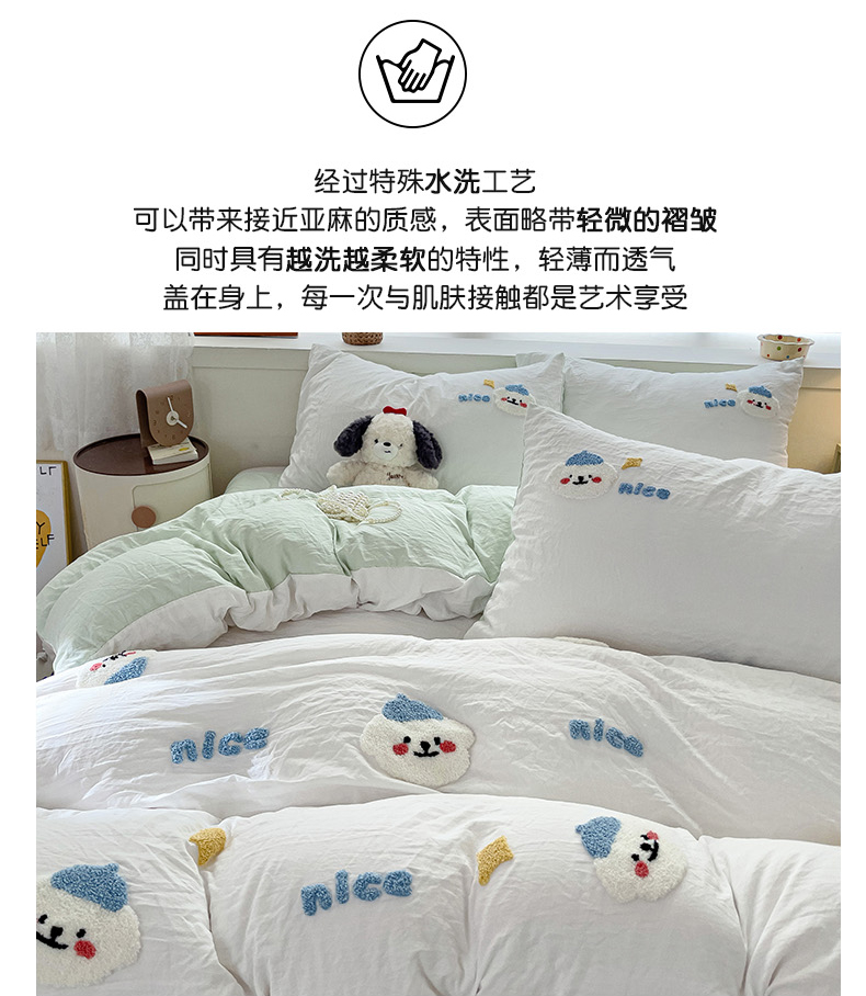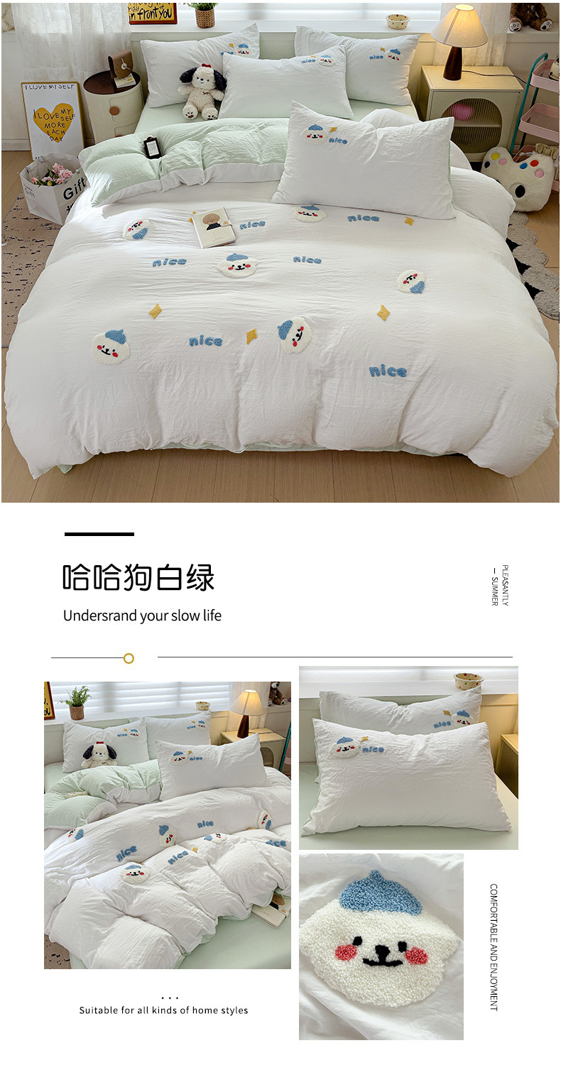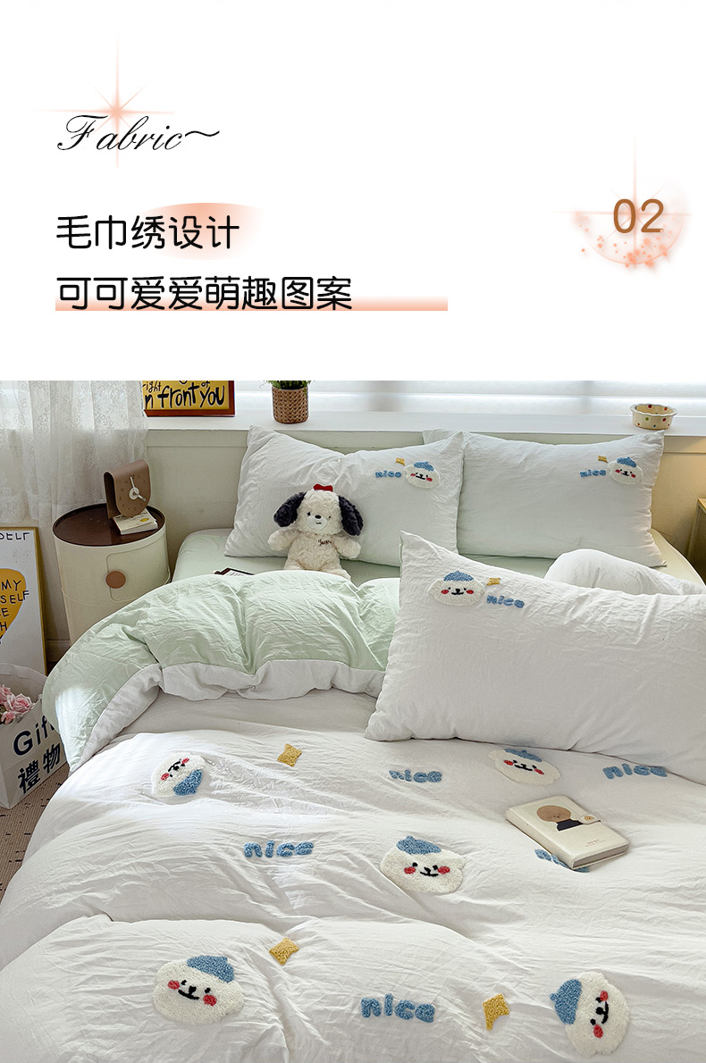 当前位置: 91家纺网 > 商品网购 > 床品套件 > 四件套 > 毛巾绣四件套 > 韩巢家纺 2024爆款四季通用超柔水洗棉毛巾绣四件套-哈哈狗系列(提供精美卖家秀) 哈哈狗白绿