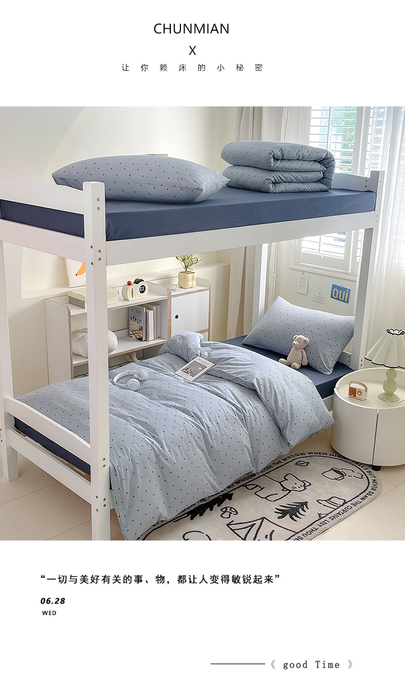 商品名称:Mr.pig猪先生水洗棉 2024新款A类小清新全棉四件套纯棉床单被套床笠学生宿舍三件套床床上用品 灰蓝波点