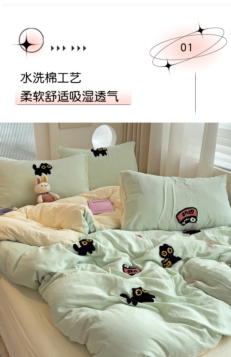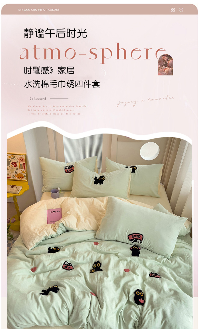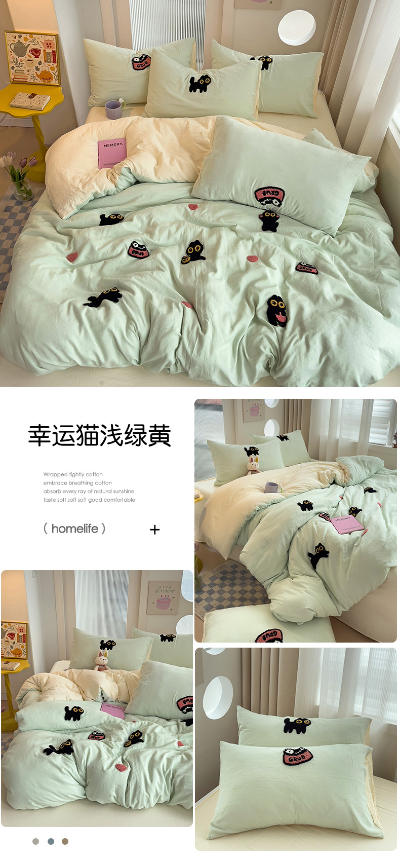 当前位置: 91家纺网 > 商品网购 > 床品套件 > 四件套 > 水洗棉四件套 > 韩巢家纺 2024新款四季通用超柔水洗棉毛巾绣四件套-幸运猫系列(提供卖家秀) 幸运猫浅绿黄