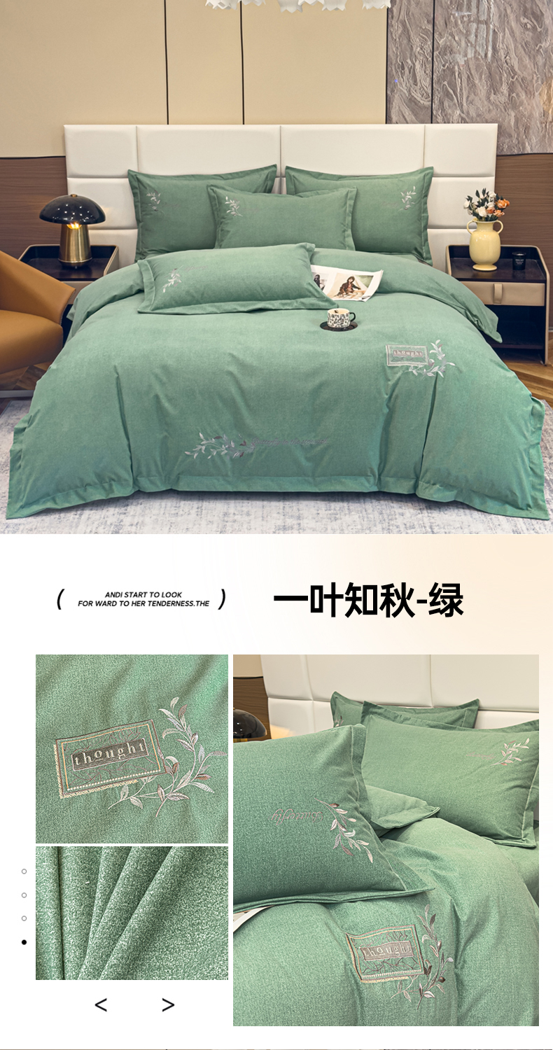 当前位置: 91家纺网 > 商品网购 > 床品套件 > 四件套 > 普通磨毛四件套 > U品汇 2024新品生态加厚长绒棉纯棉绣花全棉磨毛刺绣四件套宽边款直播 一叶知秋-绿