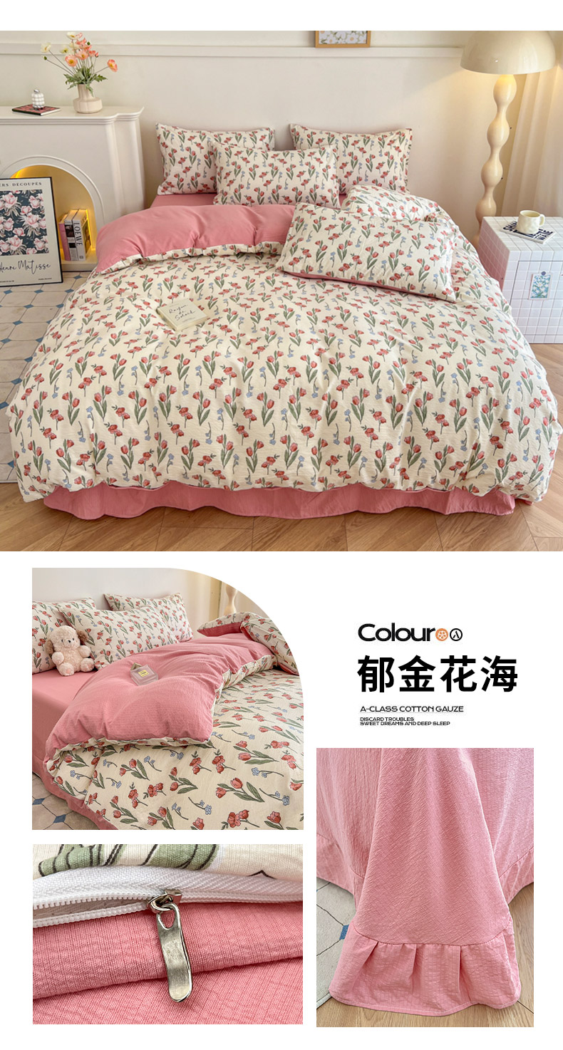 (总)金梦拉家纺 2025新款提花纱布棉双层纱皱皱纱四件套,微醺玫瑰,梦华录,花开半夏,漫山紫野,薄荷初夏,点点草莓,法式浪漫,粉杏绿,花颜,惠心,桔梗紫,咖调蝴蝶结,快乐狗,梨落,林间兔,绿意,绿茵,满园春色,曼塔庄园,萌萌小兔,雾野山茶,小野菊,寻春,樱桃,月梨漫香,芝士黄,枝蔓绿,紫线调,紫樱落