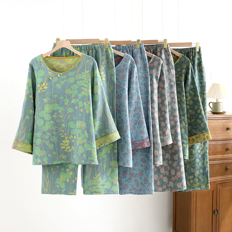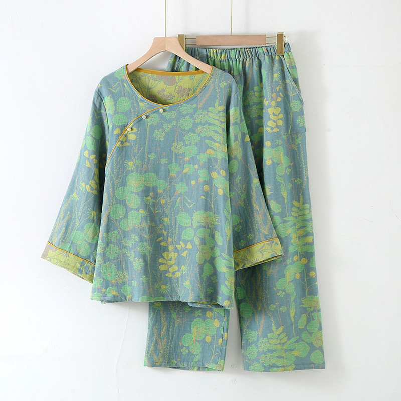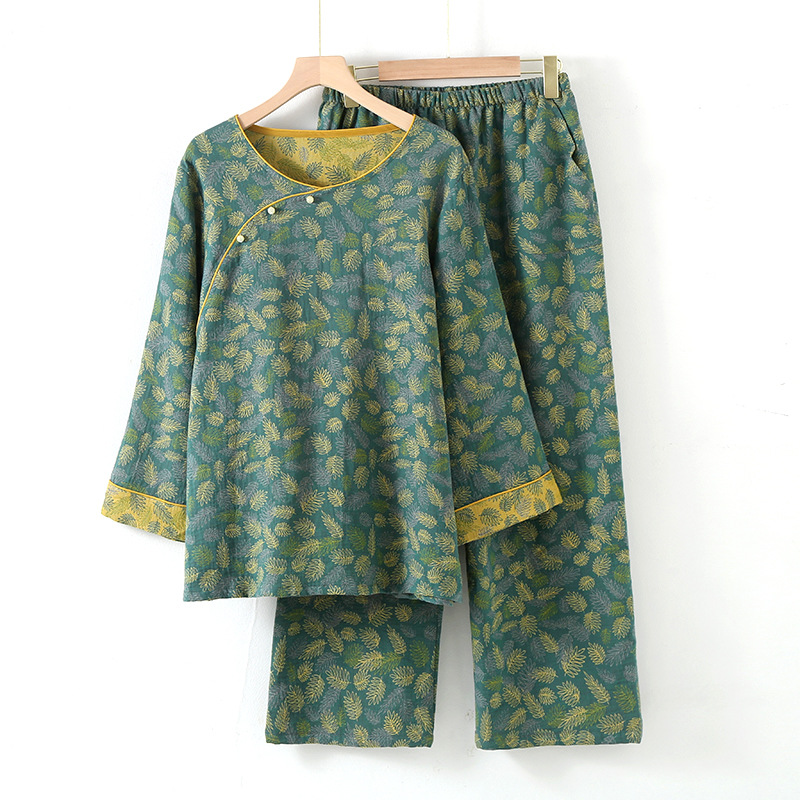 洛兰沙家居馆【只代发】【只代发】 2024新款全棉色织提花国风长袖长裤睡衣女四季薄款圆领套头家居服套装可外穿 灰色