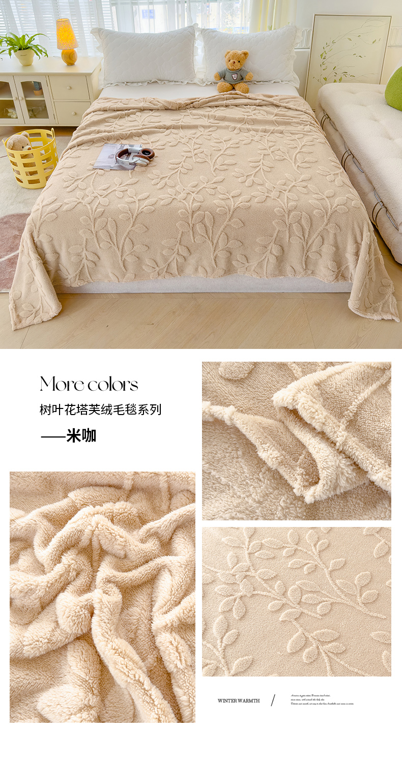 商品名称:枋梢家纺 2024新款跨境电商发财树塔芙绒纯色发财树提花多功能盖毯午睡毯子办公毛毯 米咖