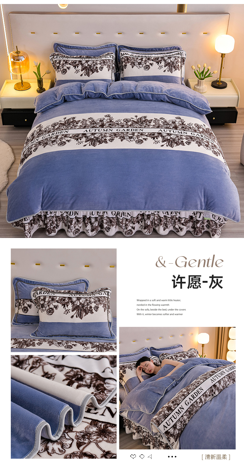 商品名称:赫本家纺 2025新品8-9斤爆品牛奶绒四件套床裙款金雕绒法莱绒四套件 许愿-灰