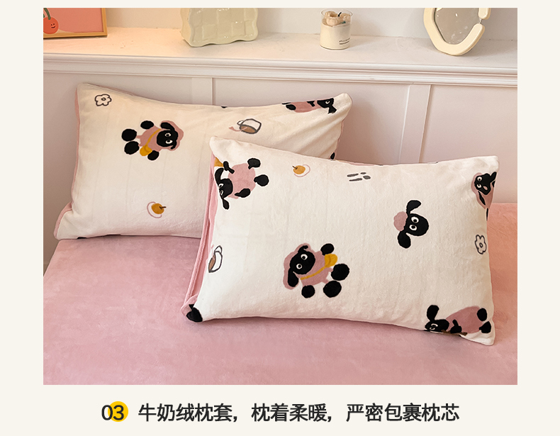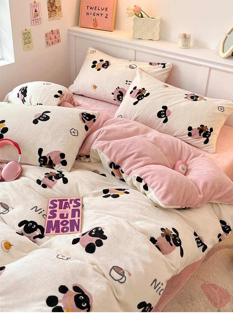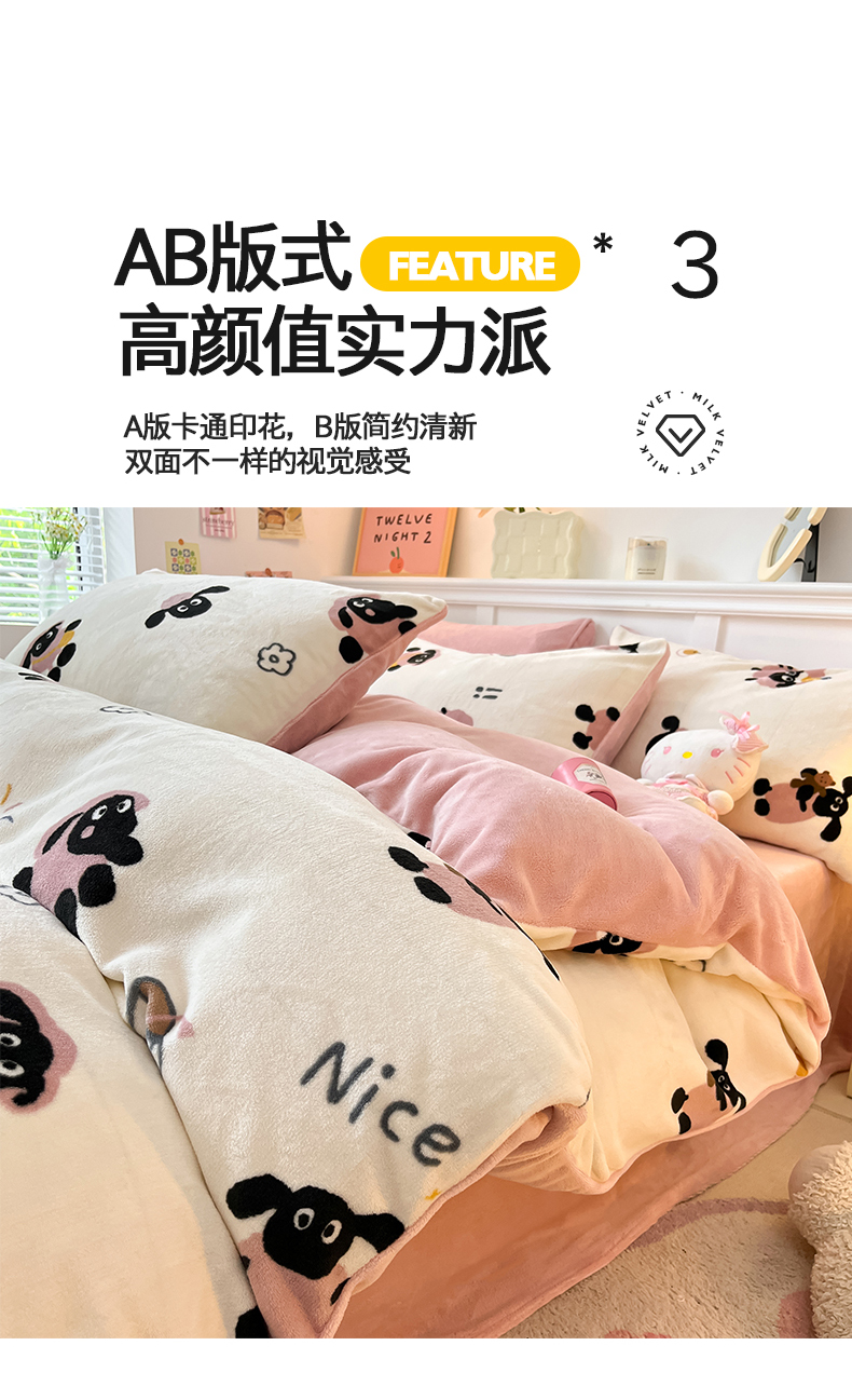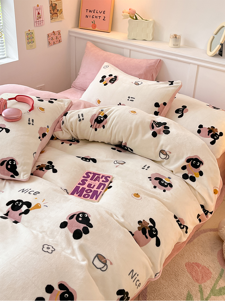 商品名称:桃子家居 2024新款小清新卡通加厚牛奶绒全工艺200克印花牛奶绒系列四件套 绒-小羊泡芙