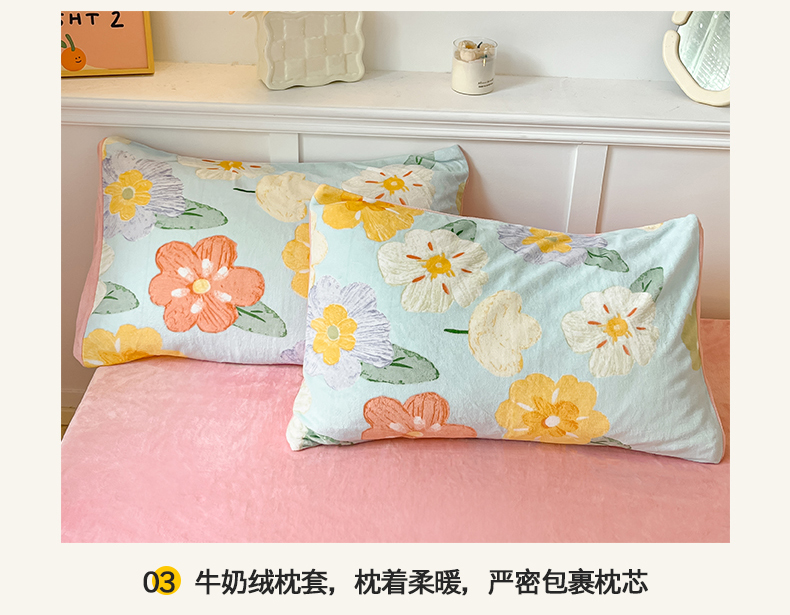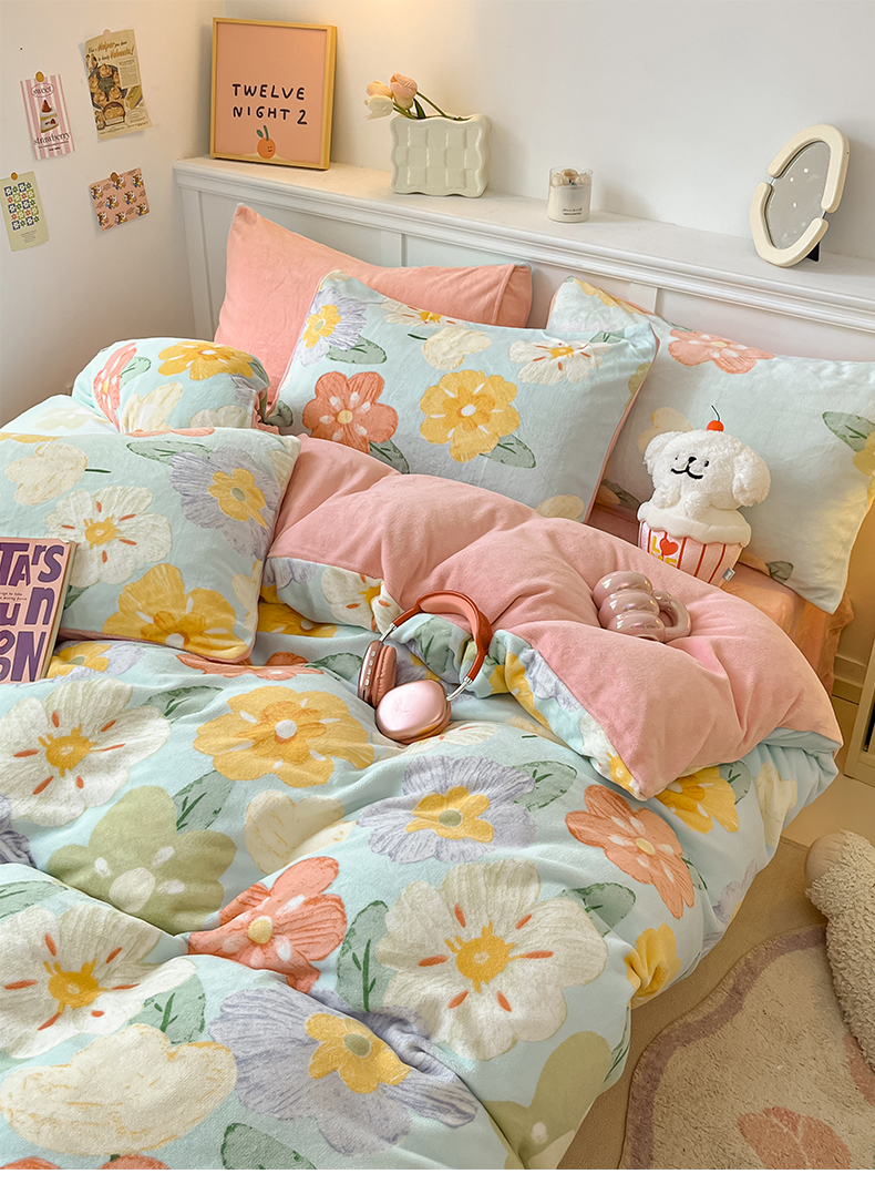商品名称:桃子家居 2024新款小清新卡通加厚牛奶绒全工艺200克印花牛奶绒系列四件套 绒-缤纷花园