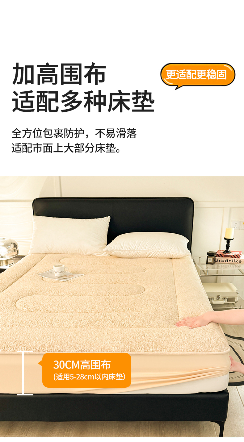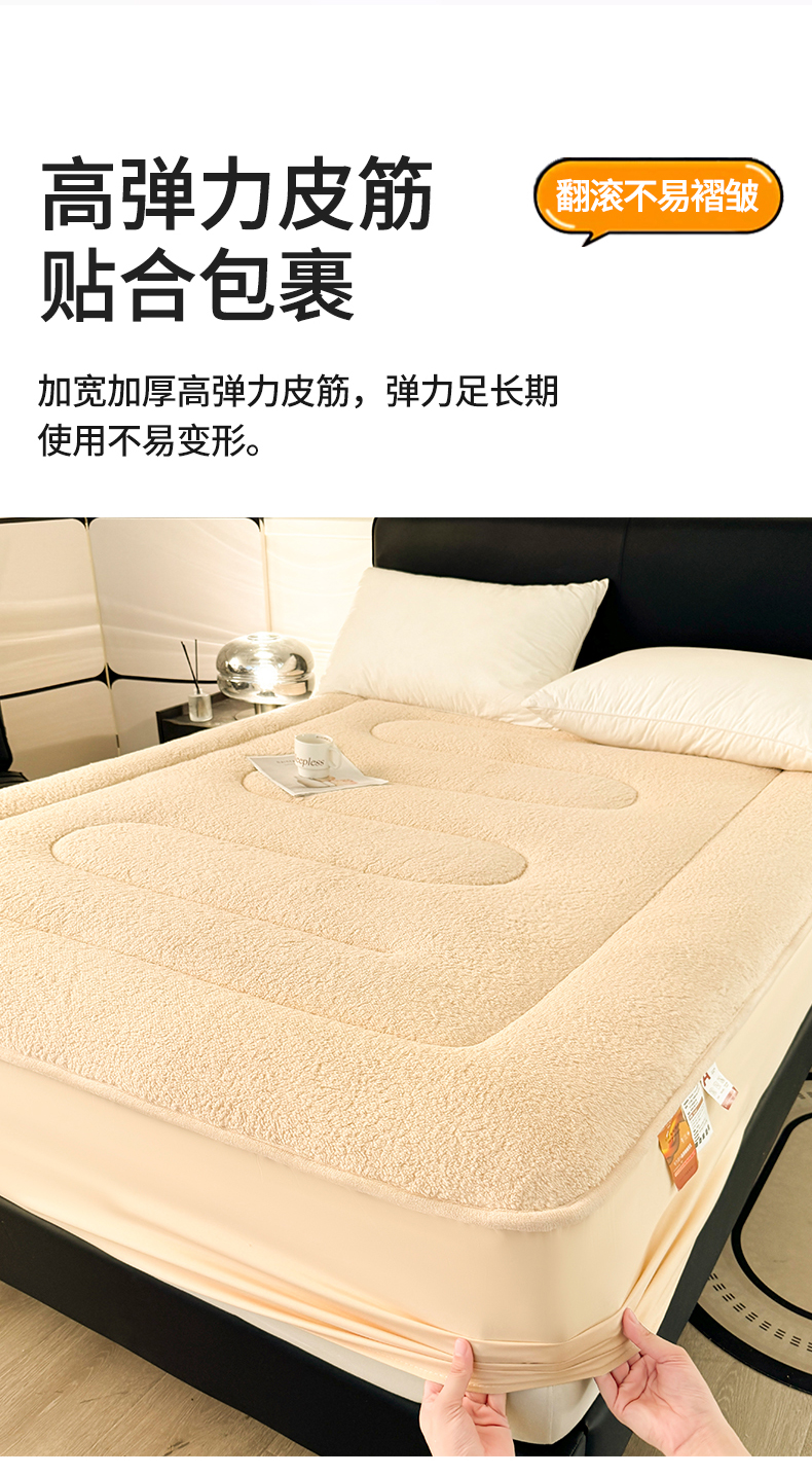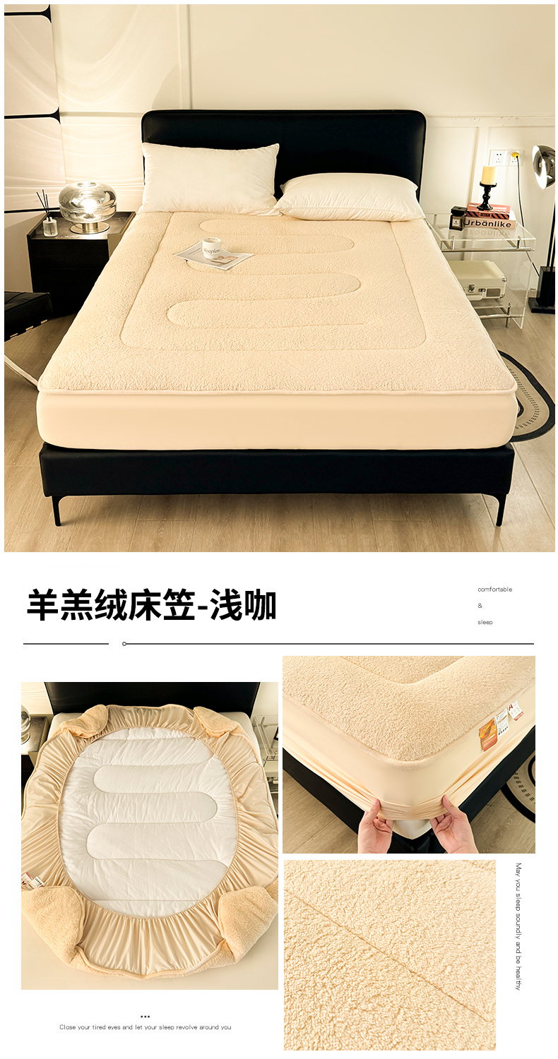 雯豆家纺 2024新款加厚羊羔绒夹棉床笠纯色素色保暖床垫保护套 羊羔绒床笠-浅咖