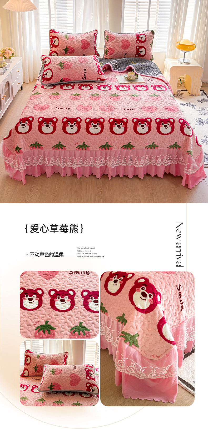 梓依家纺 2025新款牛奶绒花边单床盖三件套四件套 爱心熊,爱心熊