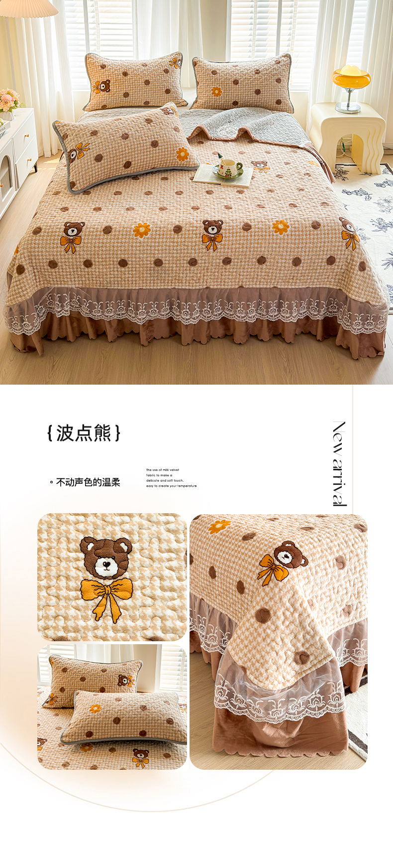 梓依家纺 2025新款牛奶绒花边单床盖三件套四件套 波点熊,波点熊