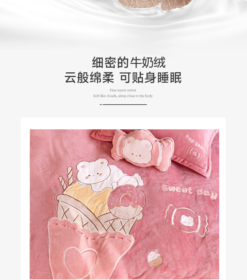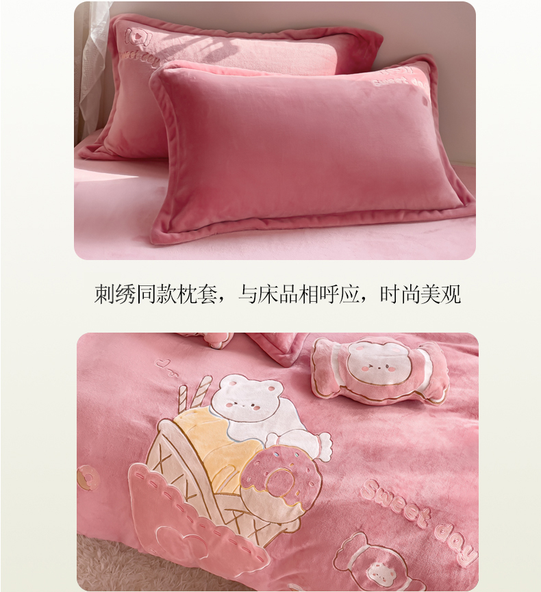商品名称:(总)【苏东来】加绒加厚大版卡通牛奶绒贴布绣刺绣四件套冬季小清新儿童卡通保暖宝宝婴儿绒兔绒法莱绒金貂绒学生三件套件被套四件套