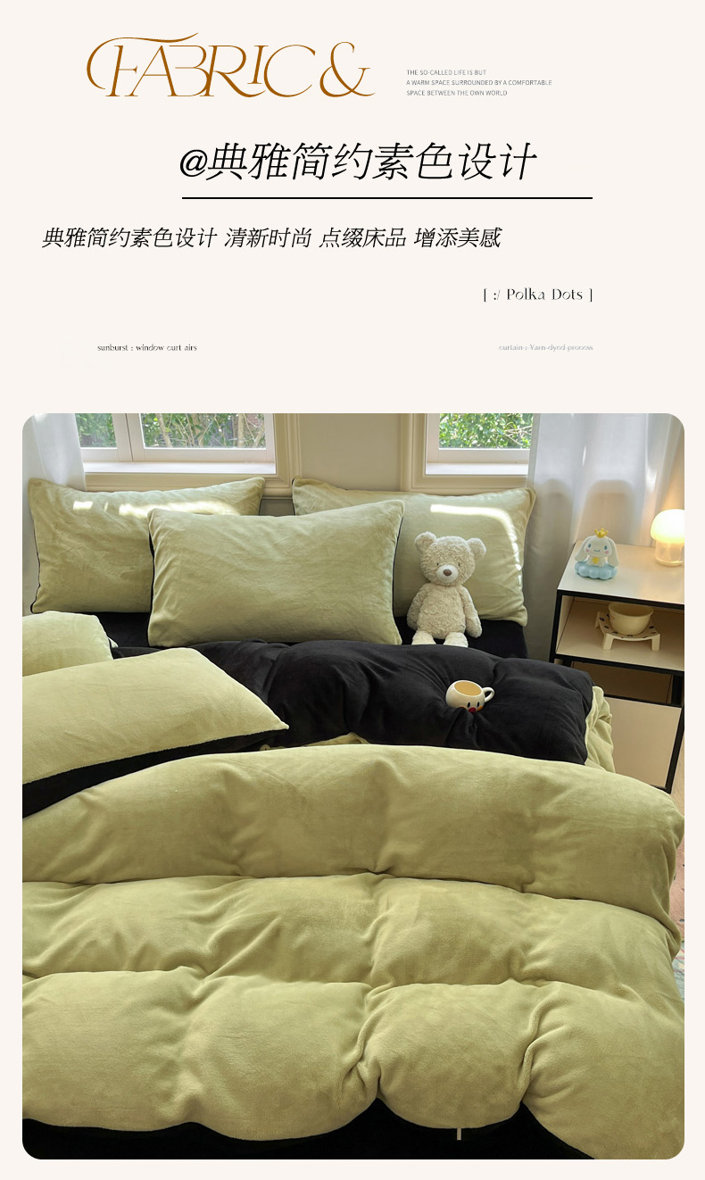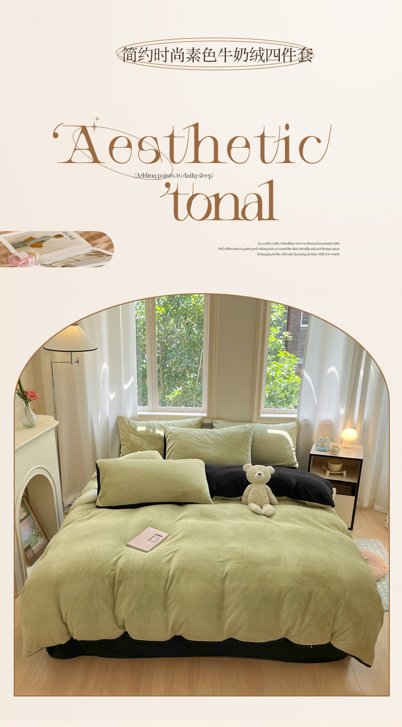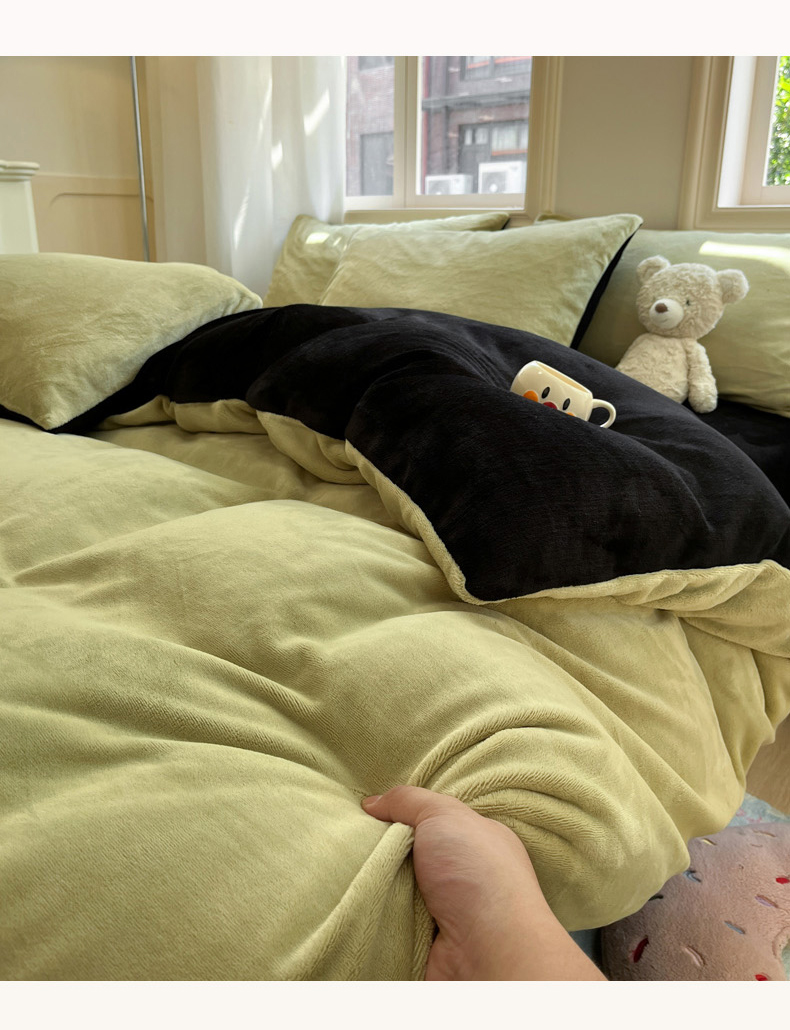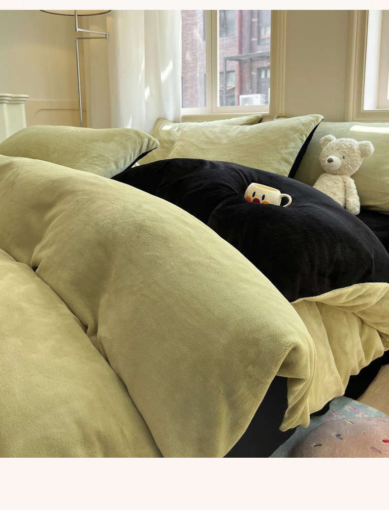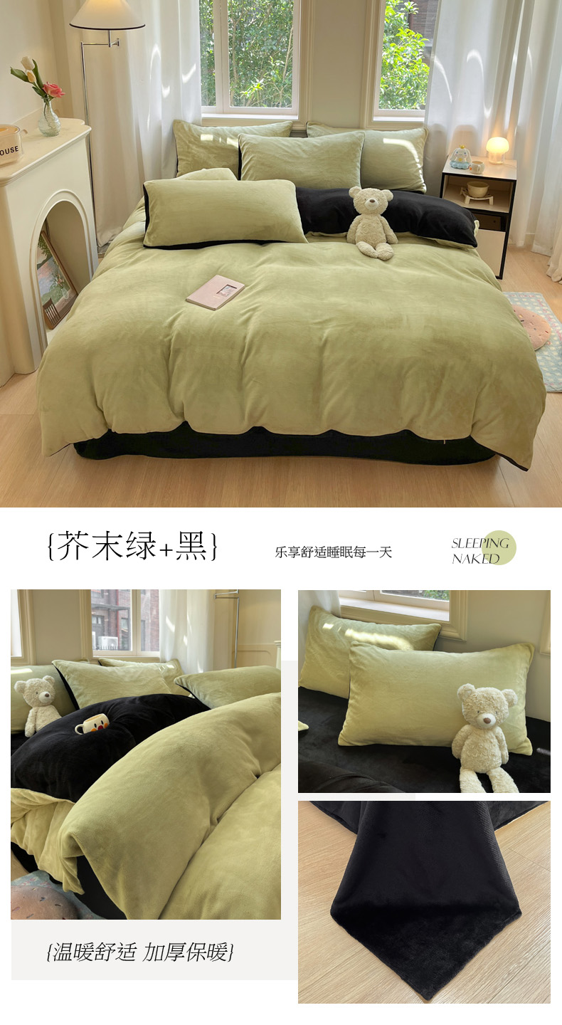 当前位置: 91家纺网 > 商品网购 > 床品套件 > 四件套 > 牛奶绒四件套 > 慕澄家纺 2024新款纯色双拼牛奶绒四件套 芥末绿+黑