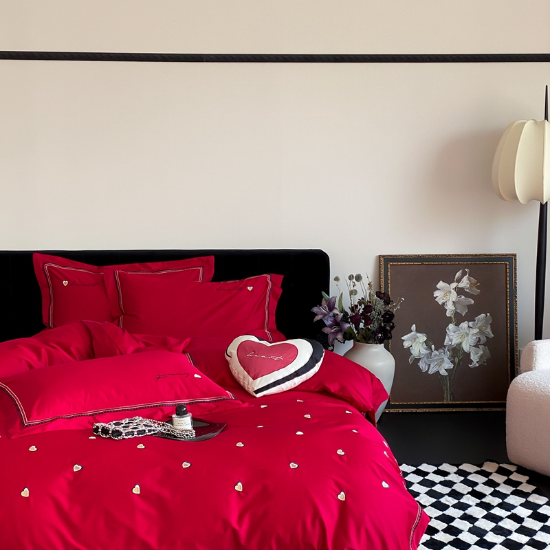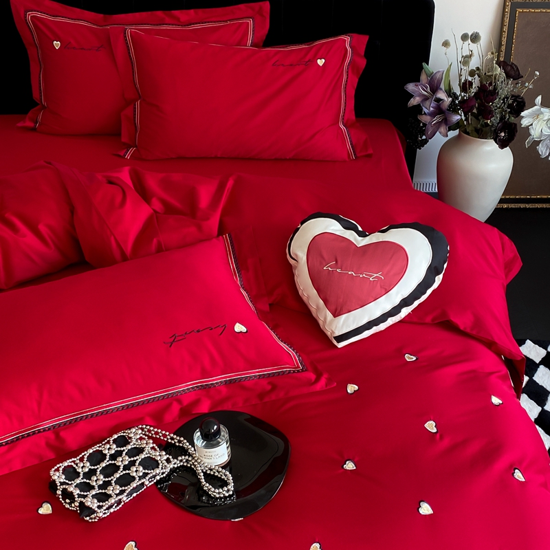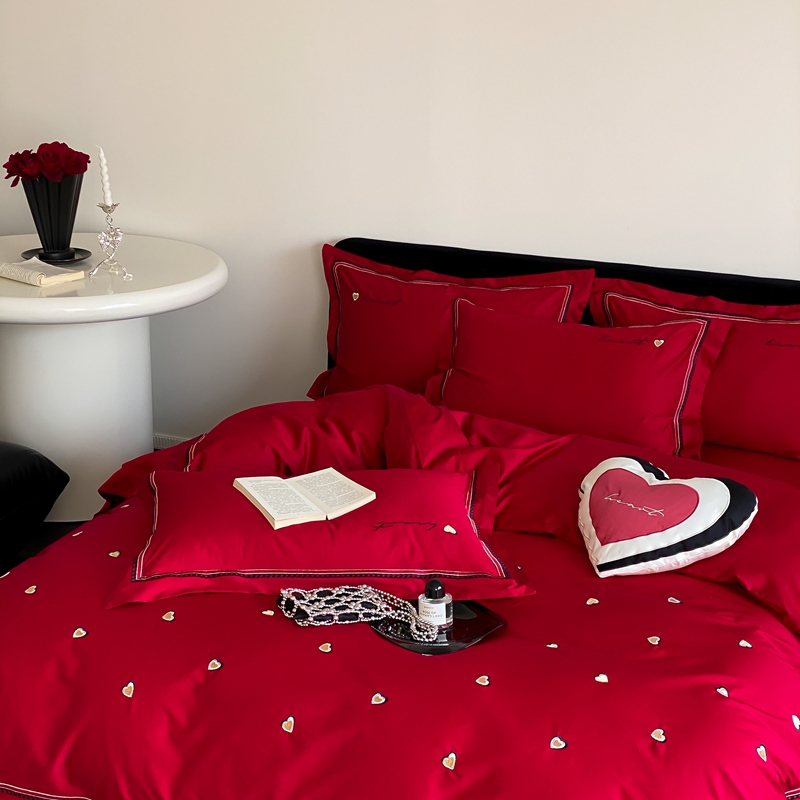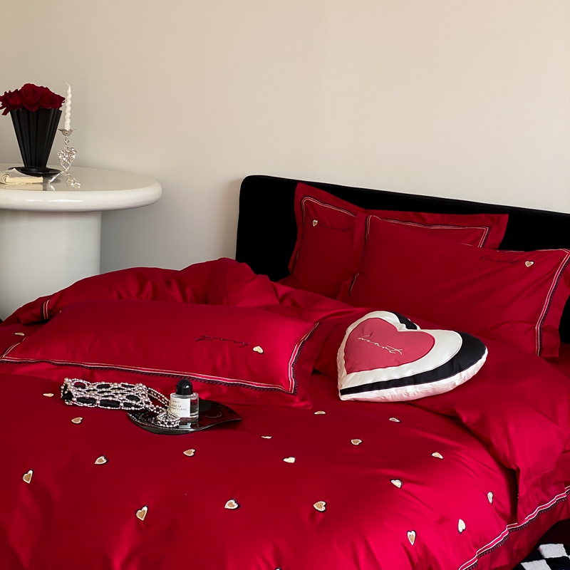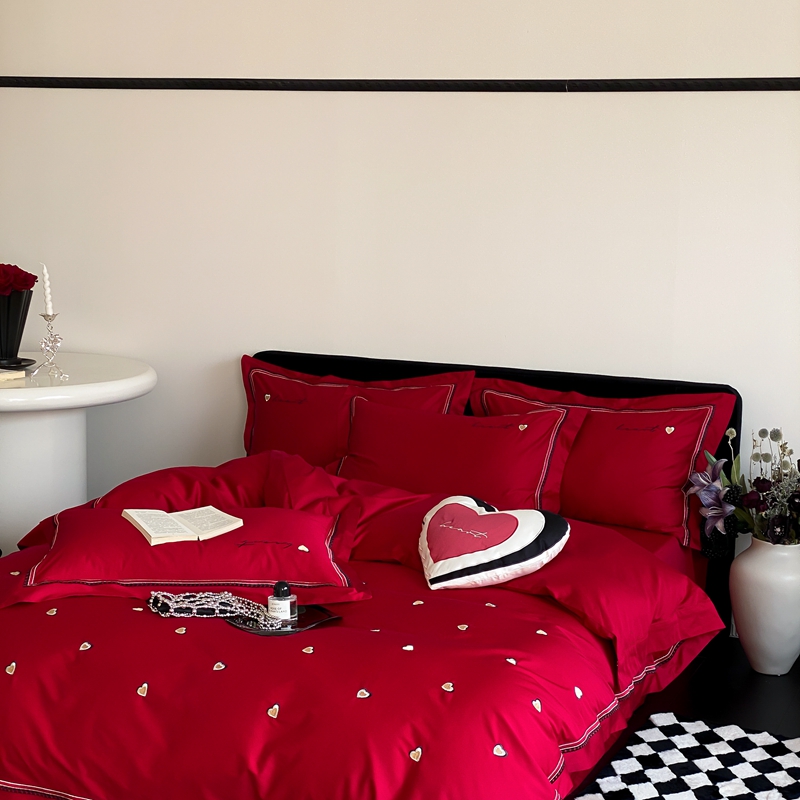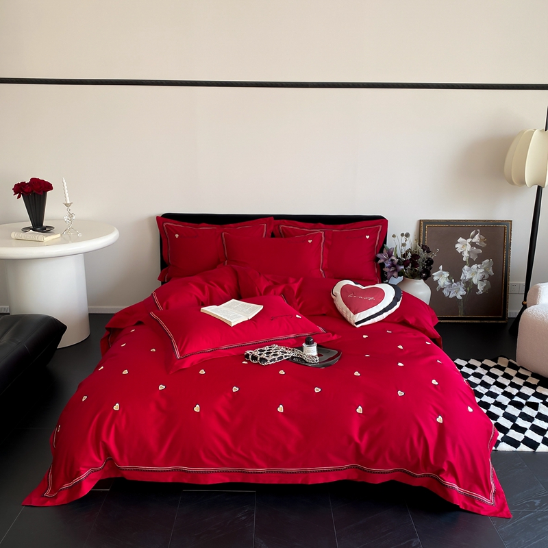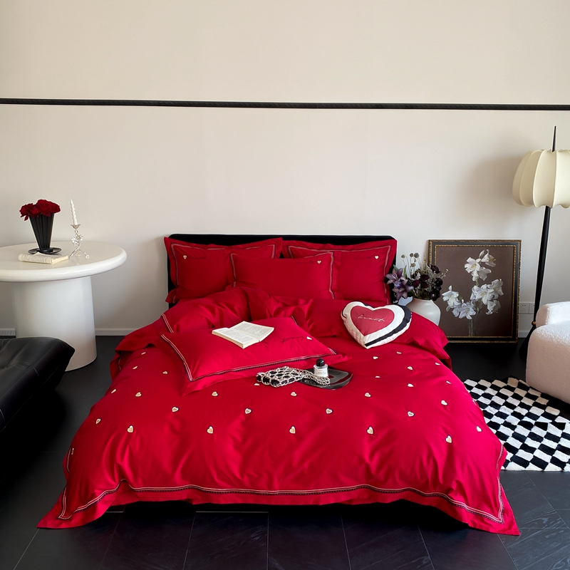 馨蕊 2024新款100S高奢简约长绒棉四件套-棉小爱心 棉小爱心-酒红