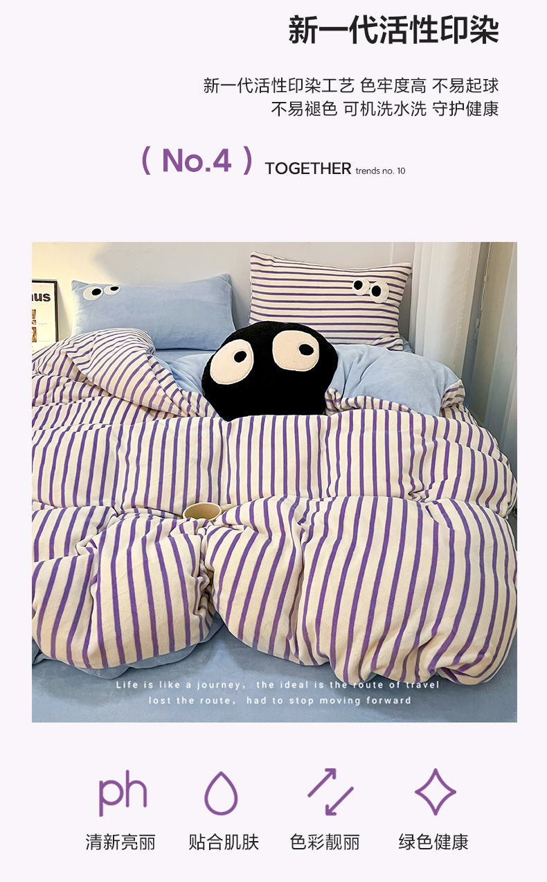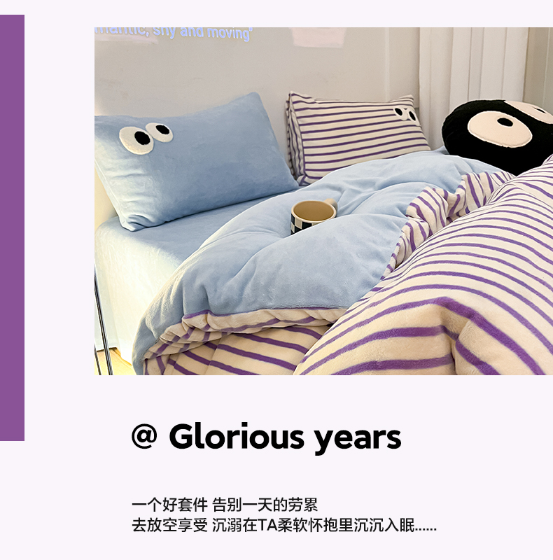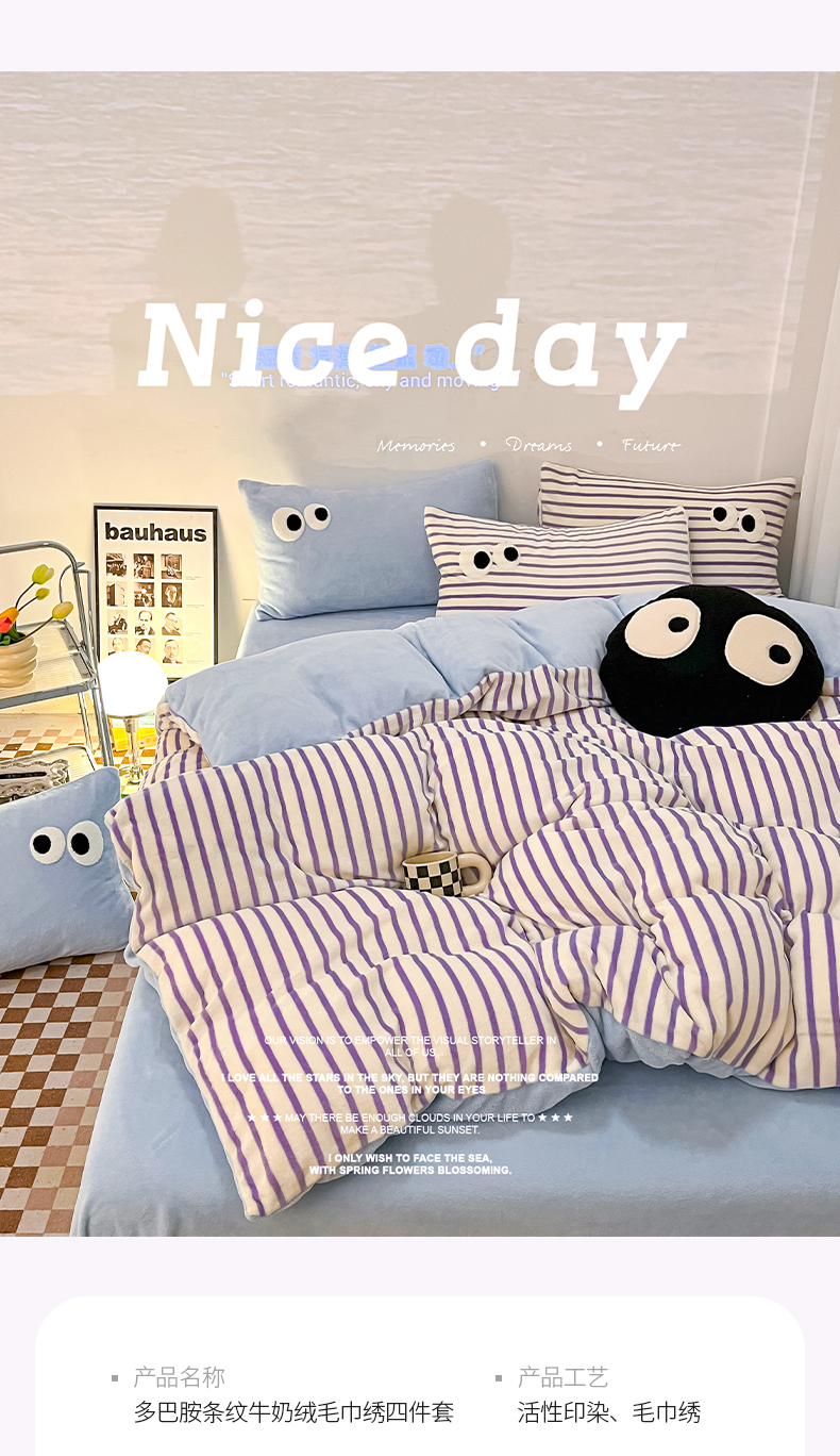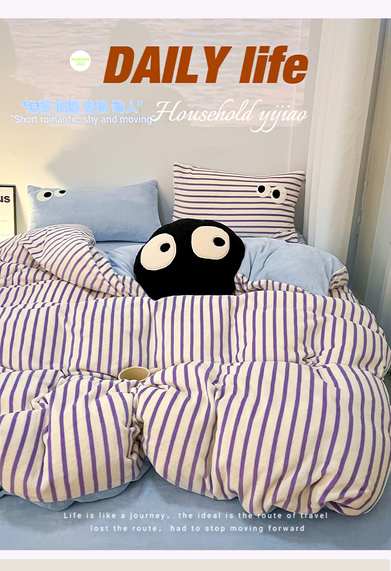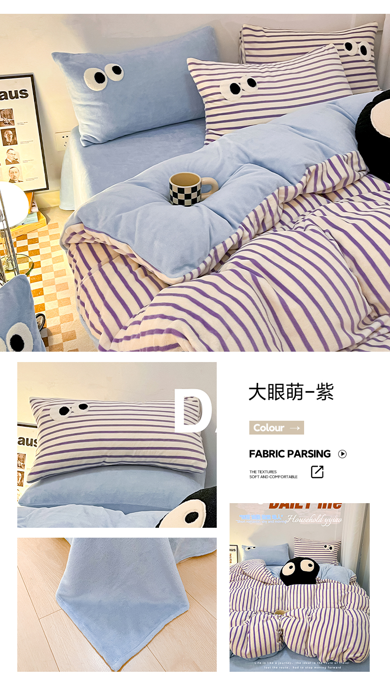 商品名称:如一 2024新款大眼萌条纹牛奶绒四件套 大眼萌-紫
