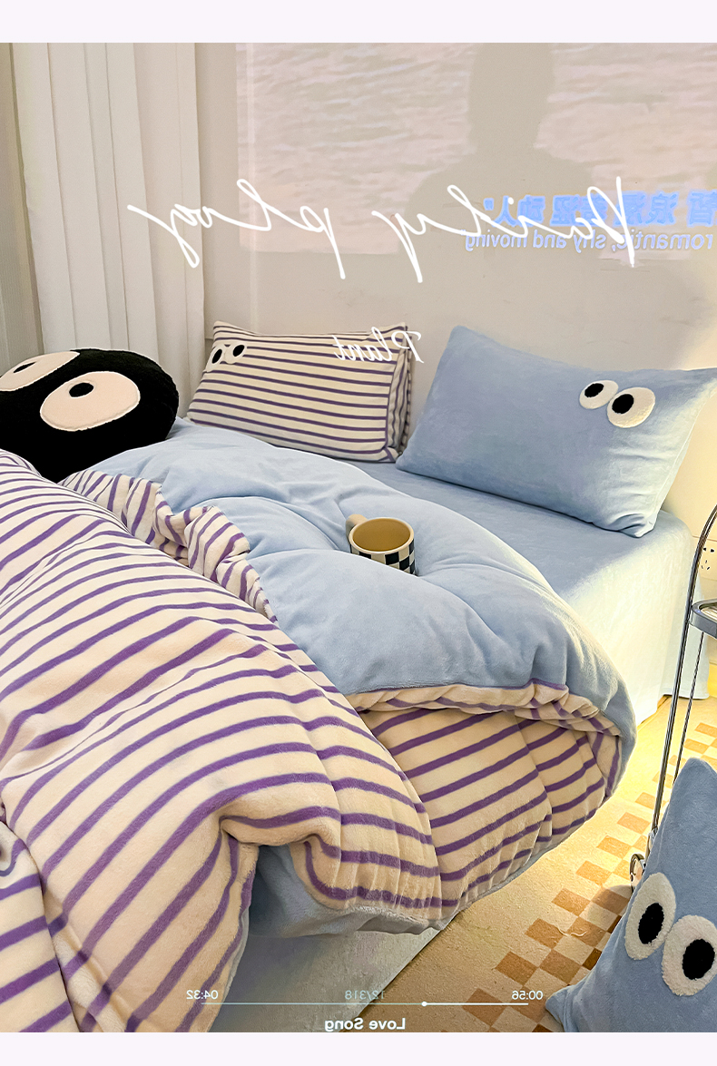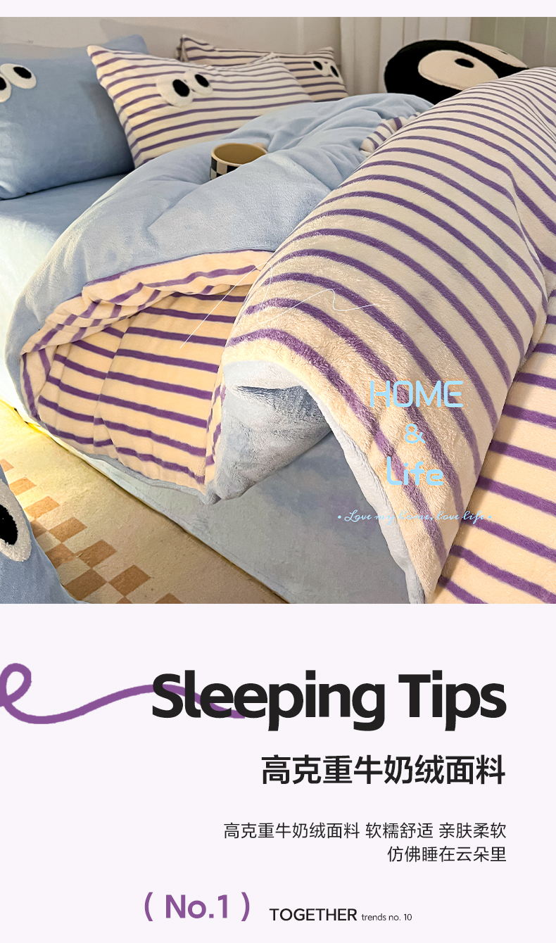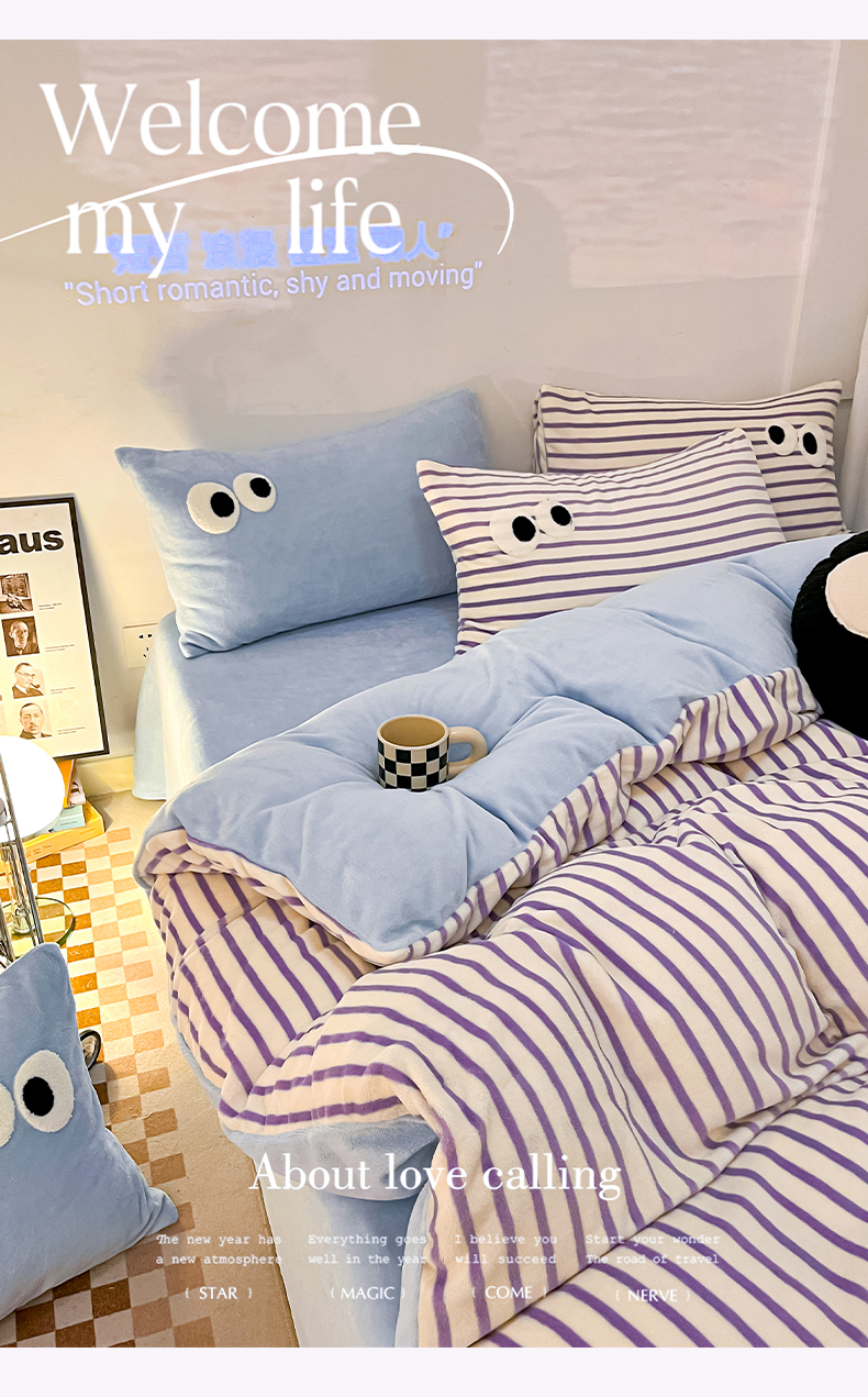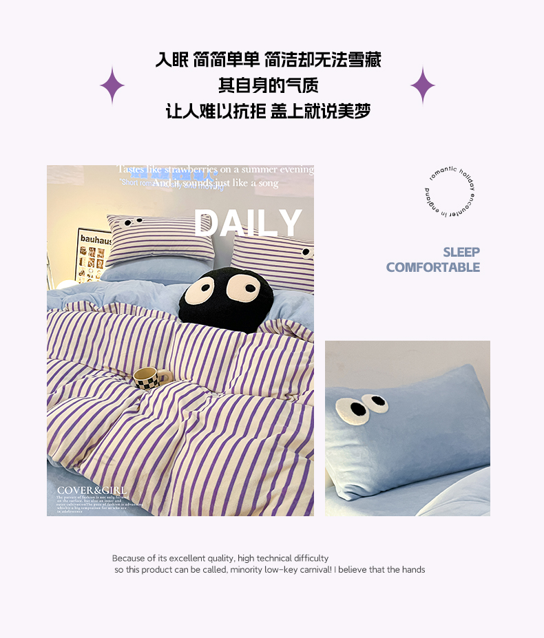 商品名称:如一 2024新款大眼萌条纹牛奶绒四件套 大眼萌-紫