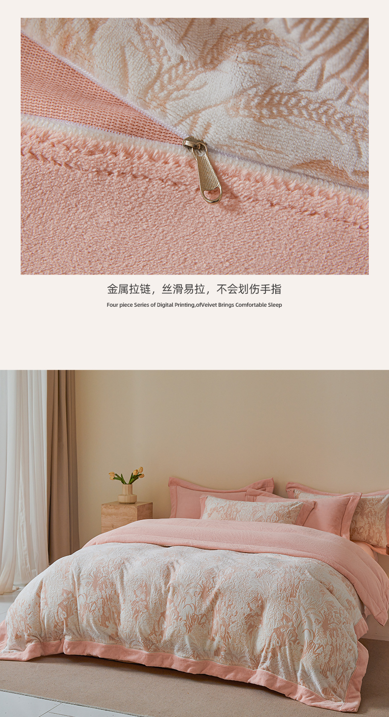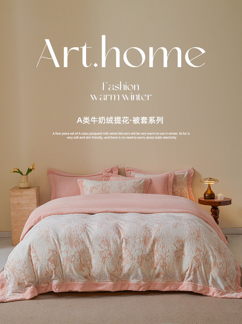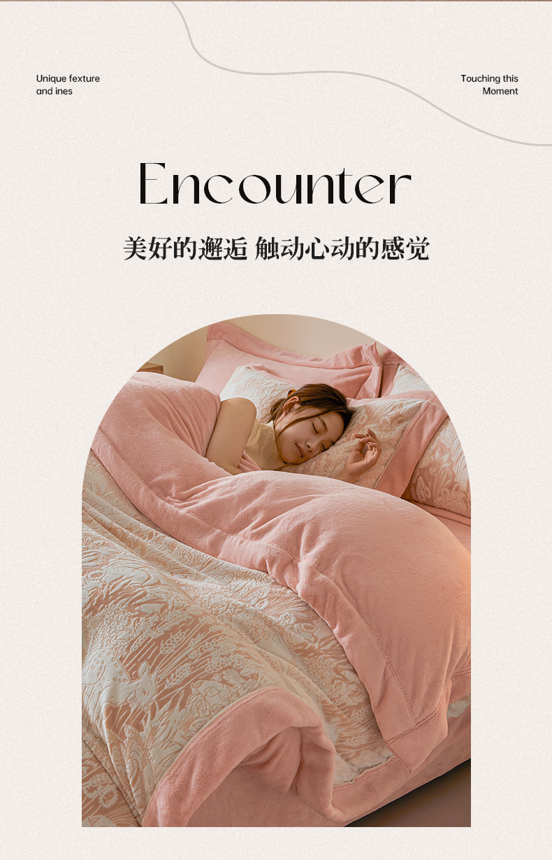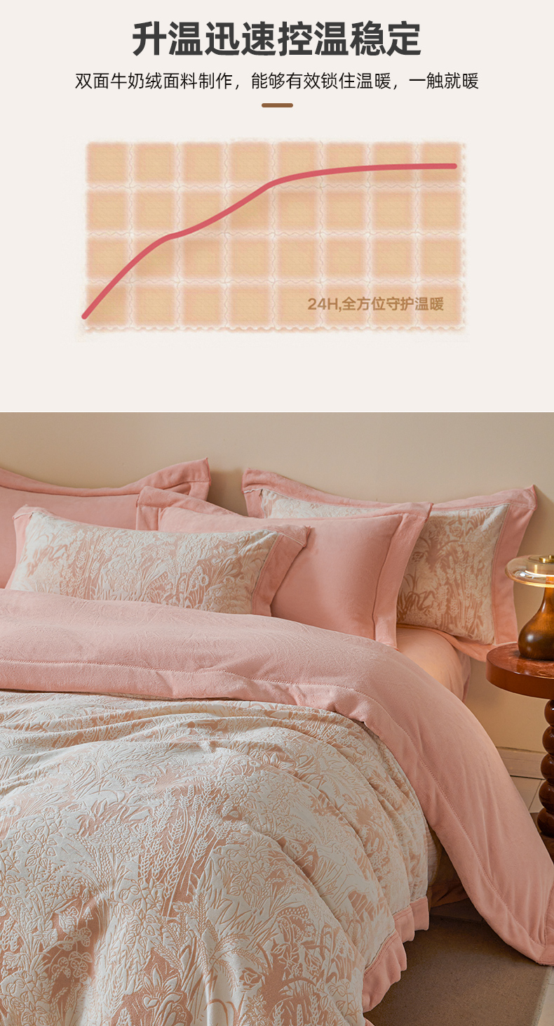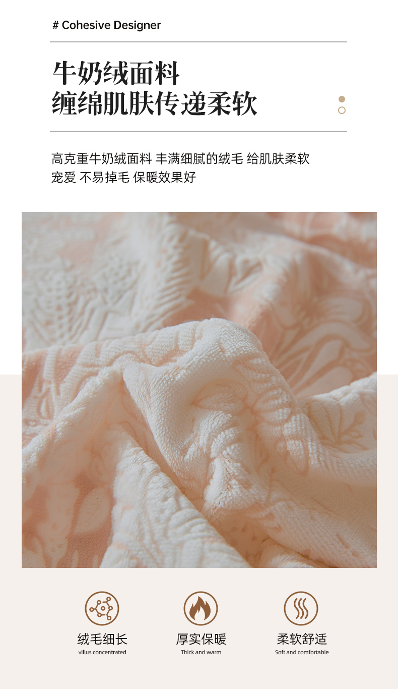 商品名称:全季家居 2024新款A类高克重5D立体浮雕宽边牛奶绒加厚保暖被套单件 海棠花开-粉