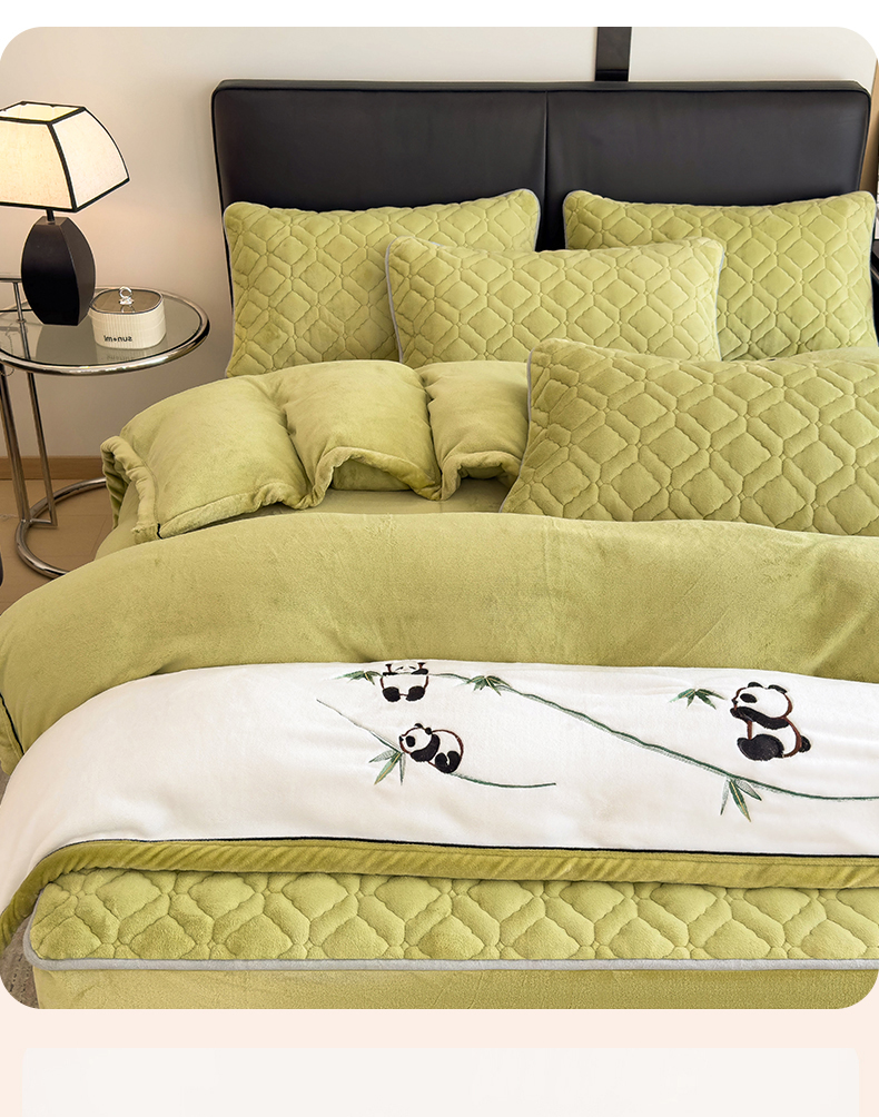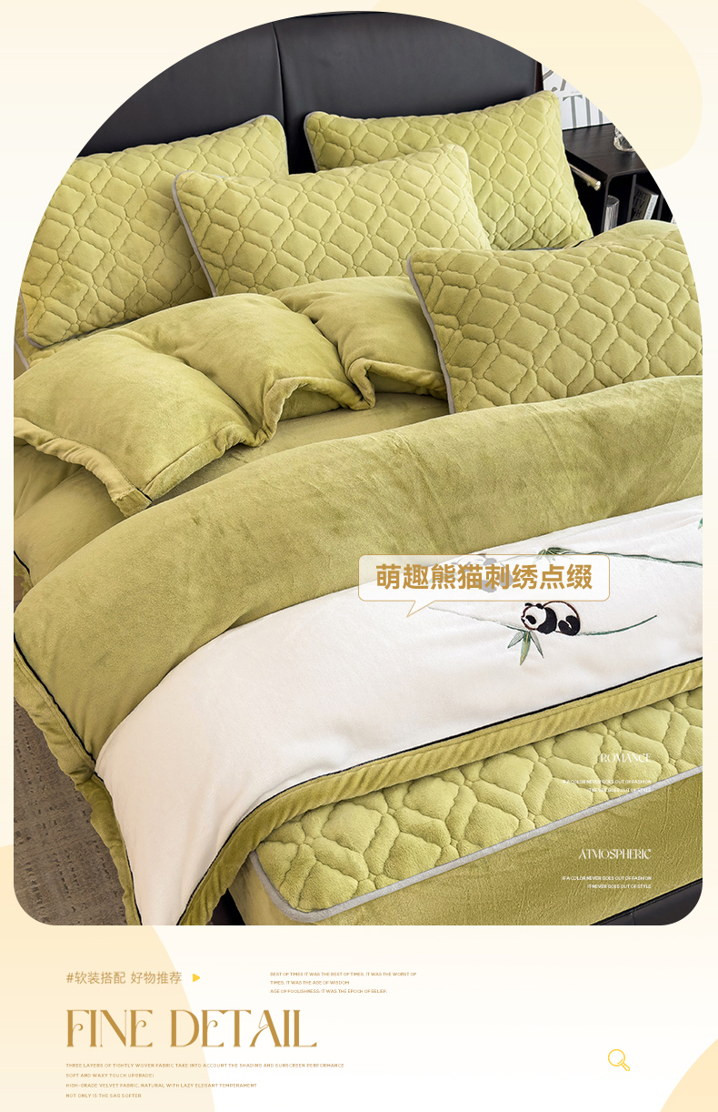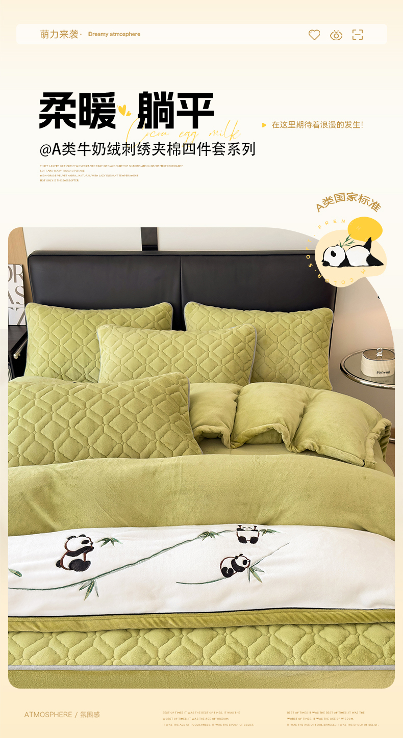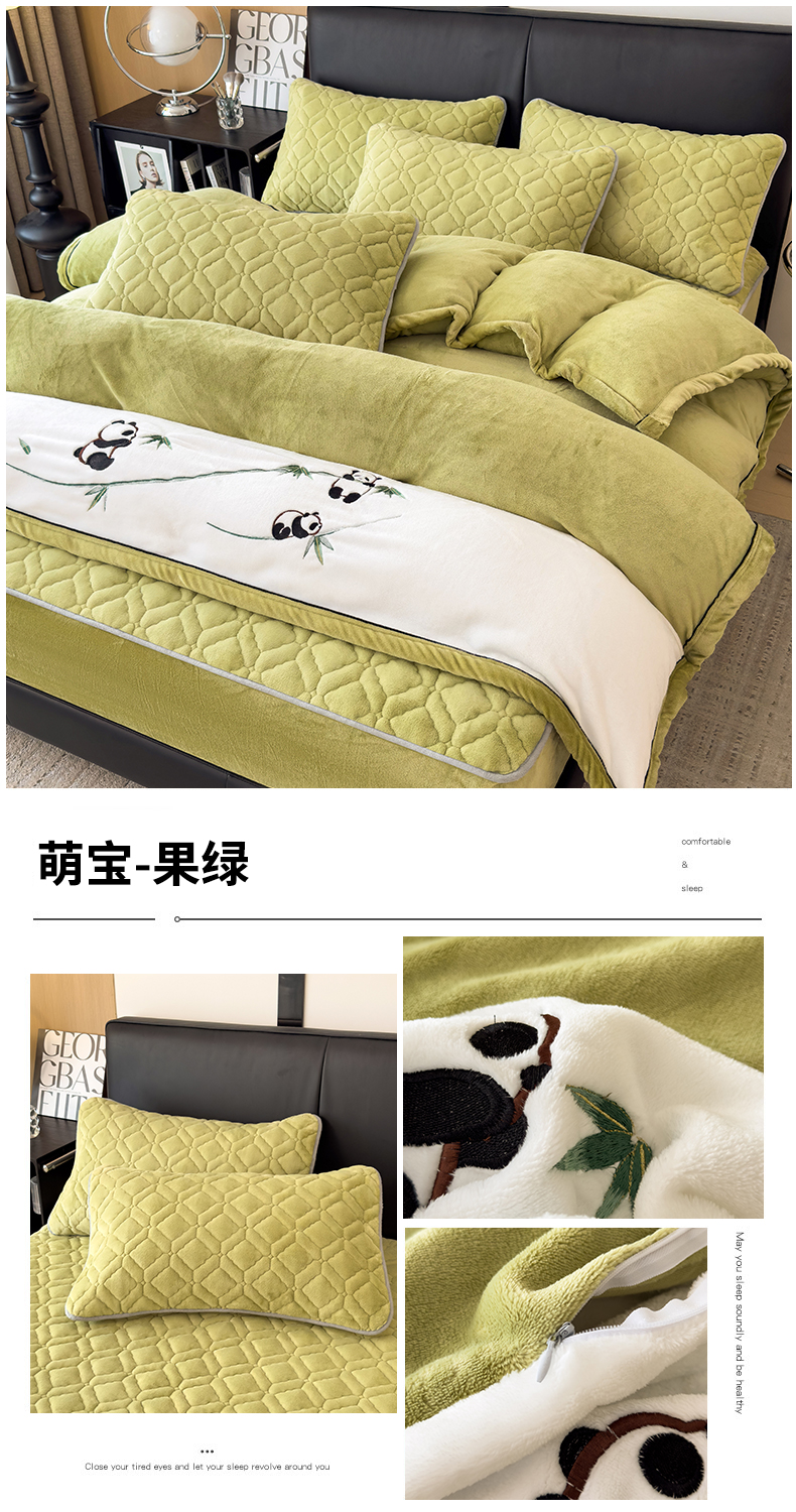 当前位置: 91家纺网 > 商品网购 > 床品套件 > 四件套 > 牛奶绒四件套 > 2024新款A类牛奶绒熊猫刺绣夹棉床笠款四件套 萌宝-果绿