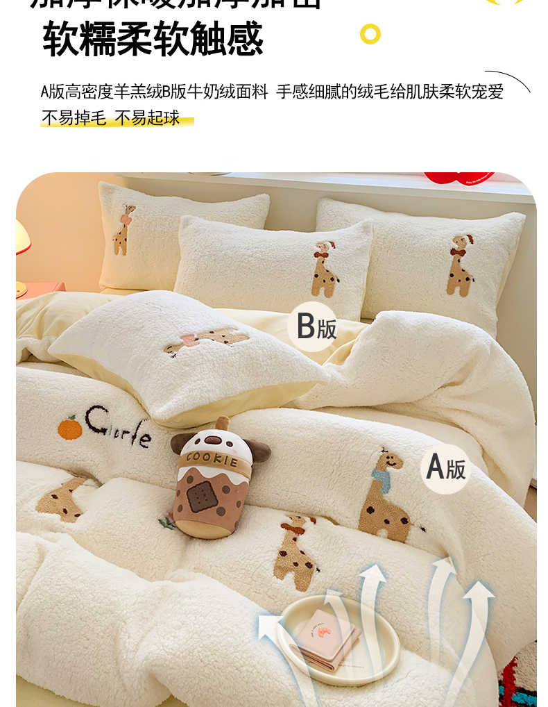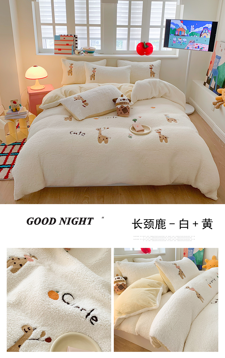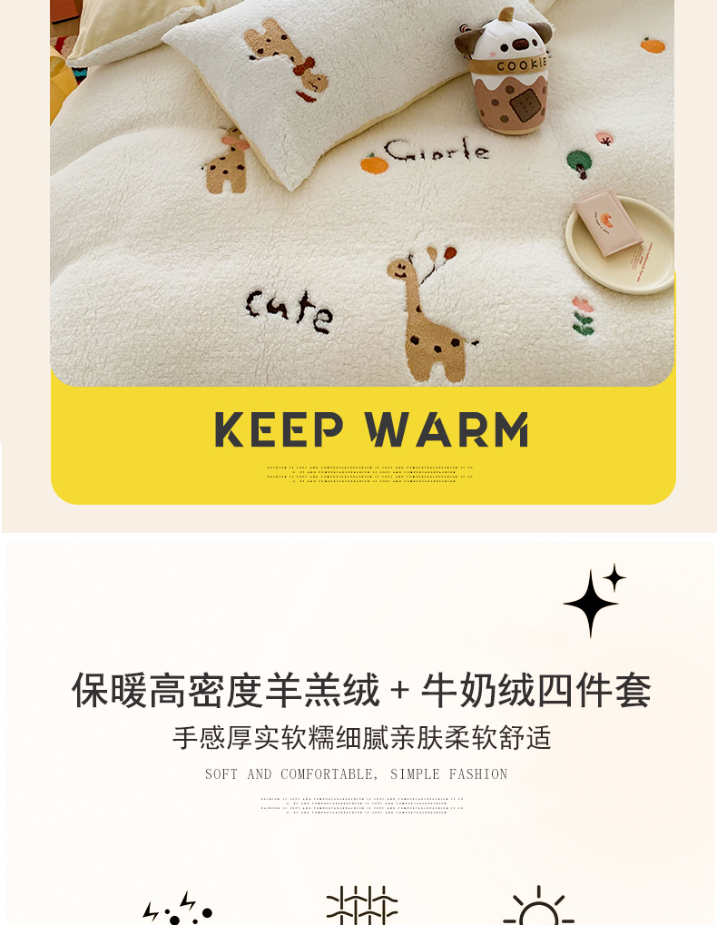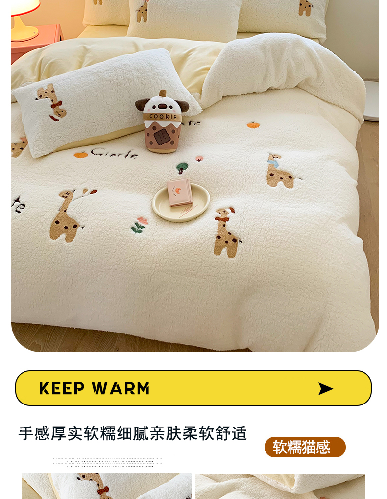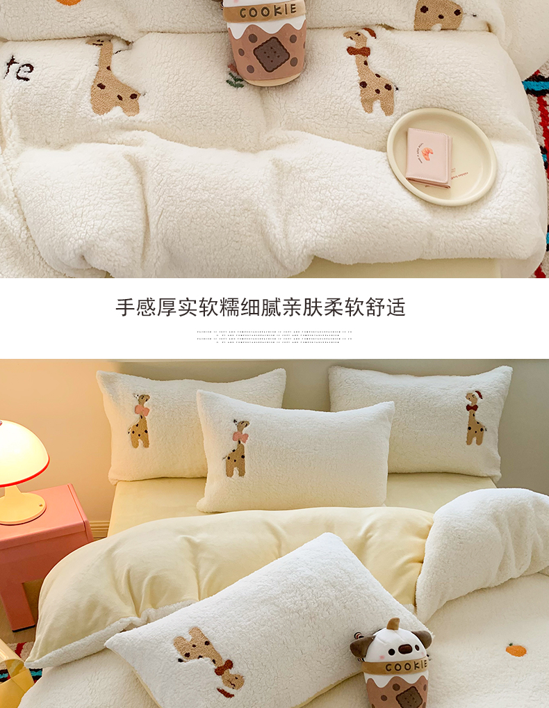 商品名称:2025新款高克重加厚羊羔绒牛奶绒四件套 长颈鹿白黄