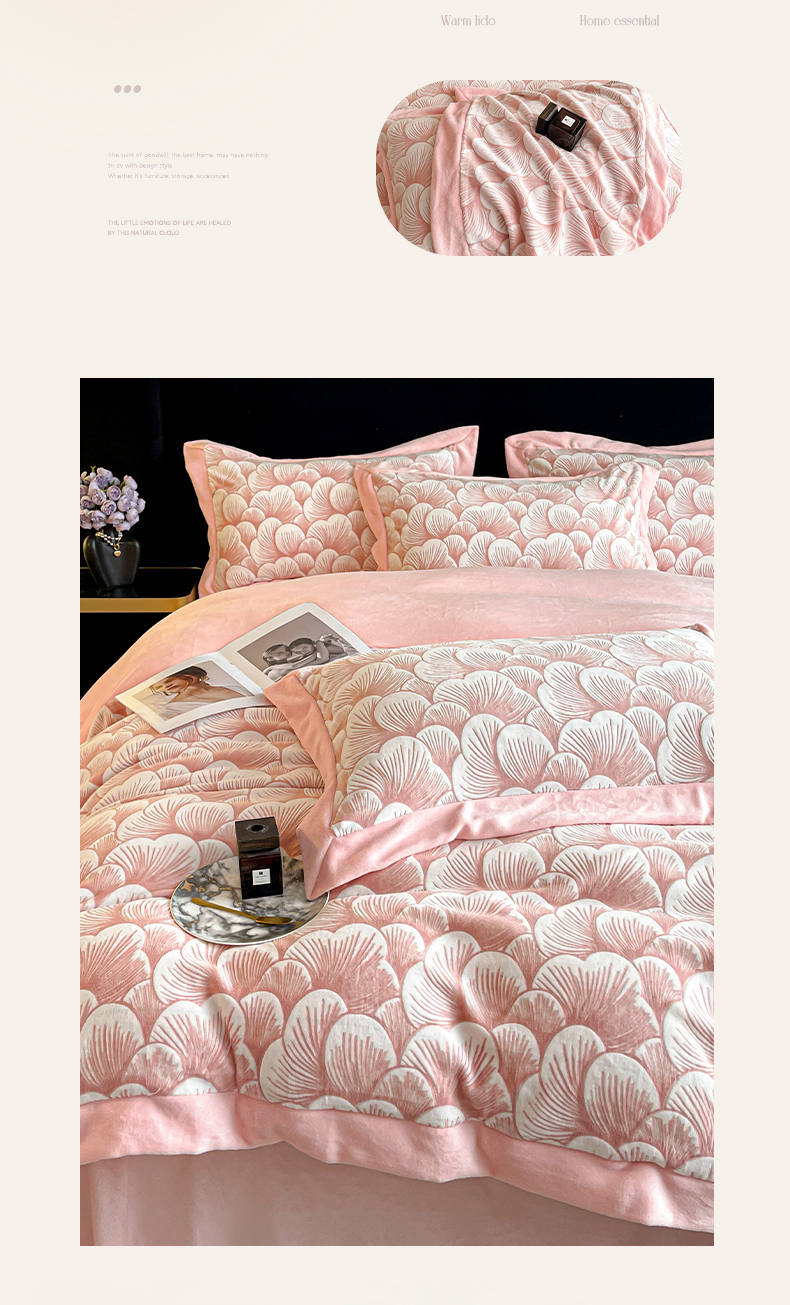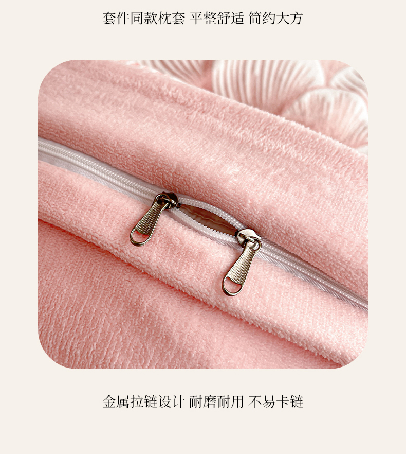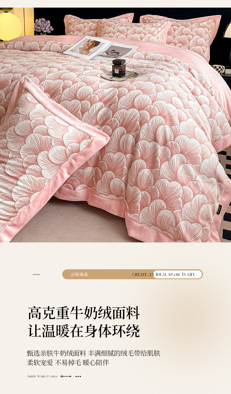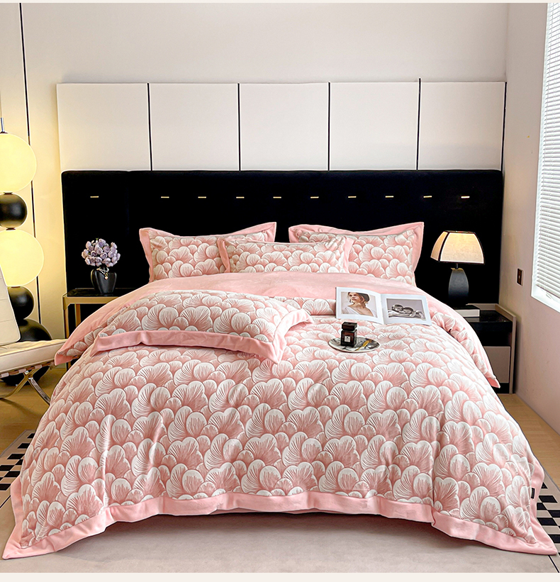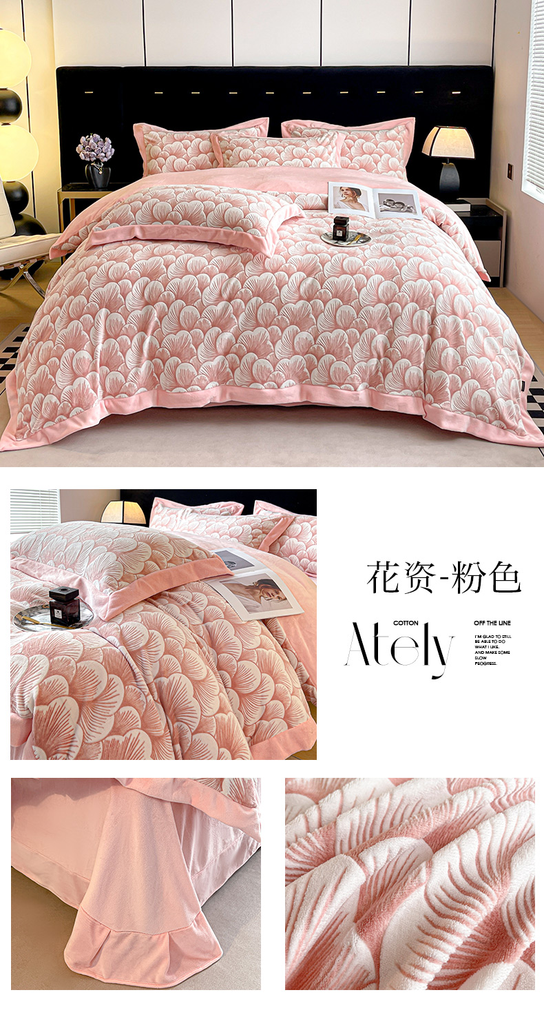 商品名称:芷卧 2025新款高克重A类全拼角立体雕花绒牛奶绒四件套 花资-粉色