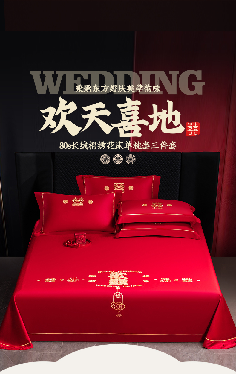 千禧家纺 2024新款长绒棉绣花婚庆三件套 欢天喜地